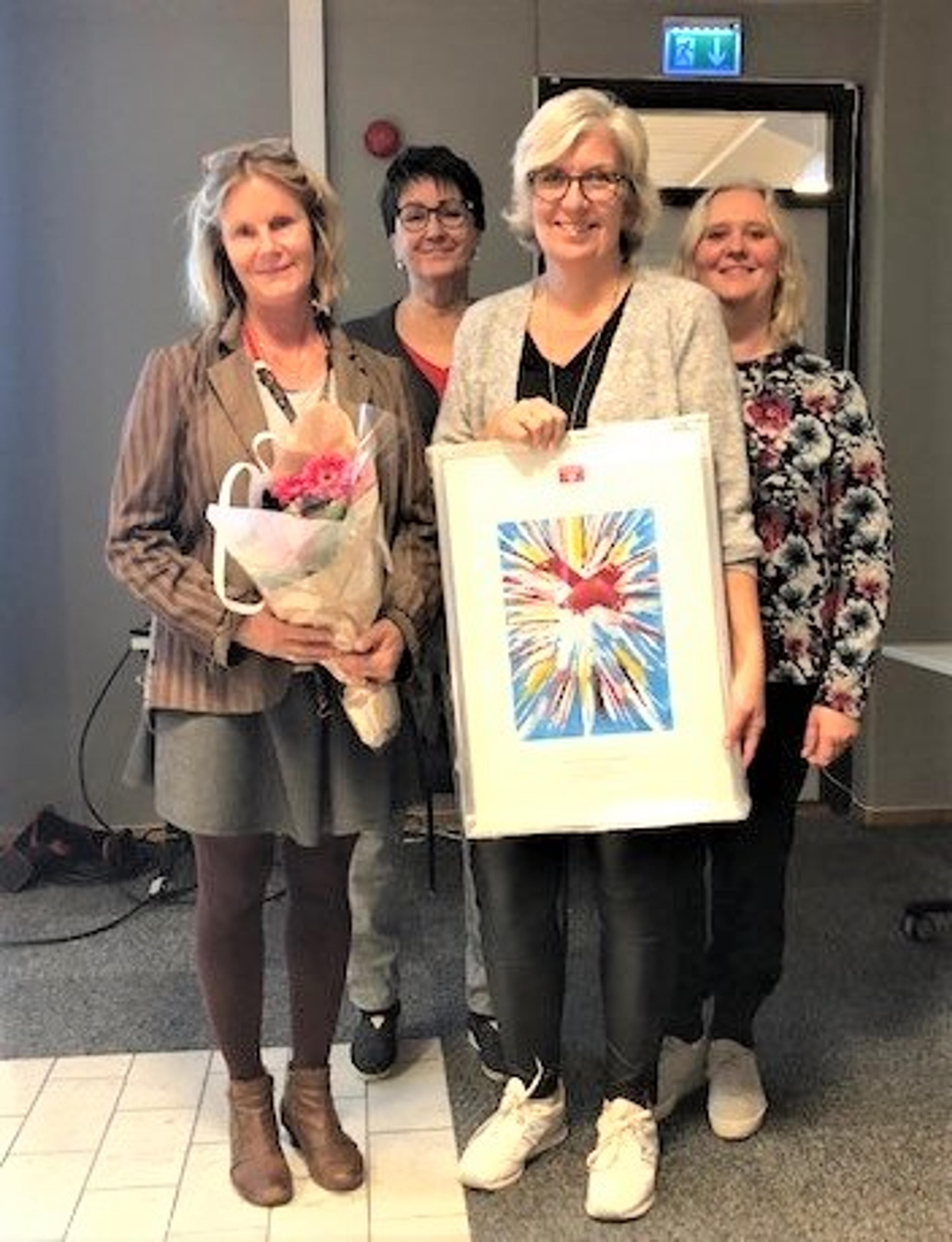 SANGGLAD GJENG: Fra venstre kulturkoordinator Gro Hansen, avdelingsleder Anita Skjeggerød, og kulturkontakt Sidsel Solberg. Bak på bildet ser vi Nasjonalforeningens fylkesleder i Vestfold, Marit Thorvaldsen. Foto: Pressemelding.