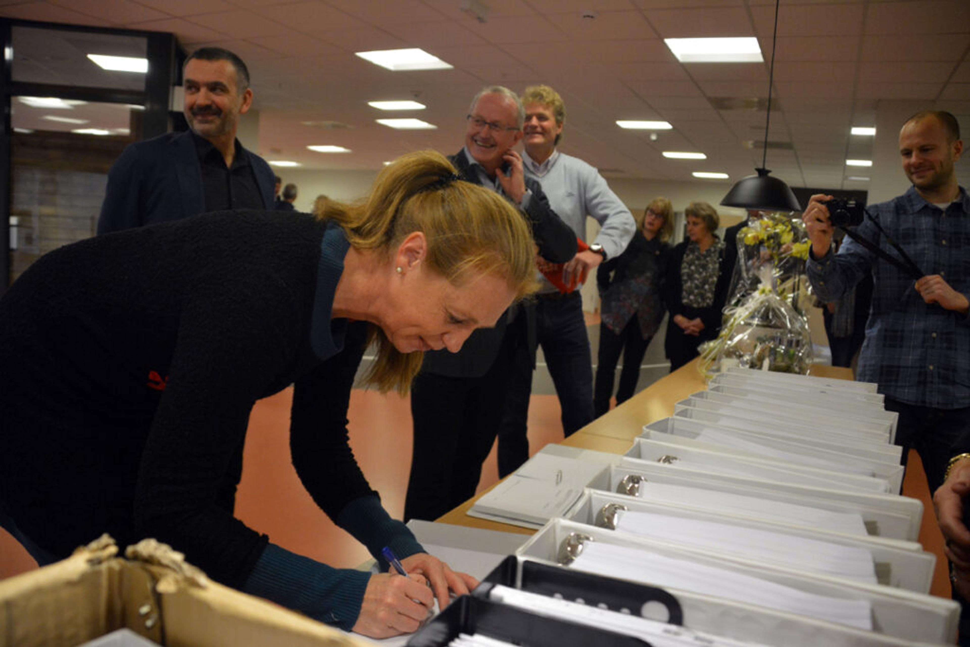 Overlevering av bygget, der det skal signeres dokumenter. Straks er bygget klart til bruk. Foto: Stian Ormestad, ReAvisa.