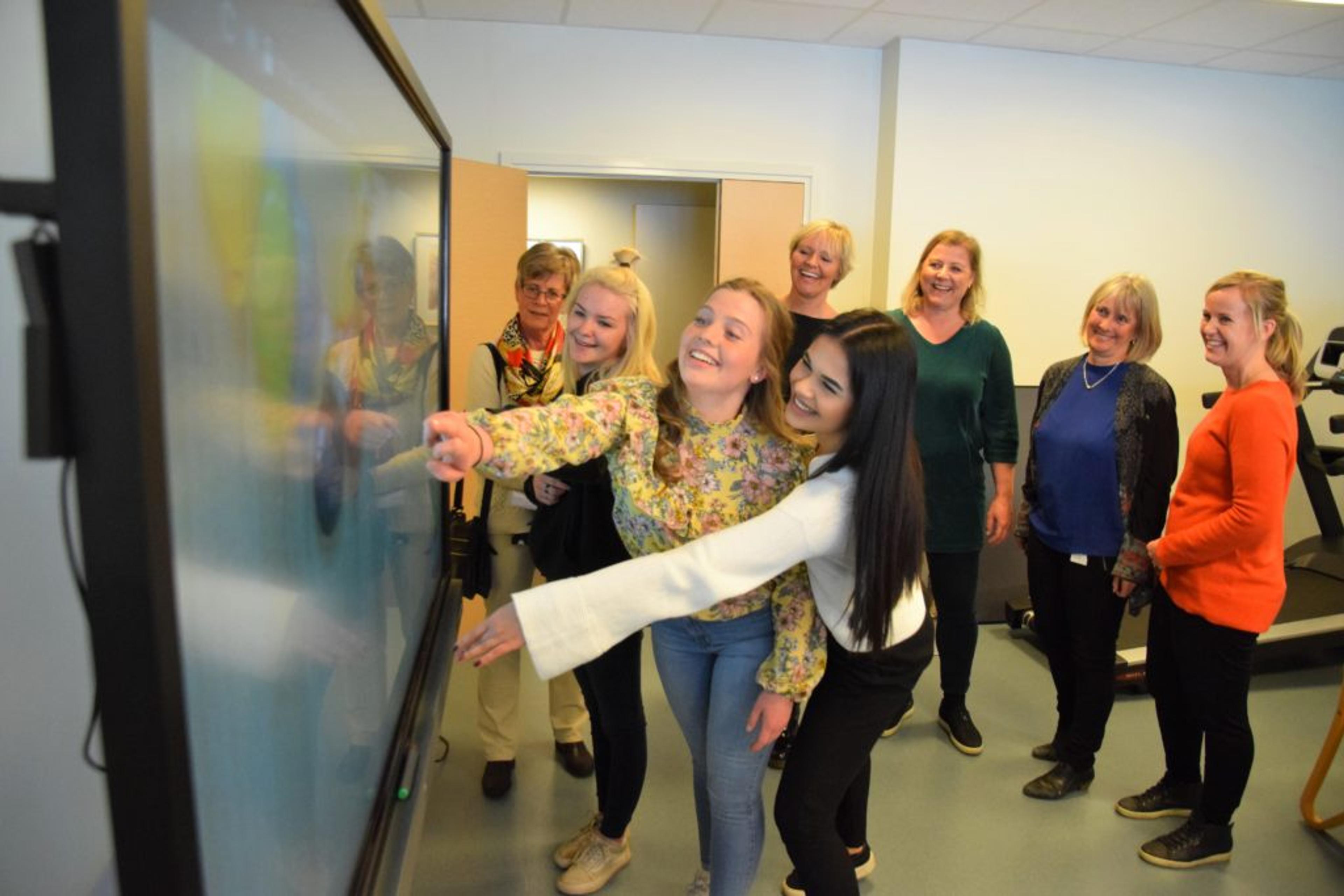 VELFERDSTEKNOLOGI: Re helsehus fylles sakte, men sikkert opp med ny velferdsteknologi. Som for eksempel denne skjermen som kan trene både koordinasjon og hjerne. Re VGS-elevene demonstrerer gjerne! Foto: Stian Ormestad.