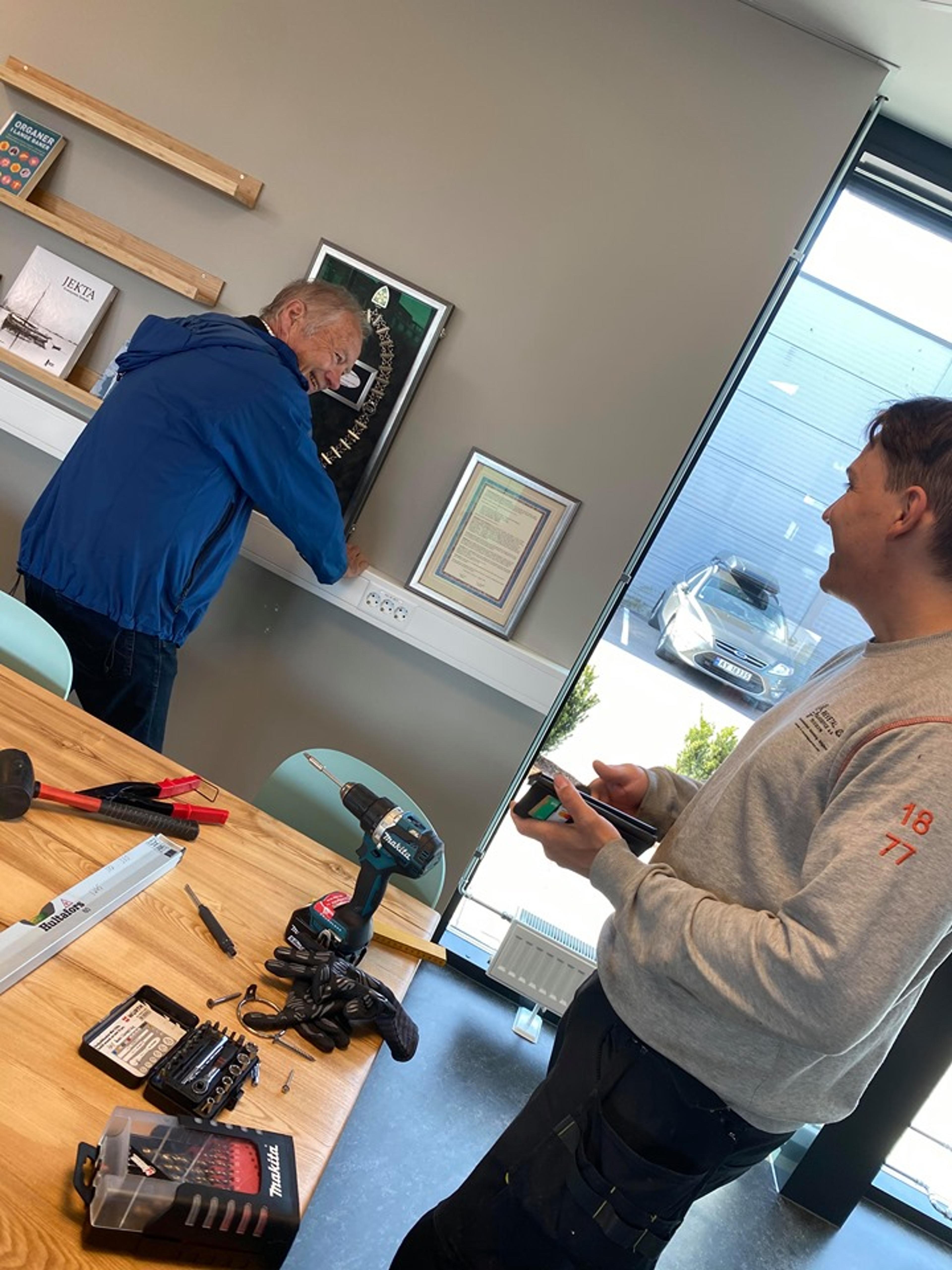 MONTERING: Revetal glasservice ved Andre Moss Pedersen har lagt ordførerkjedet i glass og ramme. Foto: Stian Ormestad.
