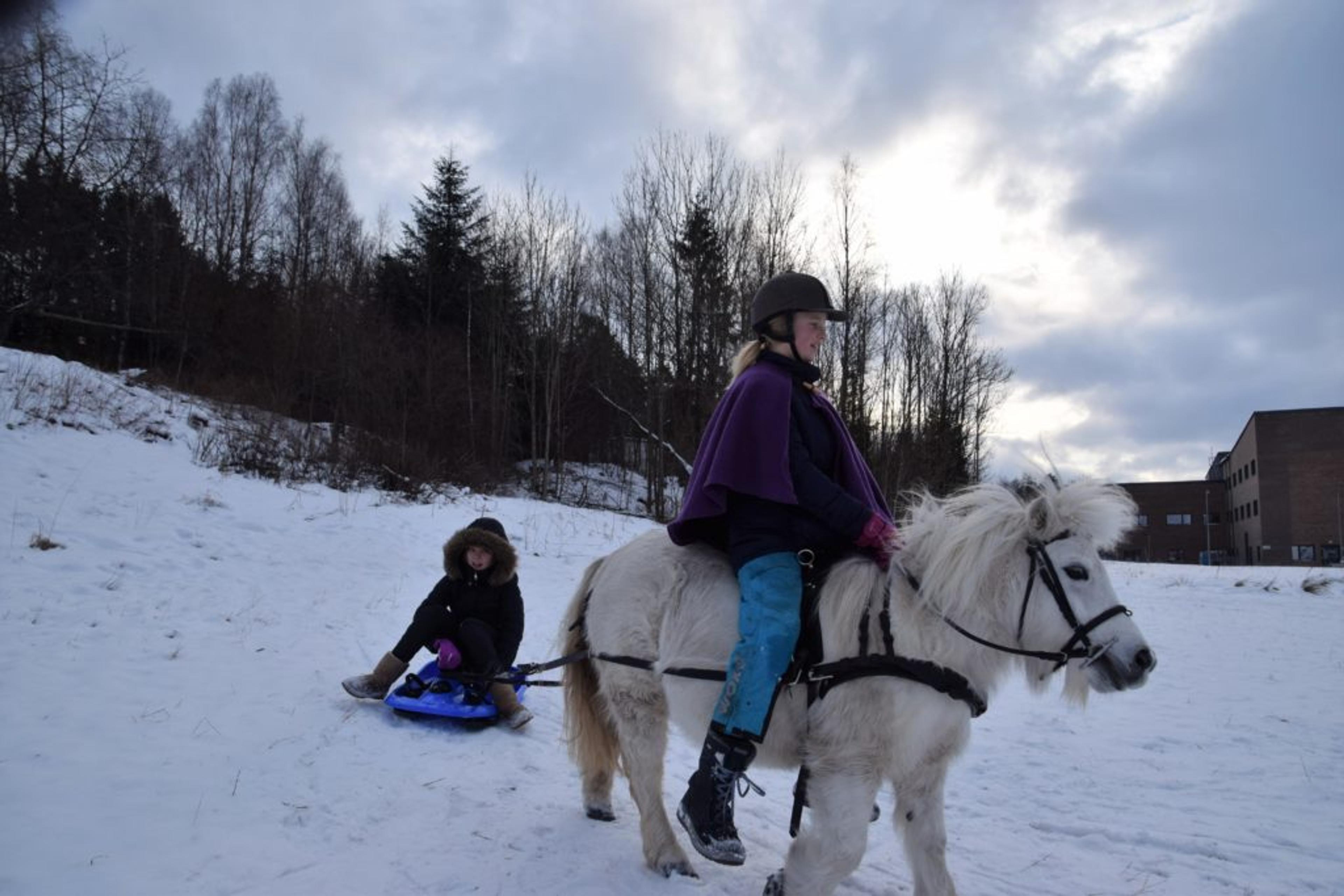 NY AKTIVITETSSTASJON: Antonea Lovise Husemoen (12) rir shetlandsponnien Sol (20) med akebrett etter. Her sitter Andrine Olsen Kaale (15) på brettet. Foto: Stian Ormestad.
