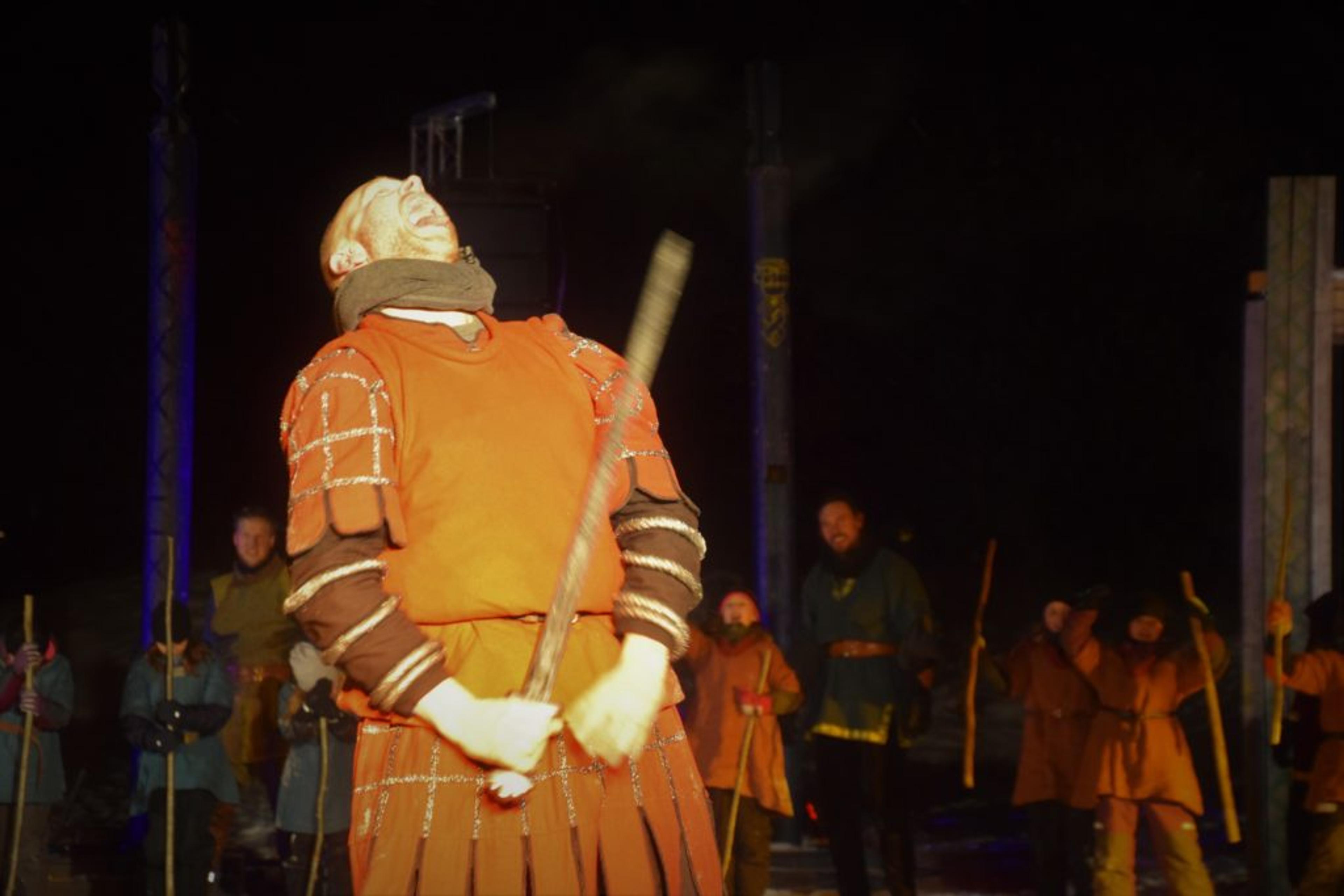 SEIERHERRE: Kåre Sivertsen som Erling Skakke slikker sitt sverd etter seieren over Sigurd Jarl i slaget på Re i 1163. Jubileumsforestillingen «Det stjernene så» vises fredag og lørdag kveld. Foto: Stian Ormestad.