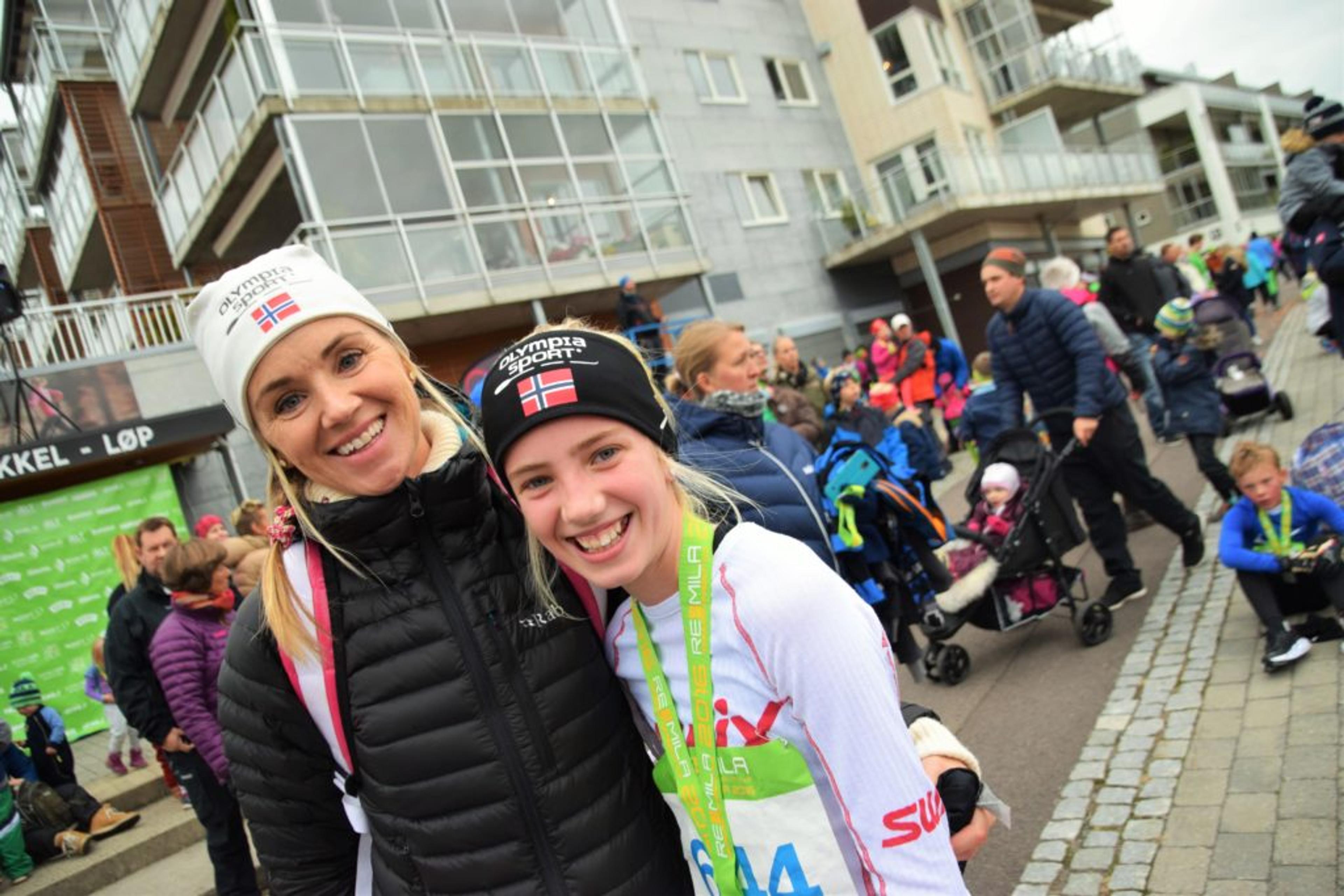 FIN PREMIE: Familien Vedvik kommer hver høst for å hente ved for vinteren – det er førstepremie i Re-mila. Løpefamilien skryter både av veden, Re-mila og rammen rundt. Her ser vi mamma Trine Vedvik og yngstedatter Leona Vedvik etter målgang i fjor – i år stiller bare Leona til start for å forsvare løpefamiliens ære. Foto: Stian Ormestad.
