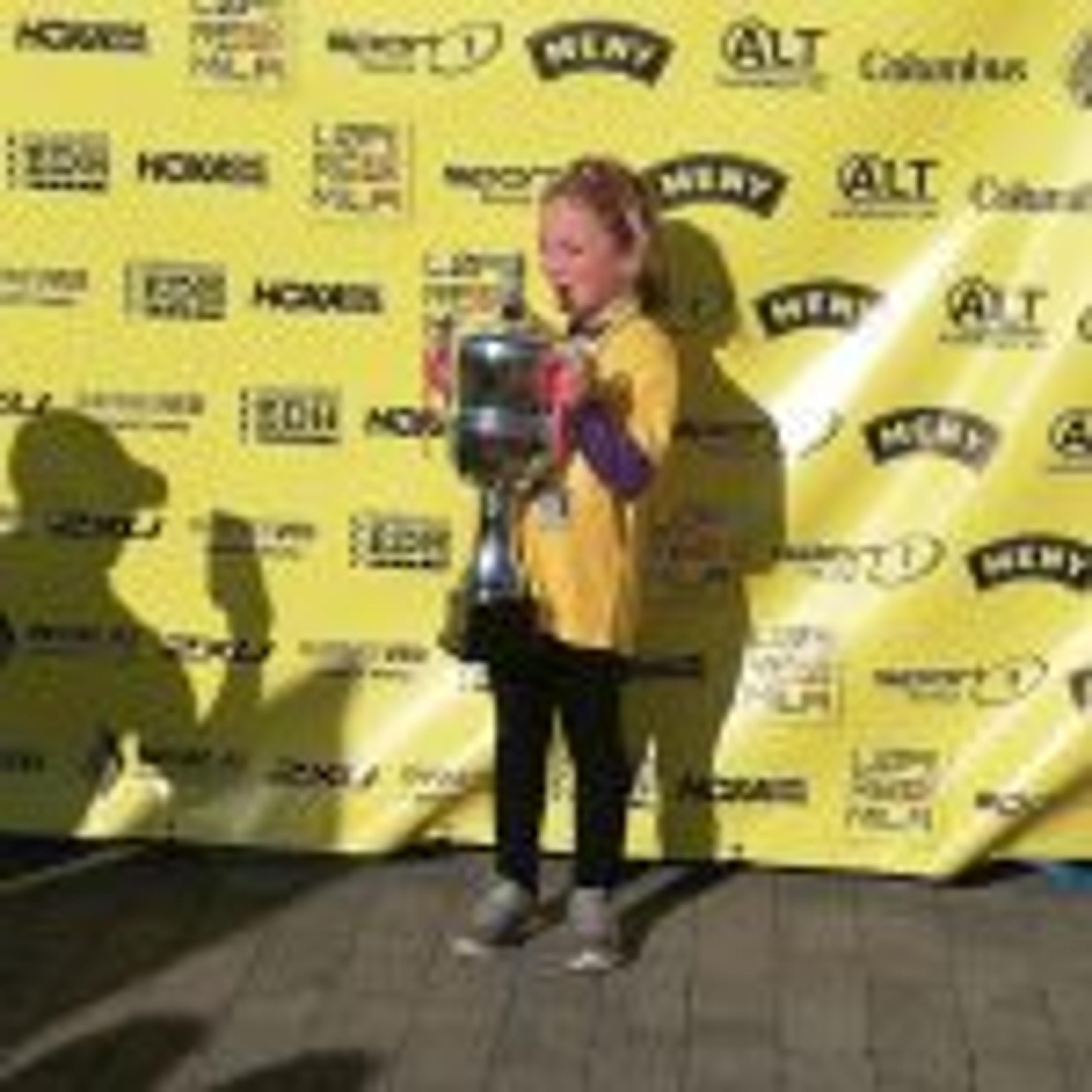 SKOLEVINNERE: Nora Ormestad Kjær tar i mot pokalen på vegne av 1. klasse ved Kirkevoll skole. Foto: Privat.