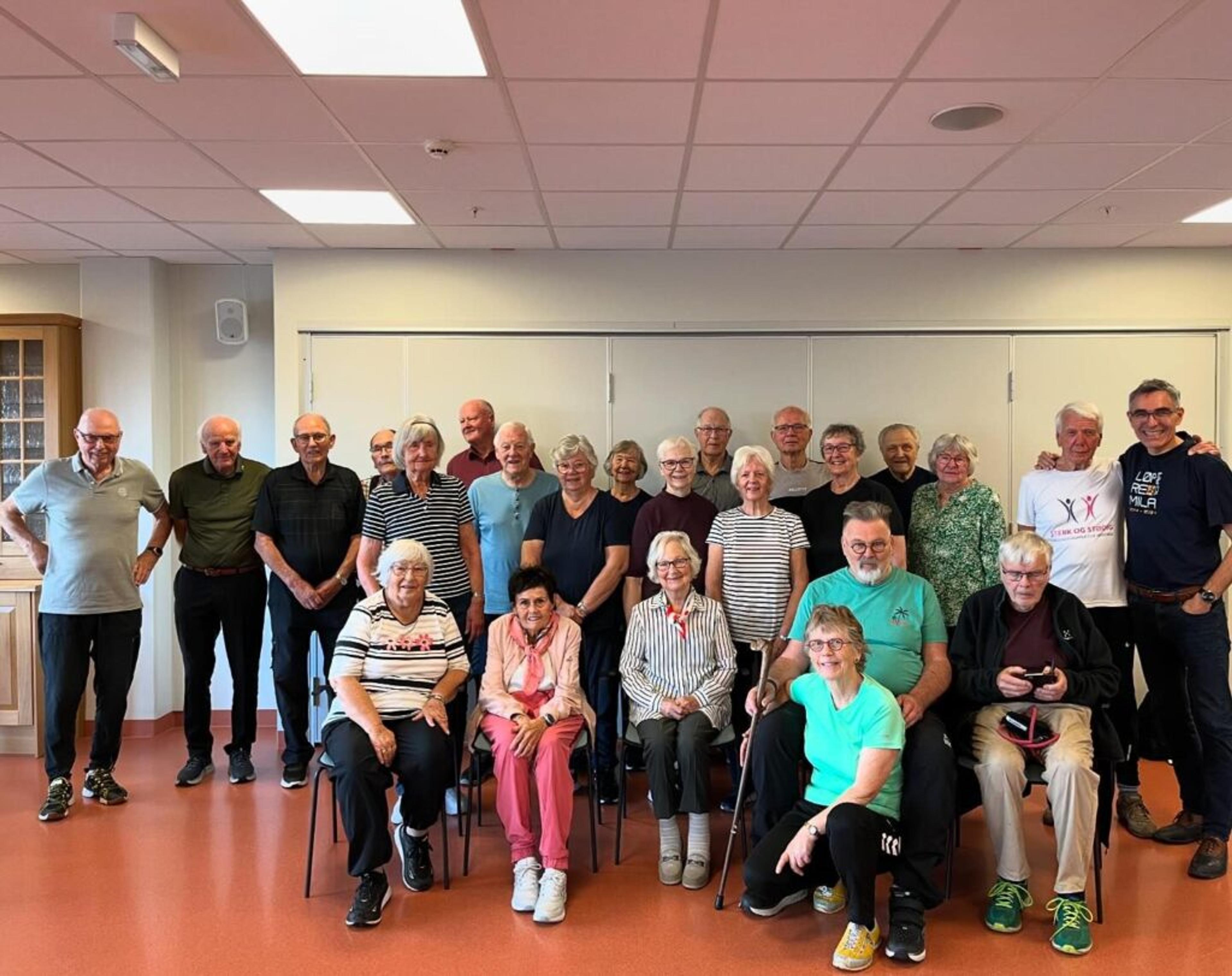 EGEN SENIORTRIM-KLASSE: Denne spreke gjengen møtes ukentlig på Re helsehus til trim leda av John Rognstad. De deltar i en egen seniortrim-klasse, med start rett over klokka 14.30. Kom og hei fram denne energiske gjengen, med eller uten rullator, til målstreken! Foto: Privat.