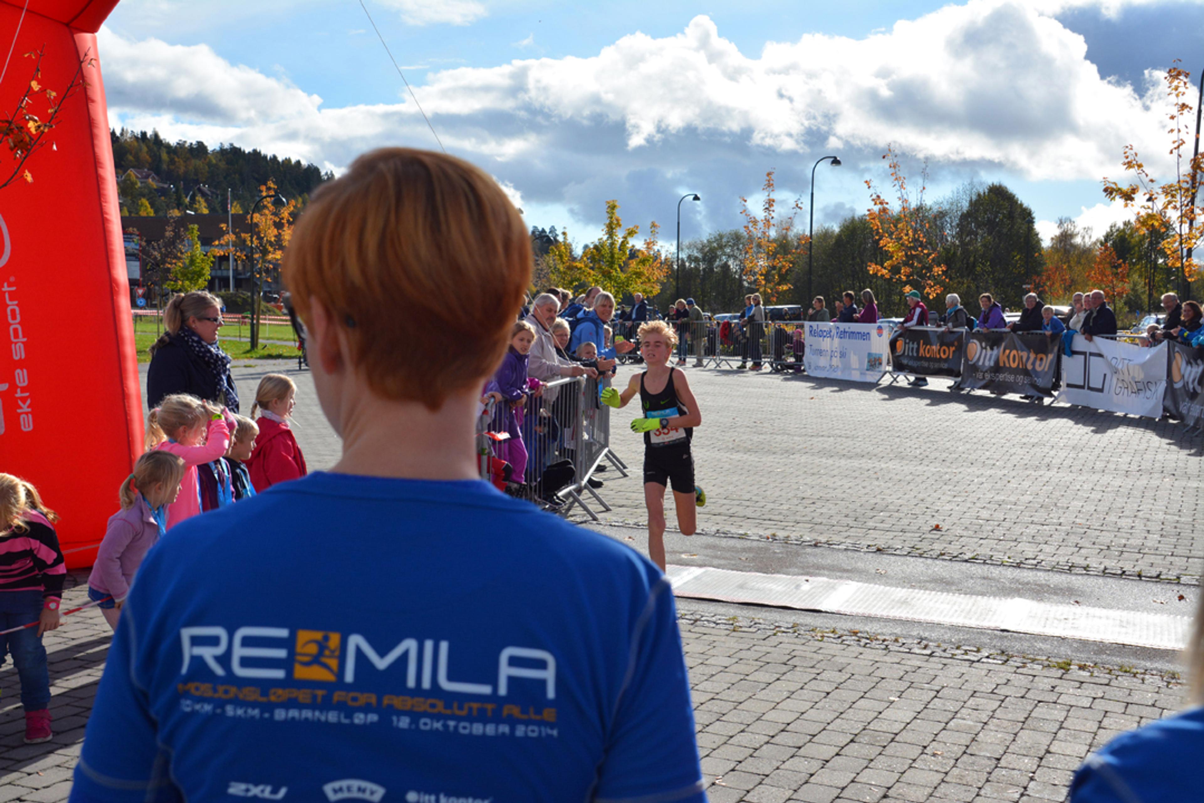 EN AV DE ALLER FØRSTE OVER MÅLSTREKEN: Bildet er fra den aller første Re-mila i 2014. Allerede den gang var det strålende høstsol over arrangementet, som det har vært i alle år – tross at Re-mila alltid er blitt arrangert godt utpå høstparten i oktober. – Heldig med været, nok en gang!, konkluderer Re-mila-generalen også søndag morgen 13. oktober 2024. Arkivfoto: Stian Ormestad, ReAvisa.