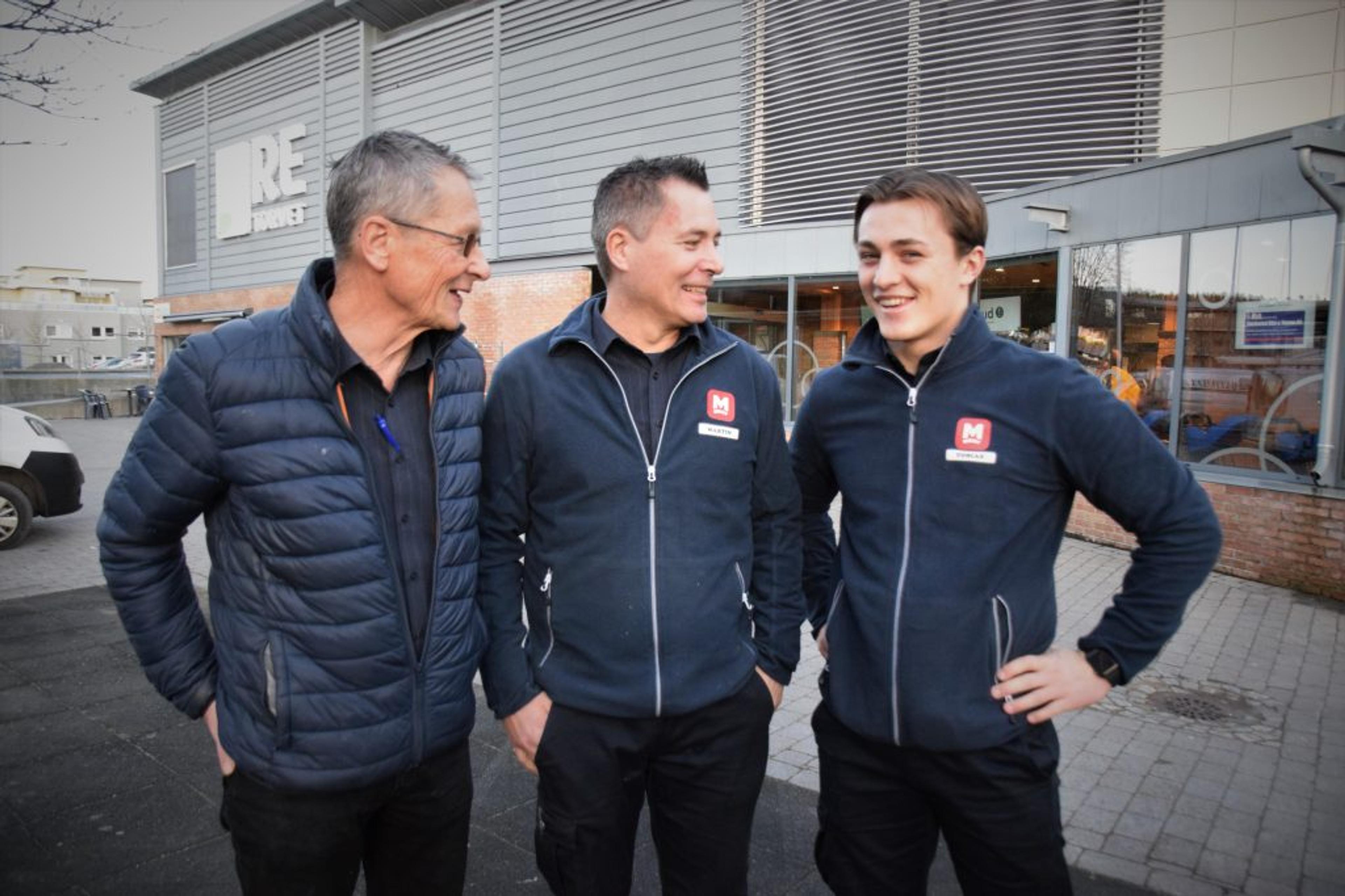 RE-PATRIOTER: Re-navnet består på Re-torvet. Der er alle tre generasjoner kjøpmenn på Revetal helt på linje, ved barnebarn Tobias Gran (21), pappa Martin Gran (47) og bestefar Sjur Gran (72). Foto: Stian Ormestad.