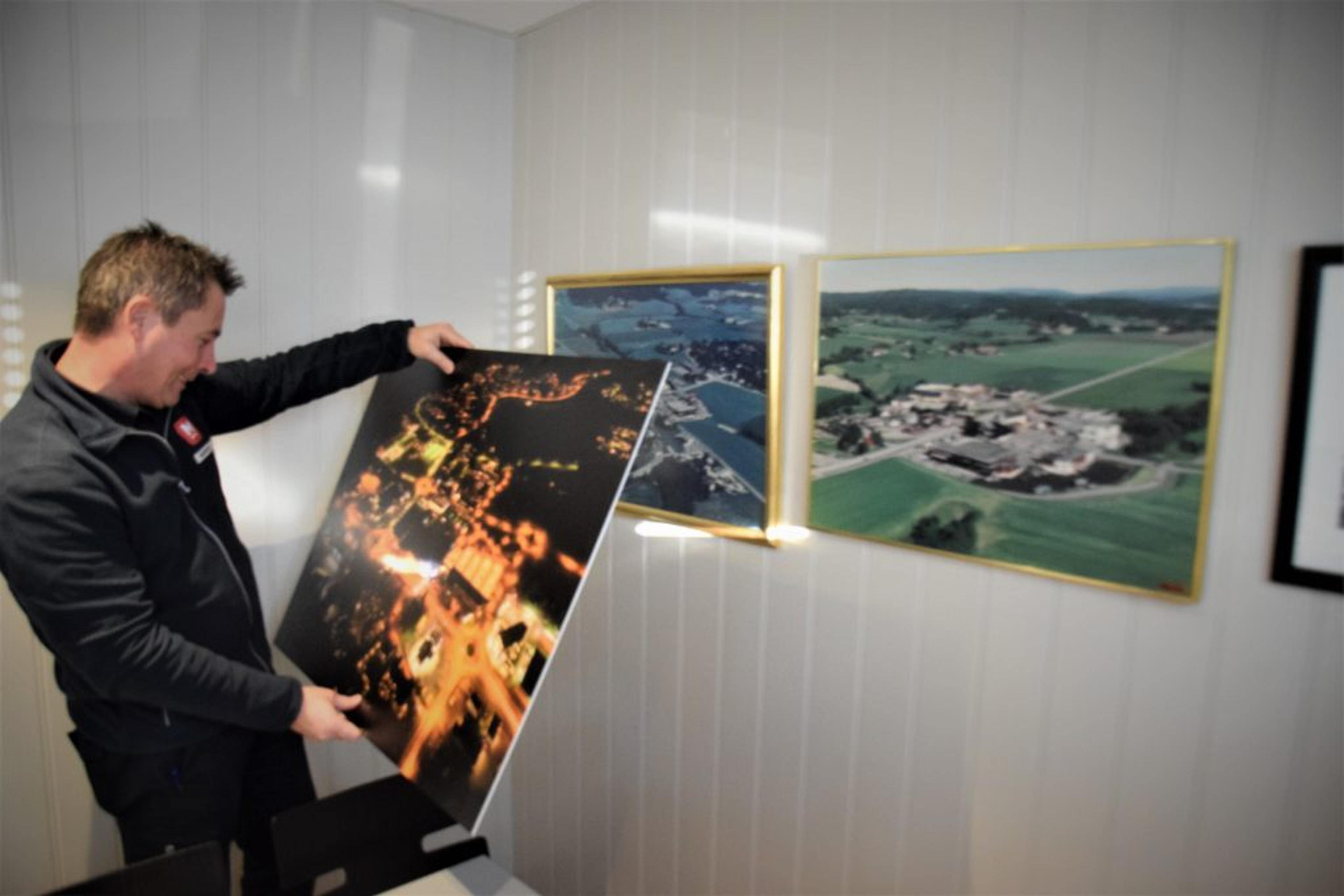 ENORM UTVIKLING: Martin henger opp det siste flyfoto over Revetal på spiserommet. Bildene viser en enorm utvikling gjennom drøyt hundre år og fire generasjoner kjøpmenn og sentrumsutviklere på Revetal. Foto: Stian Ormestad.