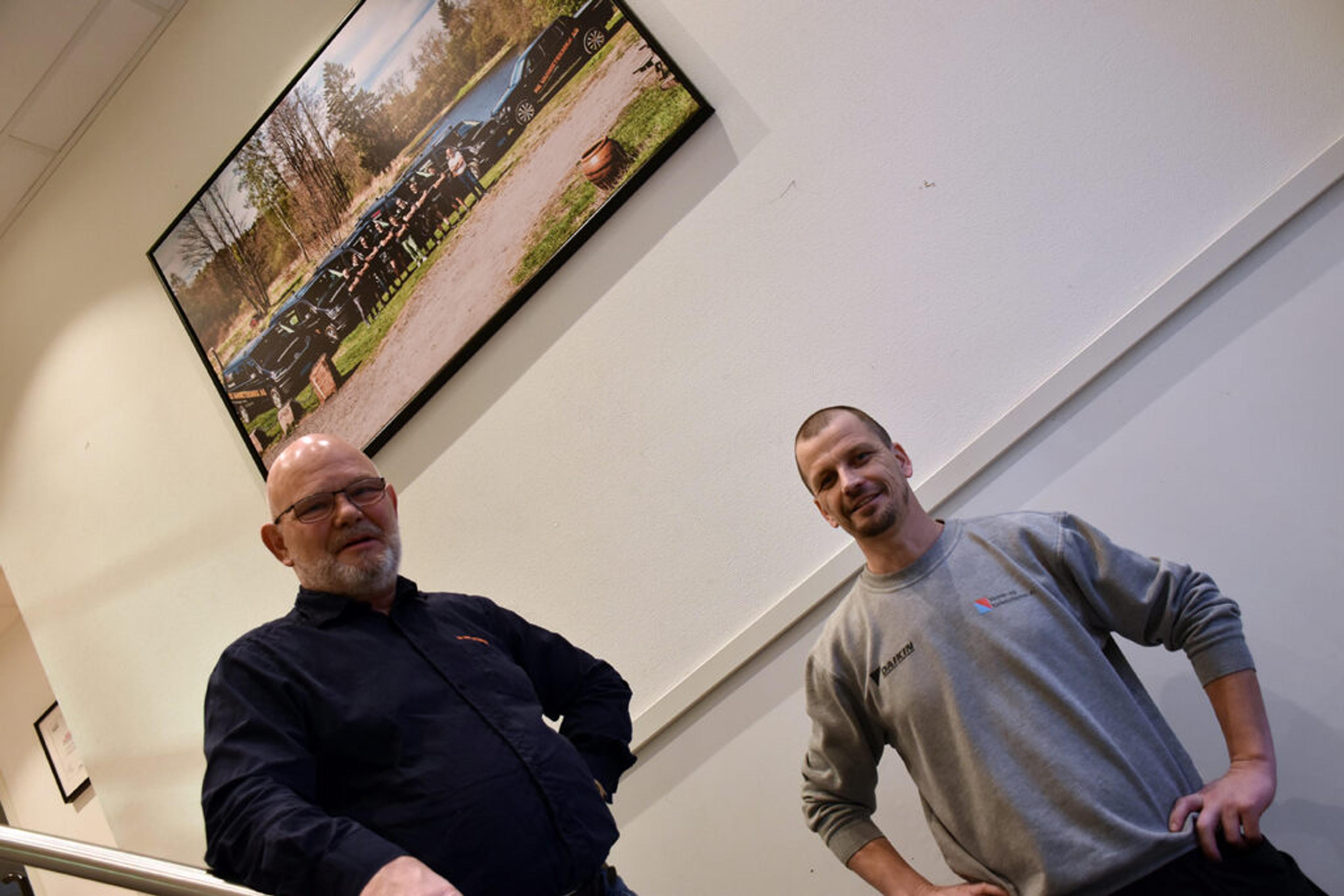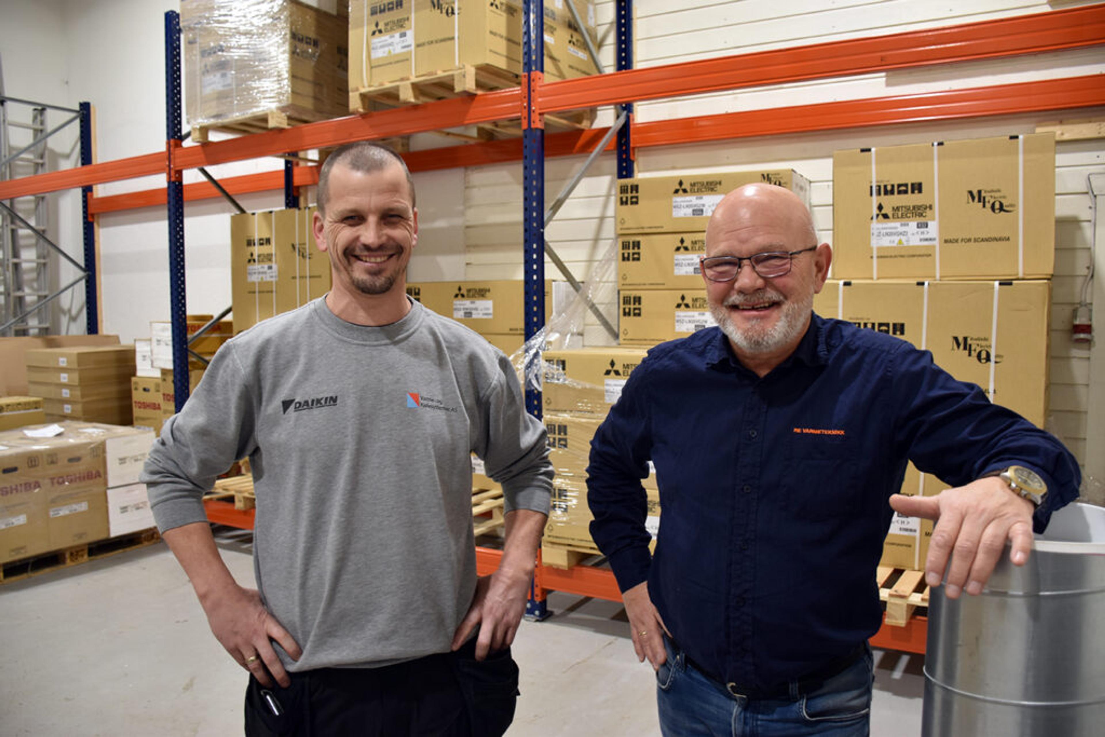 TRAPPER OPP – SAMMEN: De tidligere konkurrentene Carl Basberg (45), Varme- og kjølesystemer, og Øivind Tønnesen (67), Re varmeteknikk, slår sine krefter og ansatte og firma sammen. Foto: Stian Ormestad, ReAvisa.