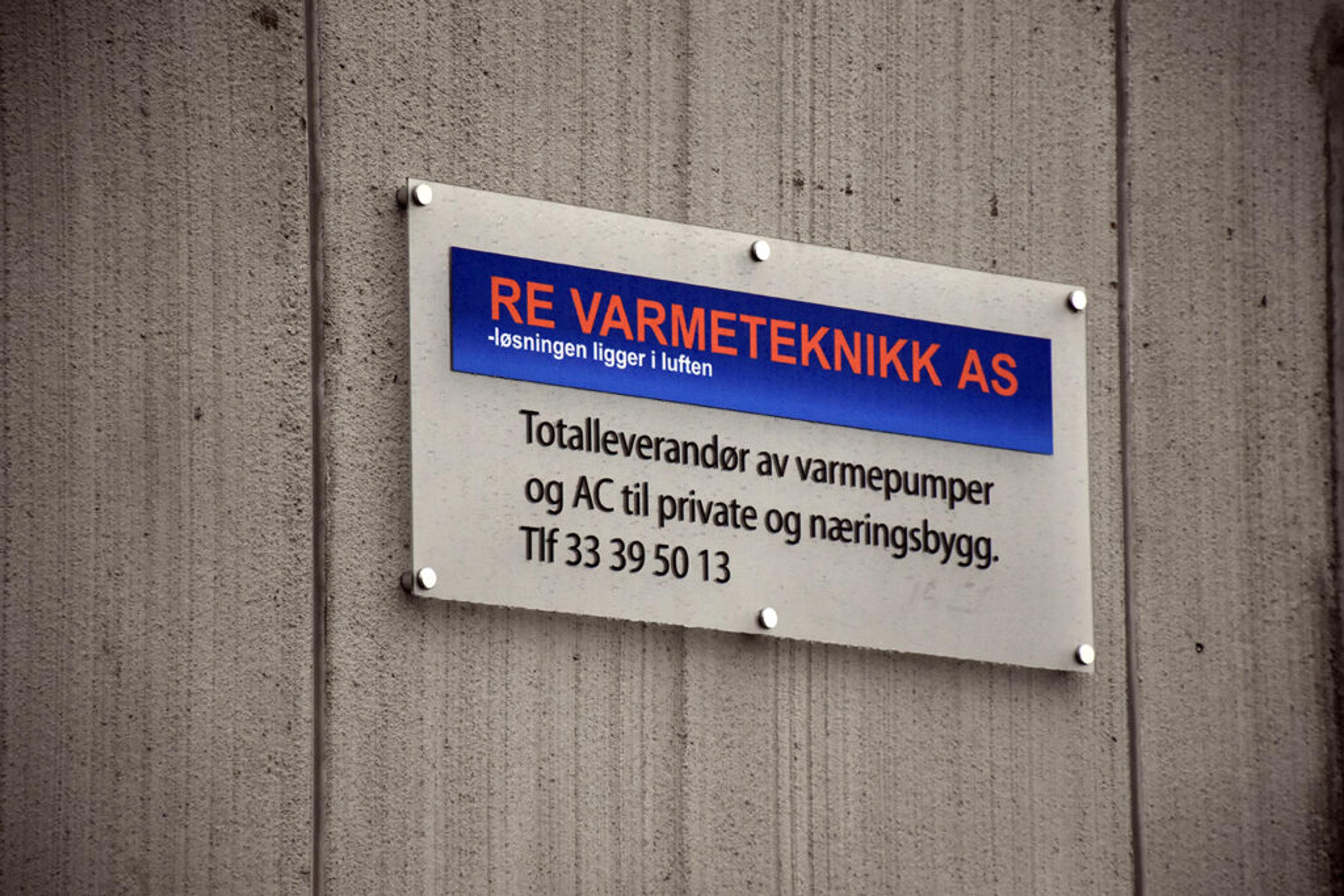 GÅR OVER I HISTORIEN: Re varmeteknikk-navnet eksisterer snart ikke lenger, og skiltene blir snart tatt ned fra veggen på dagens base for bedriften på Lundteigen i Re. Nytt navn blir Varme- og kuldesystemer AS, og adressen blir Borgeskogen. Foto: Stian Ormestad, ReAvisa.
