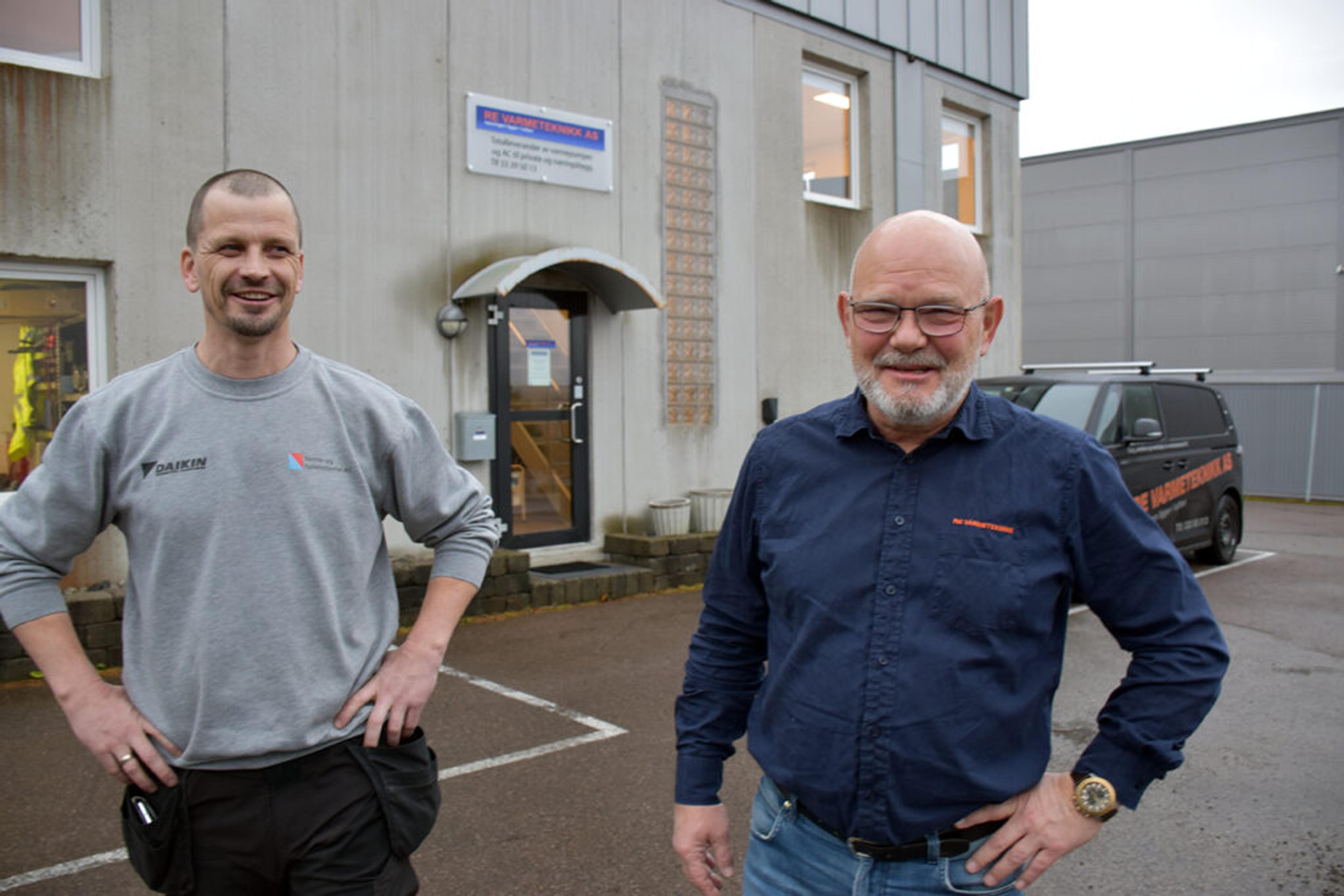 FUSJONERER: Carl Basberg (45), Varme- og kjølesystemer, og Øivind Tønnesen (67), Re varmeteknikk. Her utafor adressen på Lundteigen i Re, som Re varmeteknikk flytter ut av. Foto: Stian Ormestad, ReAvisa.
