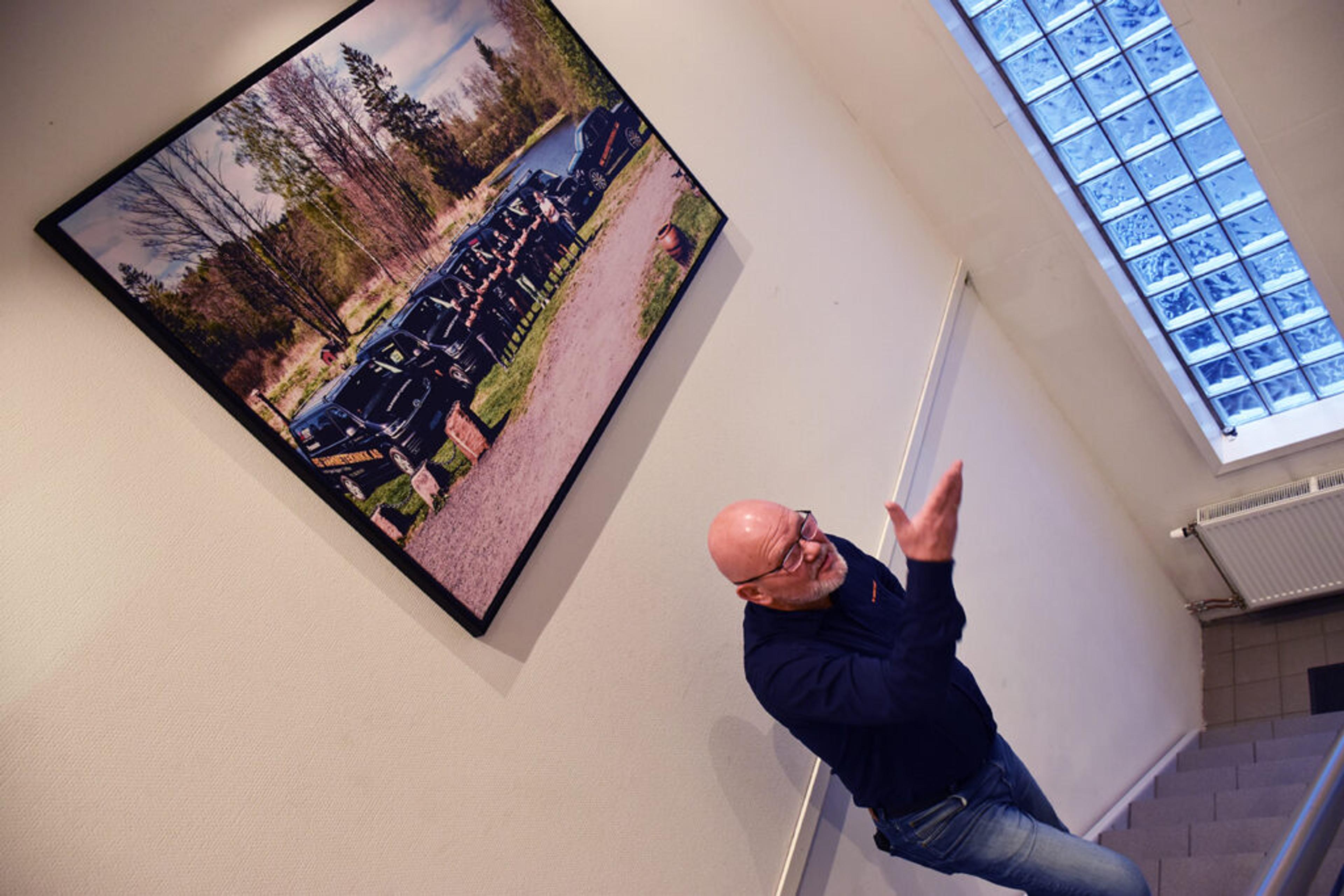MANGE MINNER: Inngangspartiet er prydet med mange store og flotte bilder fra Re varmeteknikk-tida. – De får bli med til det nye kontoret mitt på Borgeskogen, forteller Øivind. Foto: Stian Ormestad, ReAvisa.
