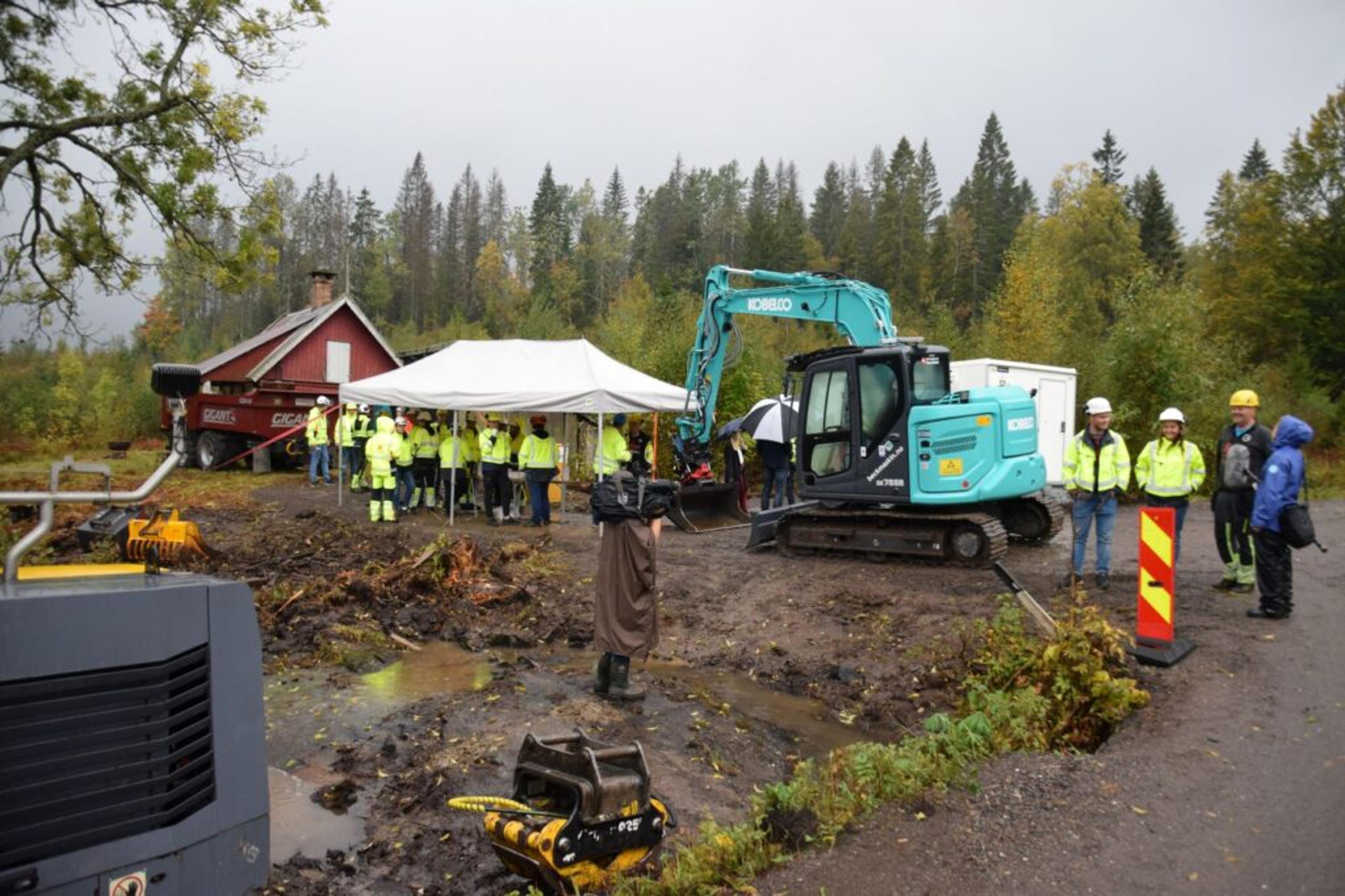PRESSEKONFERANSE: – Vi har bare hatt fint vær her, forteller elevene som har tjuvstarta arbeidene tidligere i høst. Men da presse og politikere var invitert til anleggsplassen, pøsa regnet ned. Foto: Stian Ormestad.