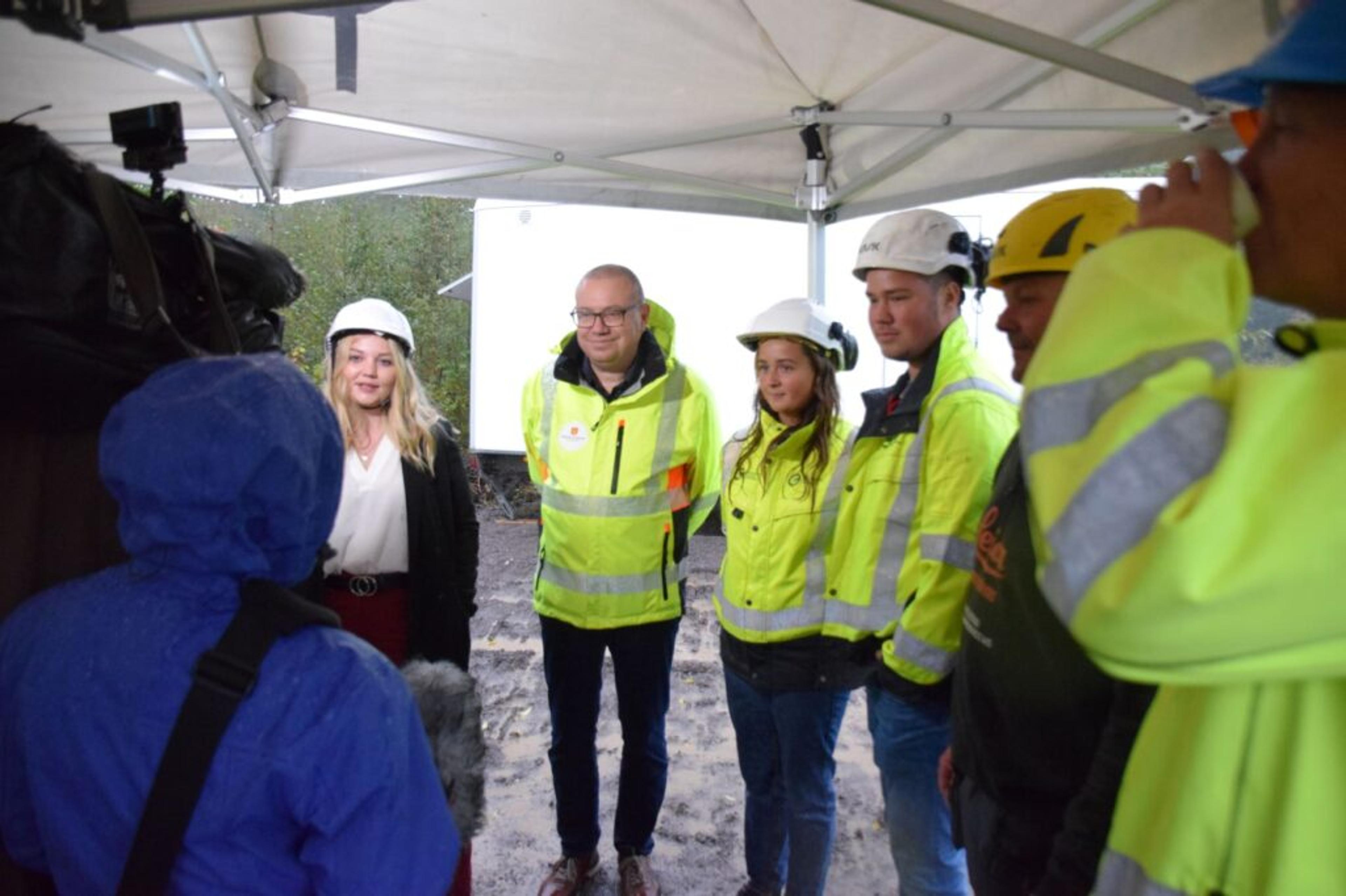 PRESSEKONFERANSE: I øs pøs regnvær var både presse og politikere tilstede for å prate med representanter for skole og anleggsnæringa: Elisabeth Holien og Arve Høiberg, ledere av henholdsvis hovedutvalg for samferdsel og hovedutvalg for kompetanse i fylkeskommunen, elevene Norah og Andreas, Re VGS-lærer og anleggsleder Bent Gunnerød, og Jørn Carsen Evensen, regionsjef Maskinentreprenørenes forening (MEF). Foto: Stian Ormestad.