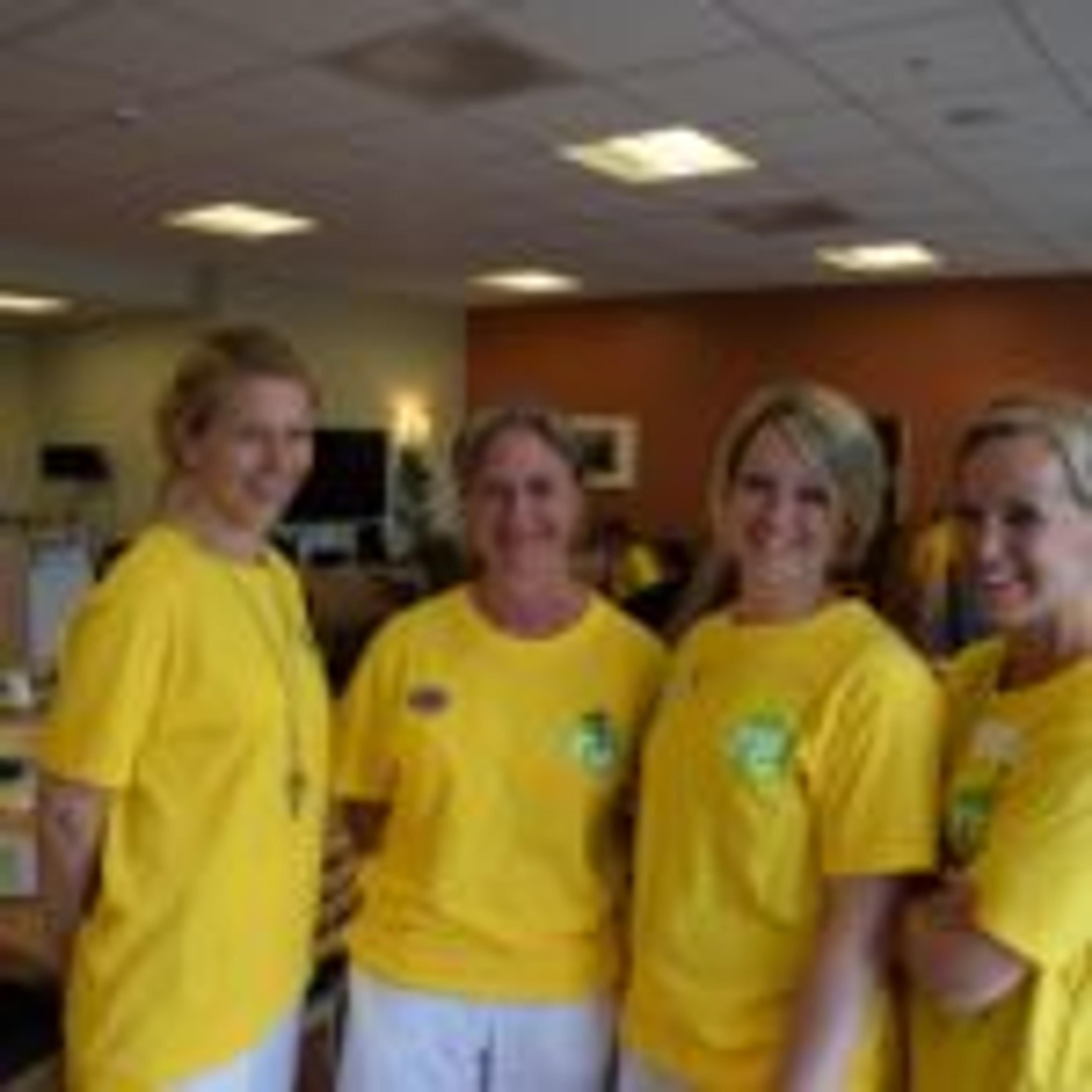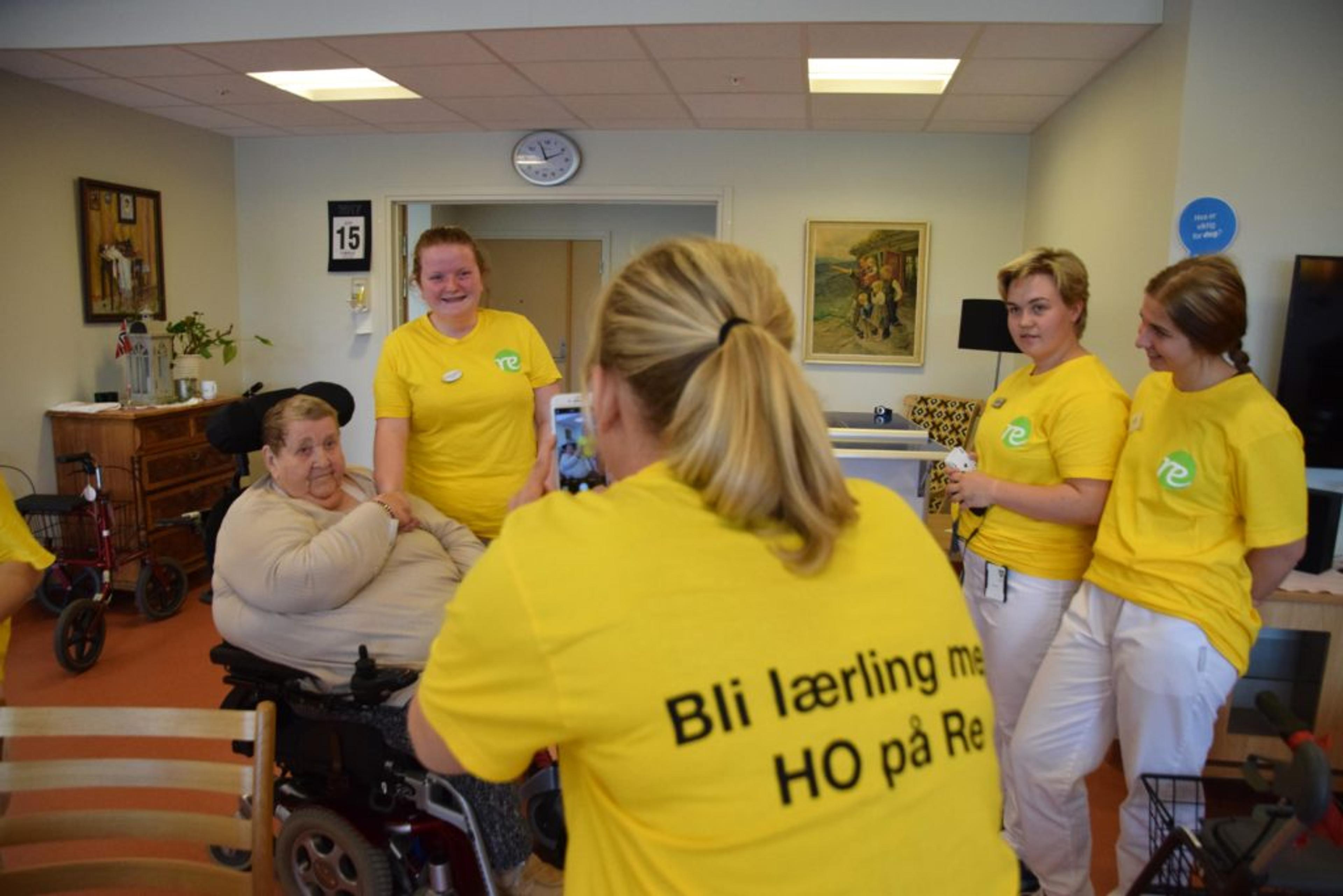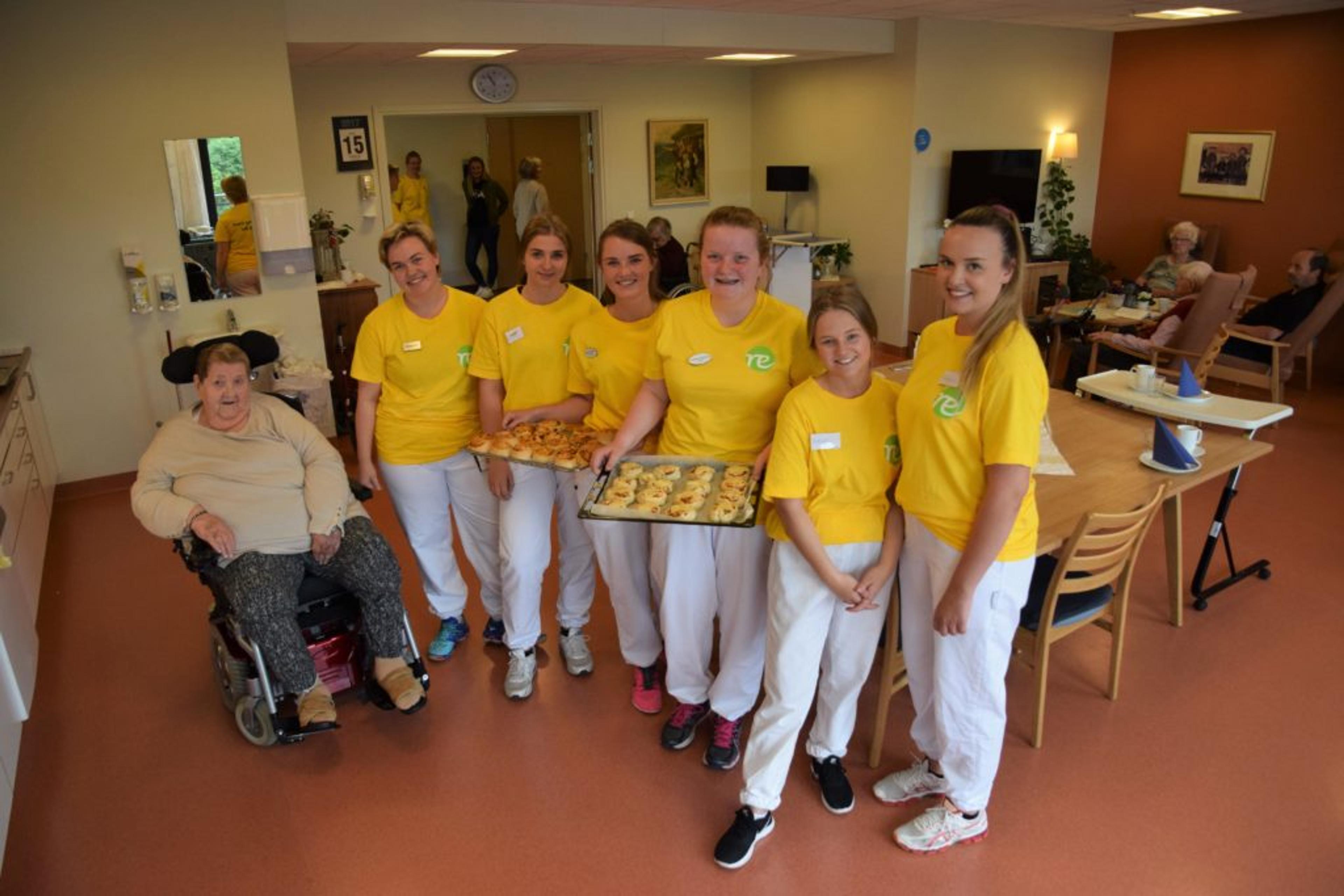 RE VGS-ELEVER: Fra venstre, alle i gule T-skjorter: Rebekka Bekkevold, Cecilia Bakkeløkken, Maren Kalager, Elisabeth Kjønnerød, Natalia Kolsrud og Helene Smedsrud. Beboer Ragnhild Martiniussen i rullestol til venstre. Foto: Stian Ormestad.