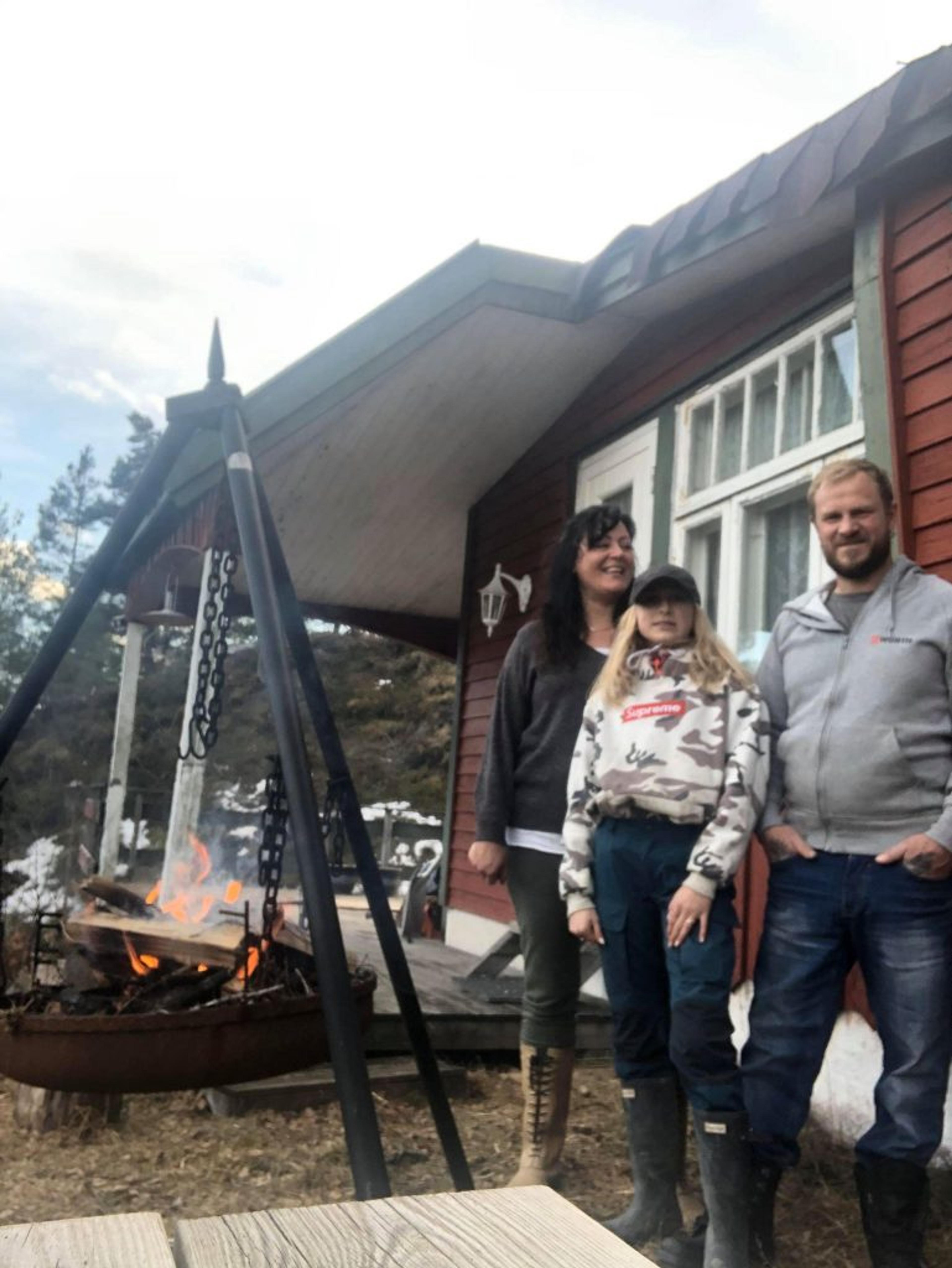 HYTTEKOS: Frode Riis (43), Siw Helen Pollestad (43) og Avilde Riis Thorin (14) fra Ramnes – på hytta i Ramnes. Foto: Privat.