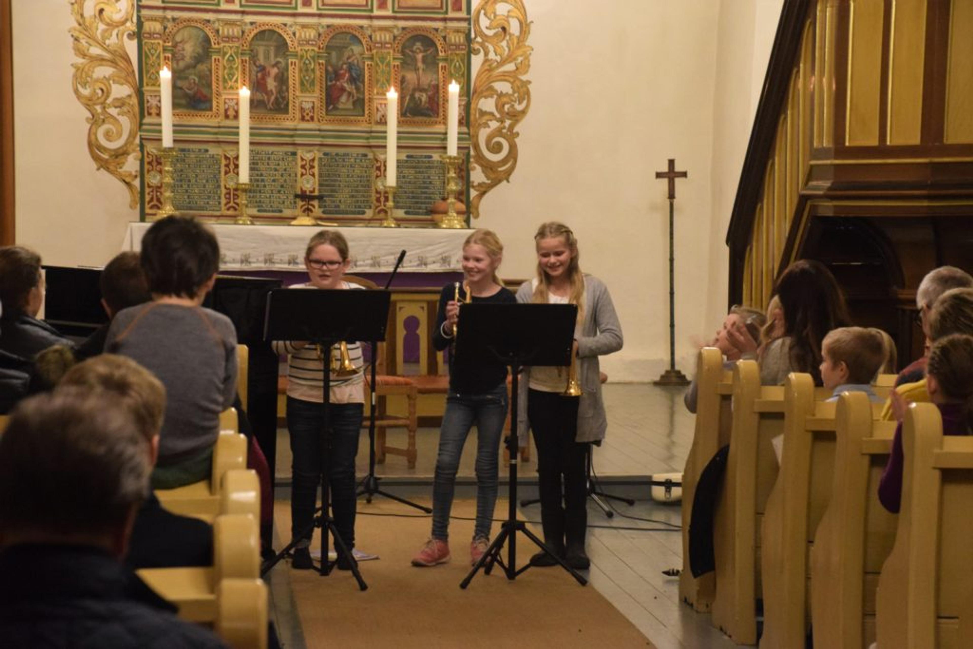 OVERRASKA MAMMA: Vilde Rosenborg Jørgensborg (9), Julie Grøtterud Sørum (9) og Thea Brundtland (9) spilte bursdagssangen – blant alle julesangene – i kulturskolens julekonsert i Våle kirke. Foto: Stian Ormestad.