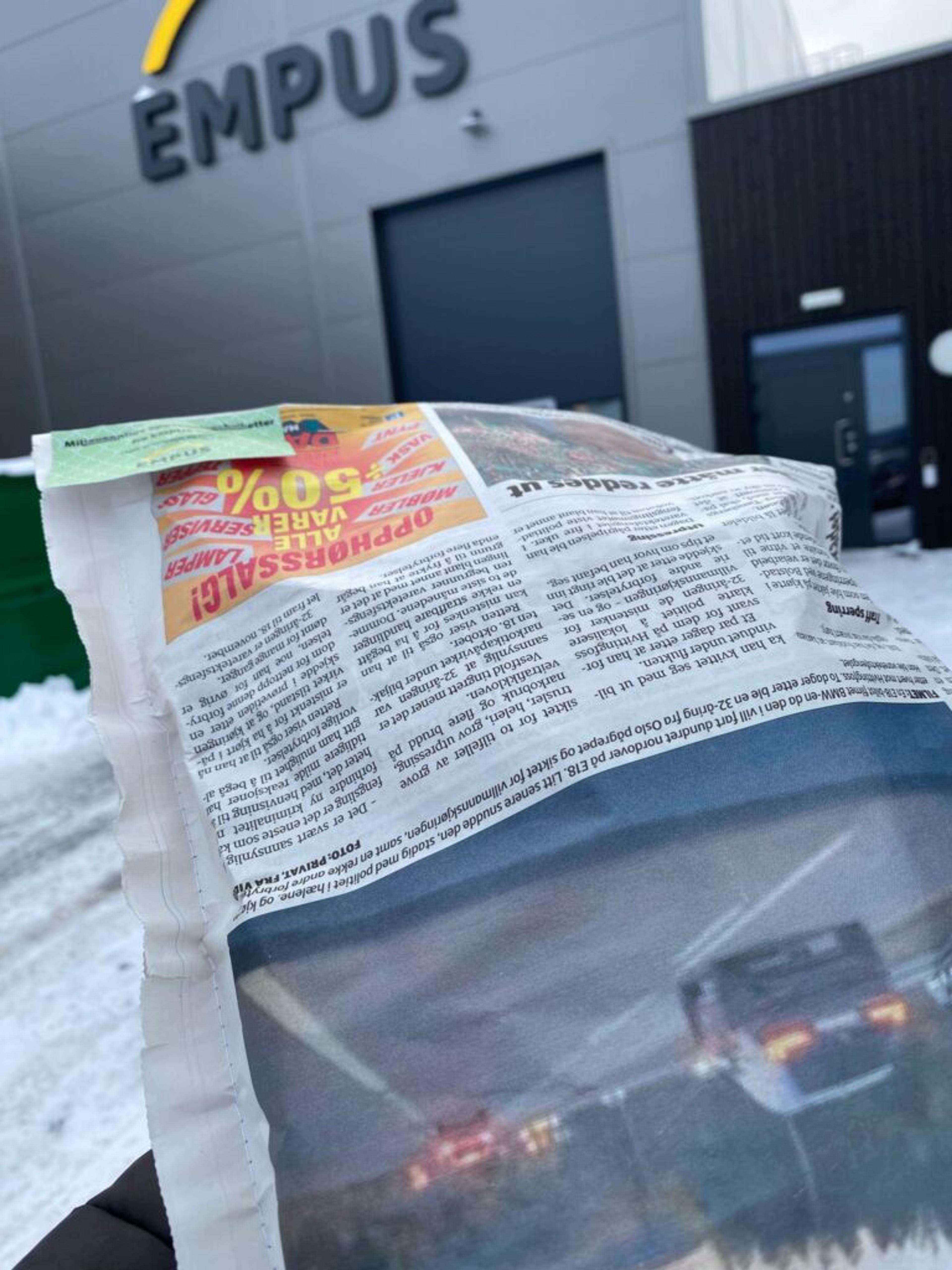 GJENBRUK FRA A TIL Å: Til og med innpakninga er gjenbruk av avispapir. Dette er en veldig gledelig vinn-vinn-situasjon, der lokalavisa kommer til nytte, helt til siste reis – inn i en peis. Foto: Stian Ormestad, ReAvisa.