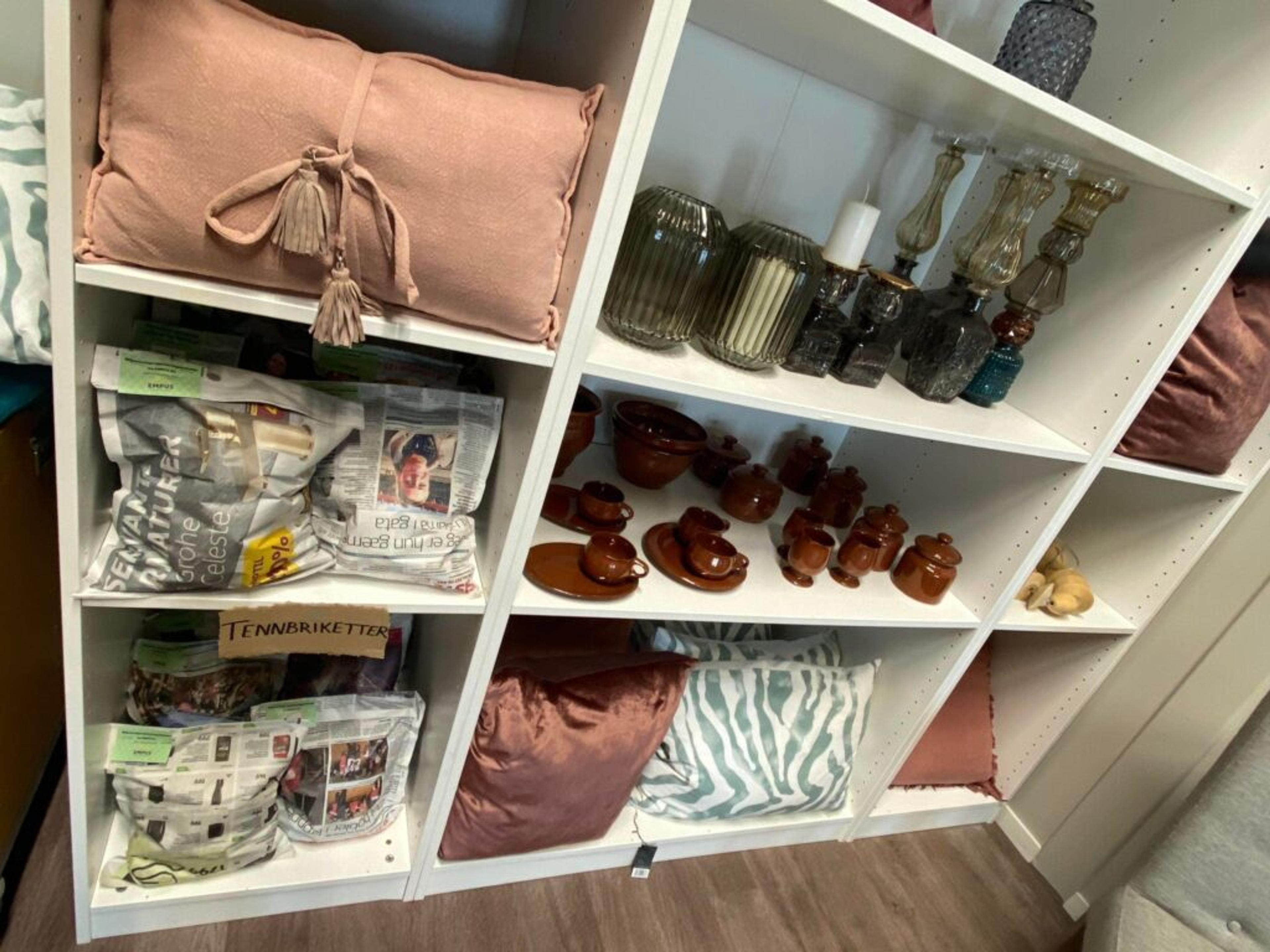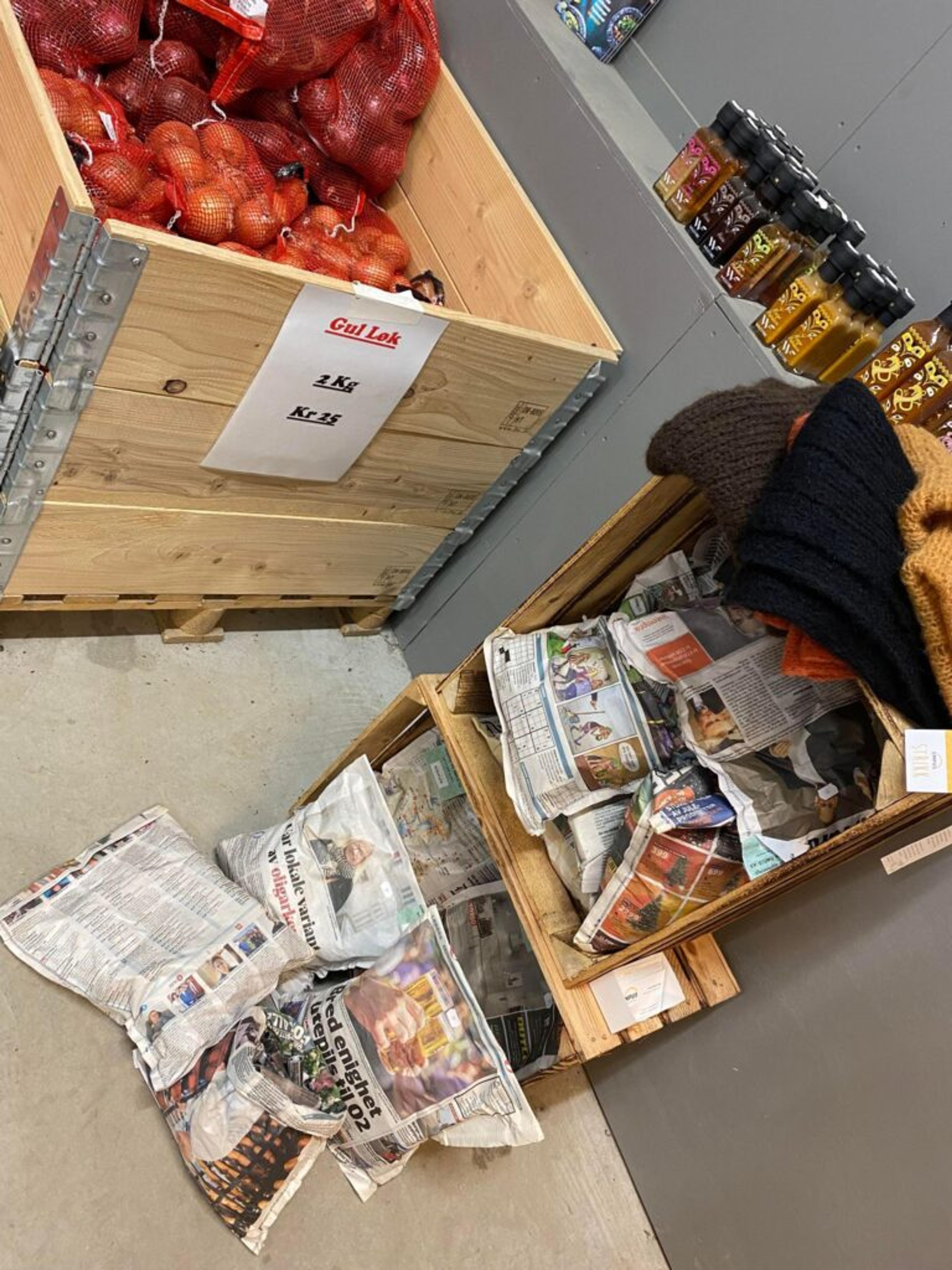 FRA AVIS TIL TENNBRIKETTER: Tennbrikettene av gammelt avispapir selges hos Empus på Bentsrud og hos flere gårdsbutikker, som for eksempel hos Veierud gårdsutsalg i Våle. De selges også i noen dagligvarebutikker rundt om. Foto: Stian Ormestad, ReAvisa.