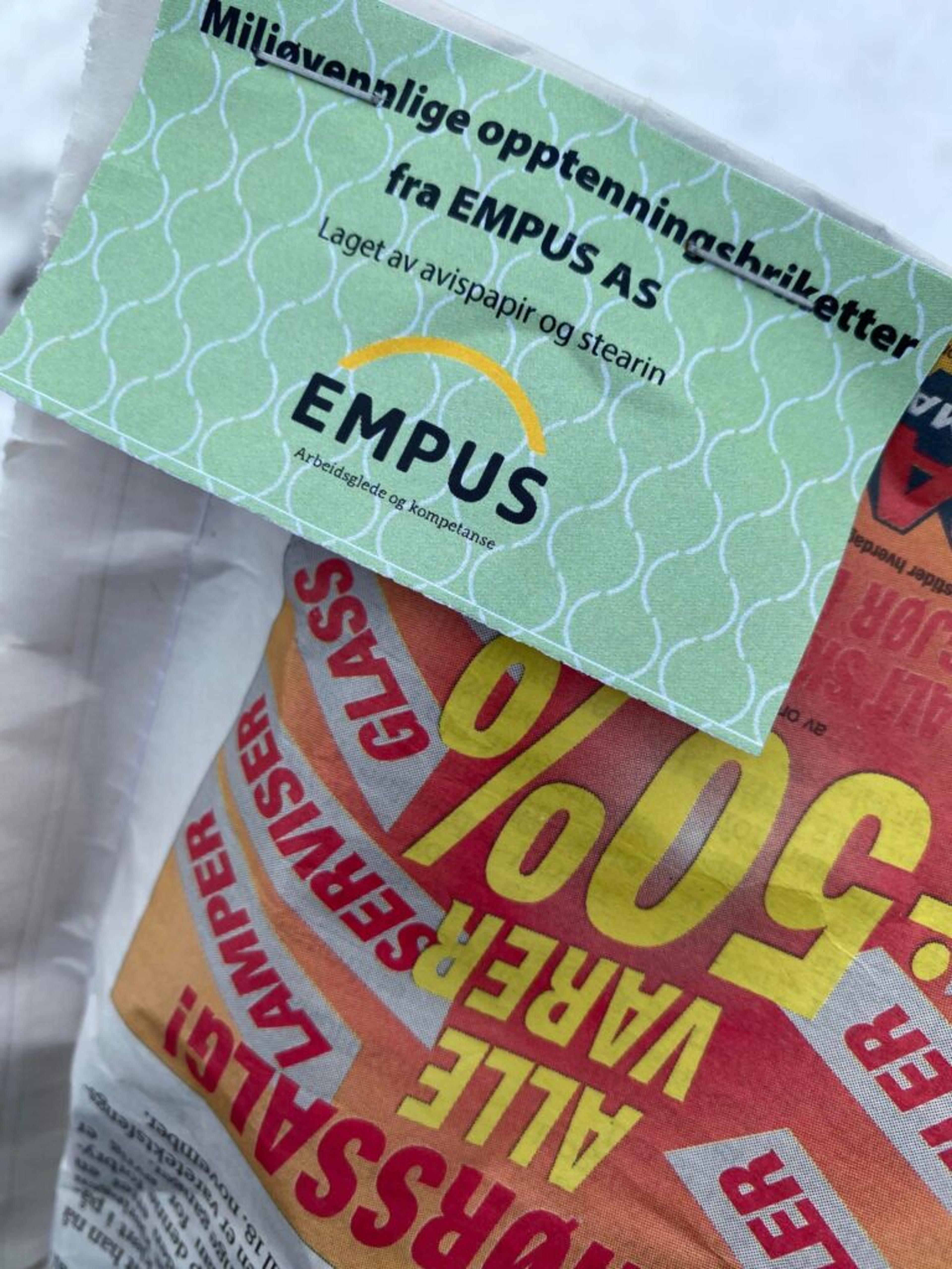 Hos Empus blir avissidene skilt fra hverandre og stifter resirkulert, papiret klippes i ramser som rulles til en bunt og bindes sammen, og det hele dyppes i stearin. Vipps – så har de gamle avisene blitt til tennbriketter, som vi kan love at funker som bare det.