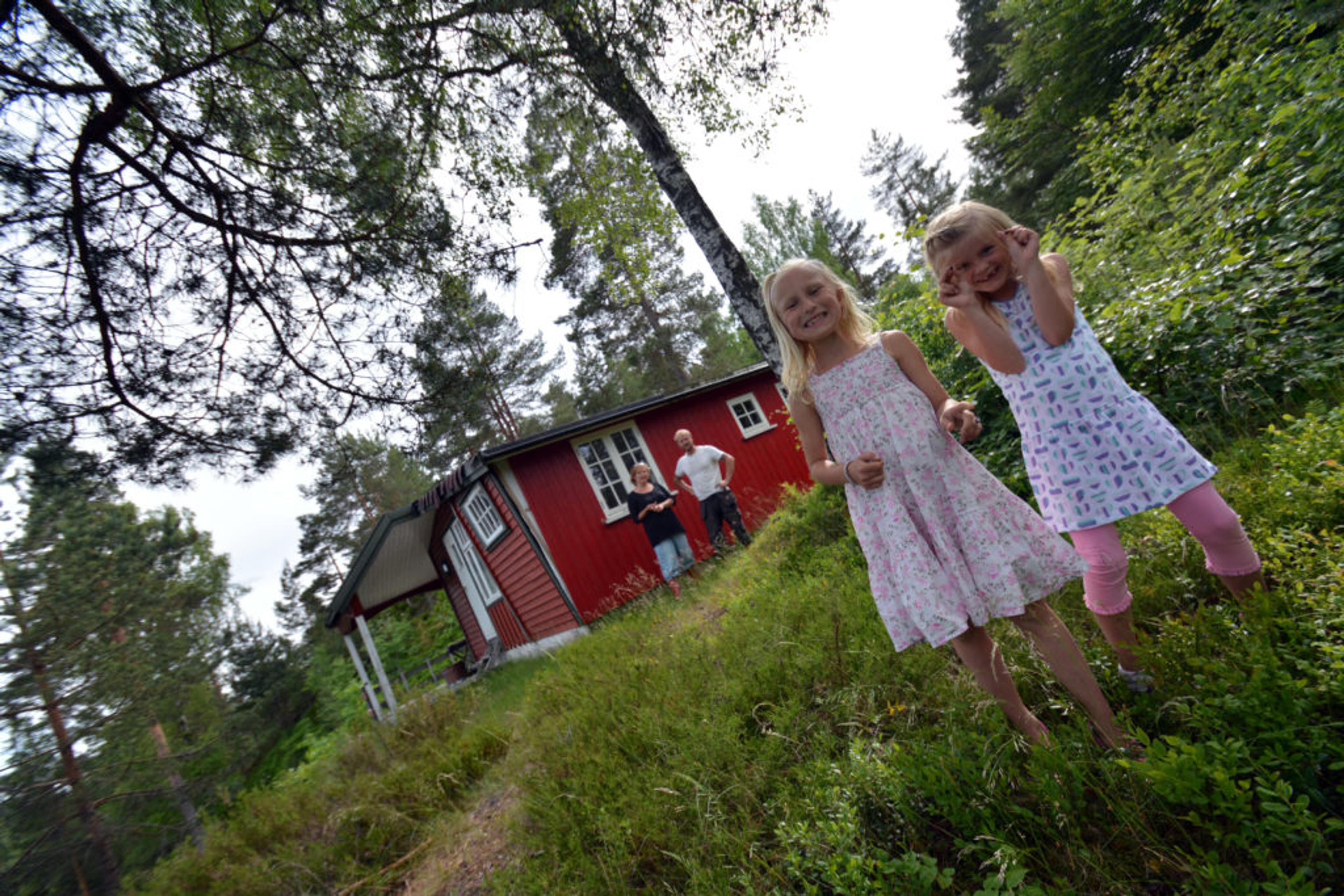 FERIEIDYLL I EGEN KOMMUNE: Ferieparadiset ligger ikke langt unna når du har hytte i egen kommune. Nærmere bestemt sju minutter hjemmefra, fortalte Frode Riis fra Ramnes i Sommermagasinet for tre år siden. På bildet ser vi Alvilde Riis og Madeleine Hanssen Solberg på leit etter kommende blåbærtuer ved hytta på Langevann. Foto: Stian Ormestad.