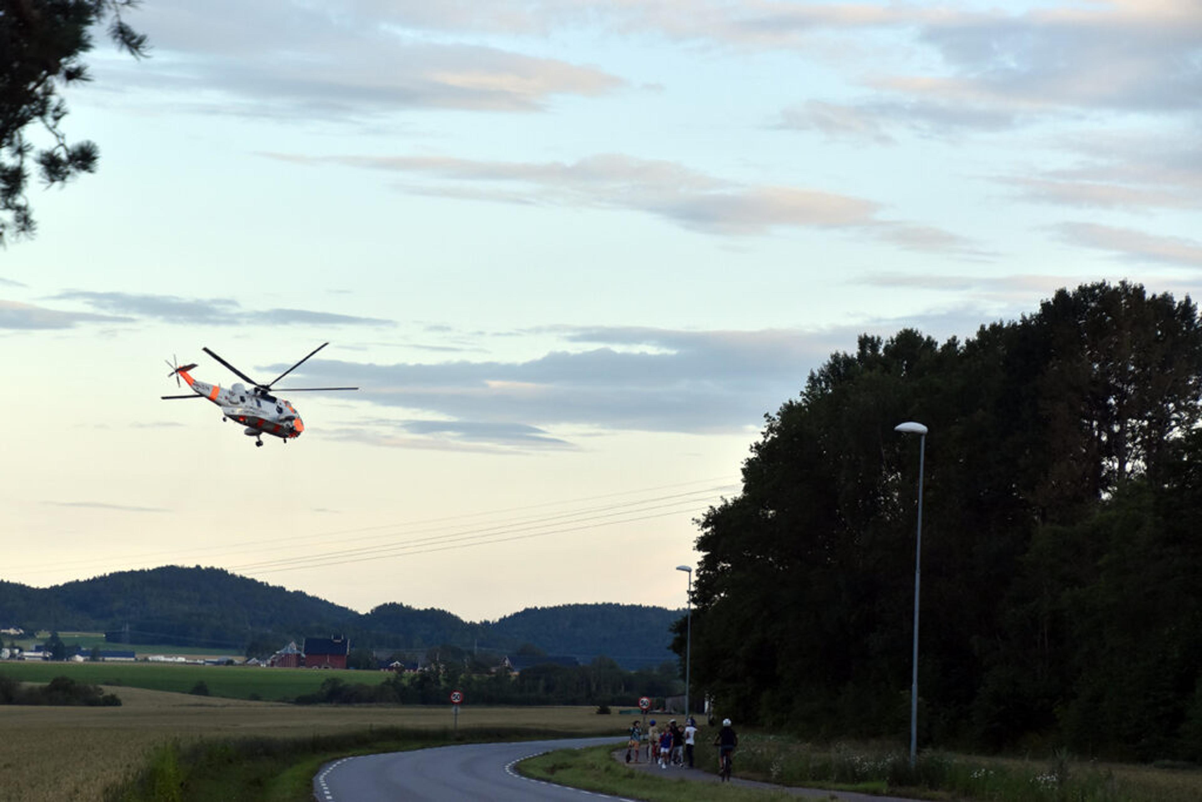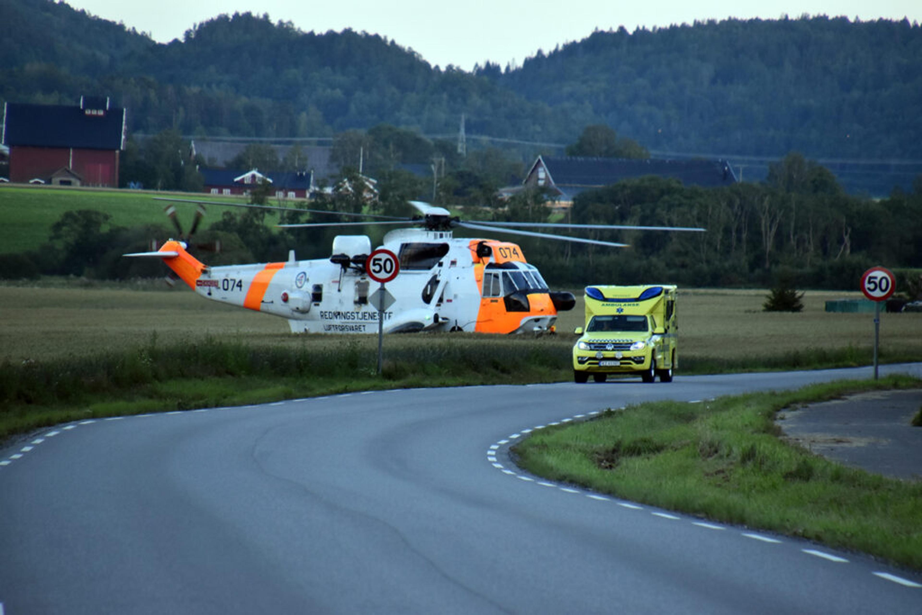 Redningshelikopteret landa i kornåkeren, og ambulansene ble stående i den ene veibanen. Helsepersonell på stedet kan ikke si noe om oppdragets art, det kan heller ikke pressevakt ved Hovedretningssentralen Sør-Norge.