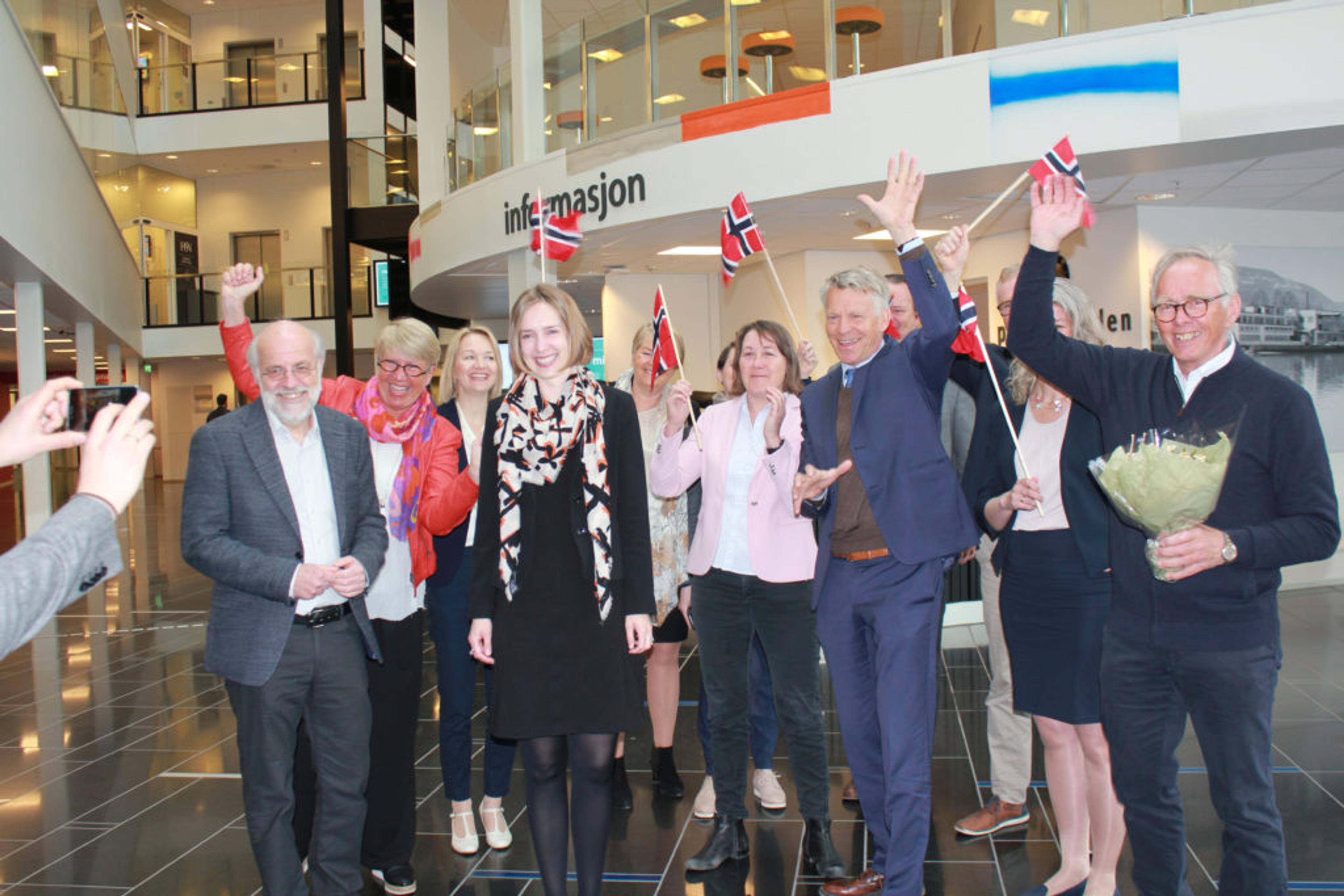 FEIRER! Glade ansatte på det nye universitetet fikk nyheten av statsråd Iselin Nybø i begynnelsen av mai i år. Første rekke fv: rektor Petter Aasen, statsråd Iselin Nybø (V), prorektor Kristian Bogen, styreleder Rune Nilsen. Foto: Universitetet i Sørøst-Norge.