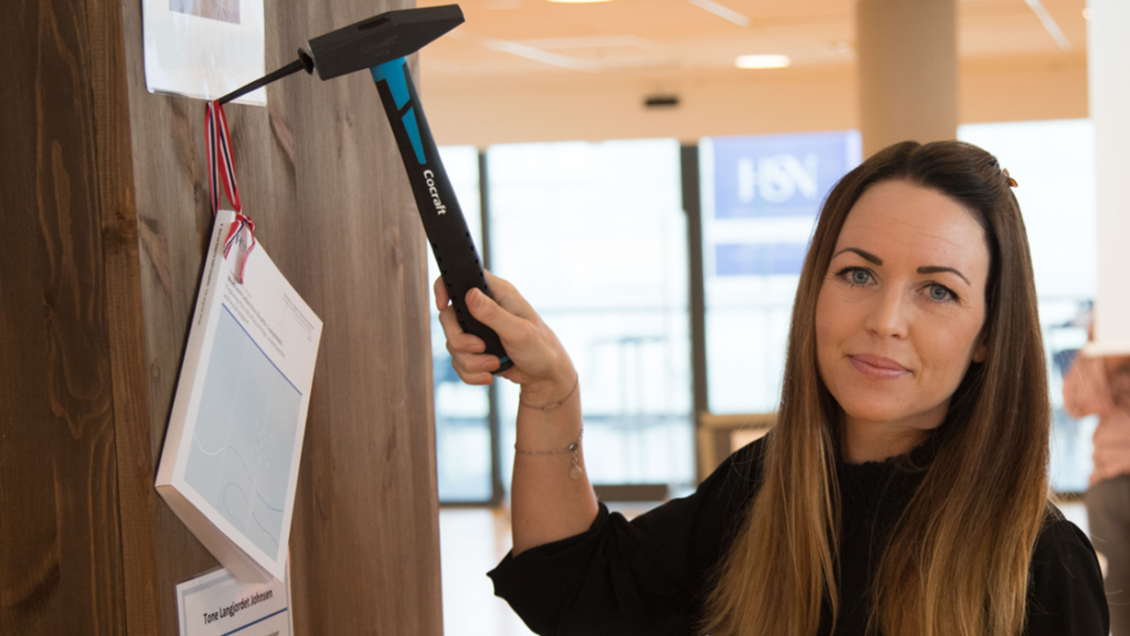 DISPUTAS: Tone Langjordet Johnsen spikrer opp sin doktorgradsavhandling under den såkalte spikringsseremonien ved Universitetet i Sørøst-Norge. Foto: Thor Ole Johnsen.