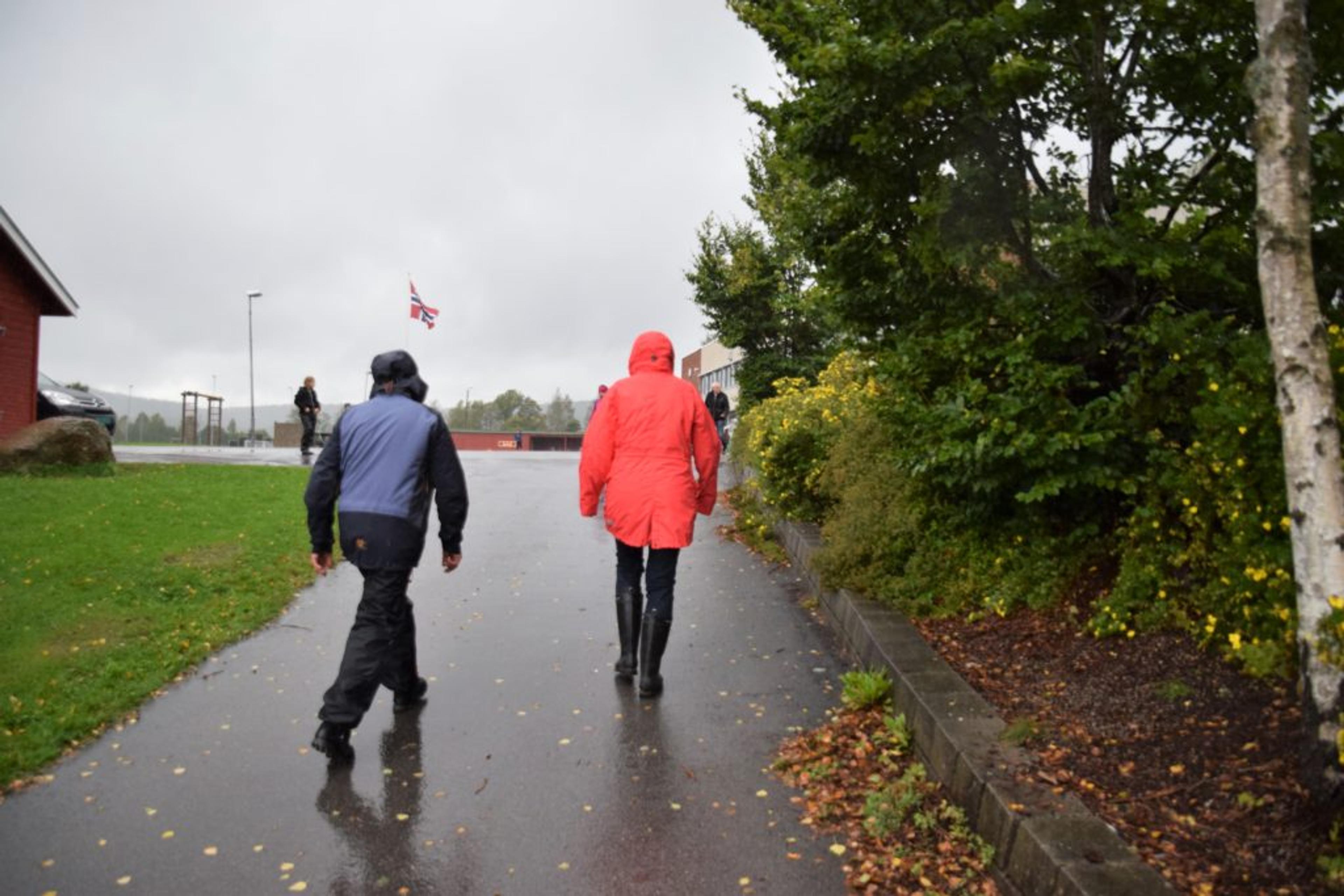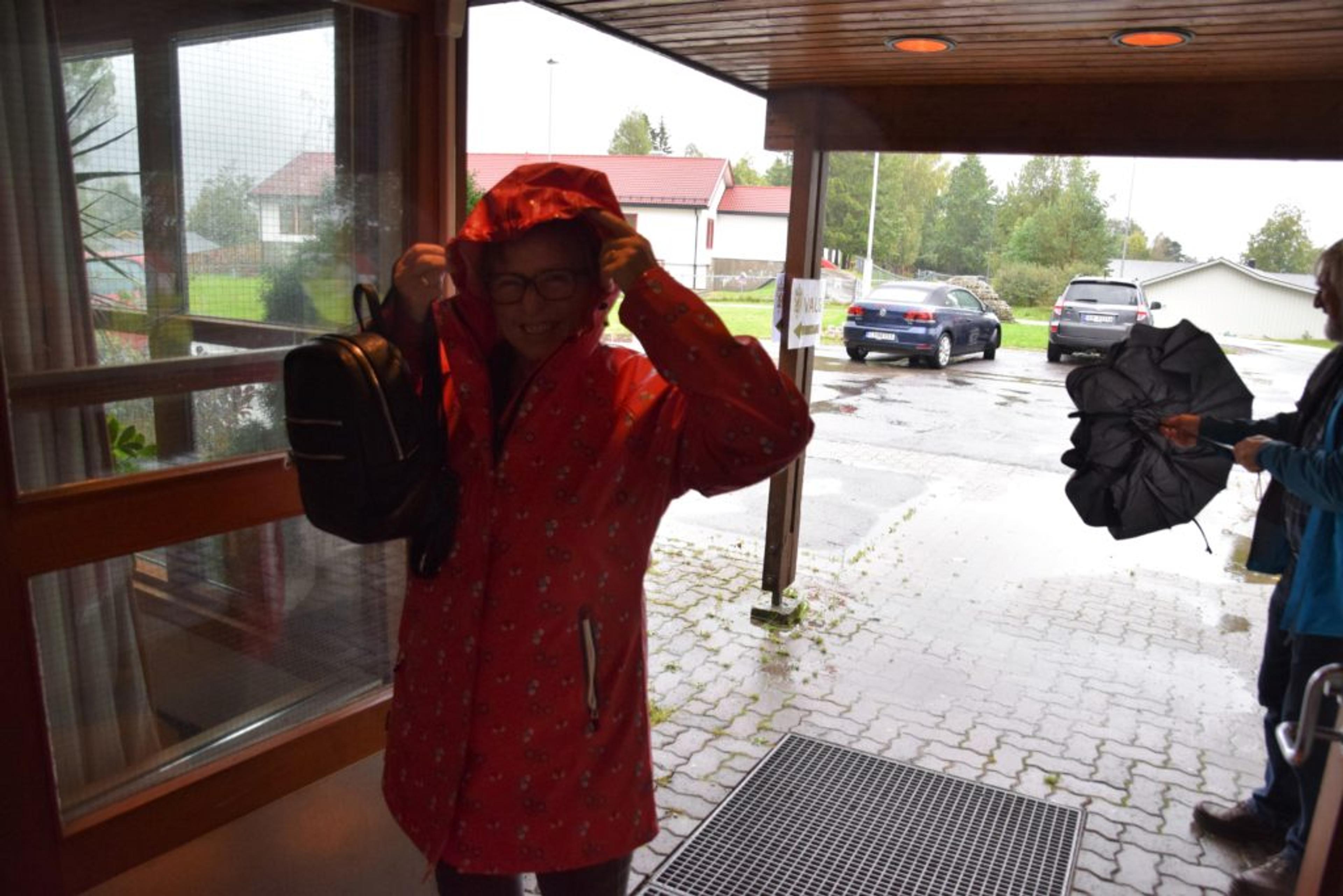 GODT KLEDD: Velgerne strømmer på i Våle, tross grått og vått vær. Foto: Stian Ormestad.