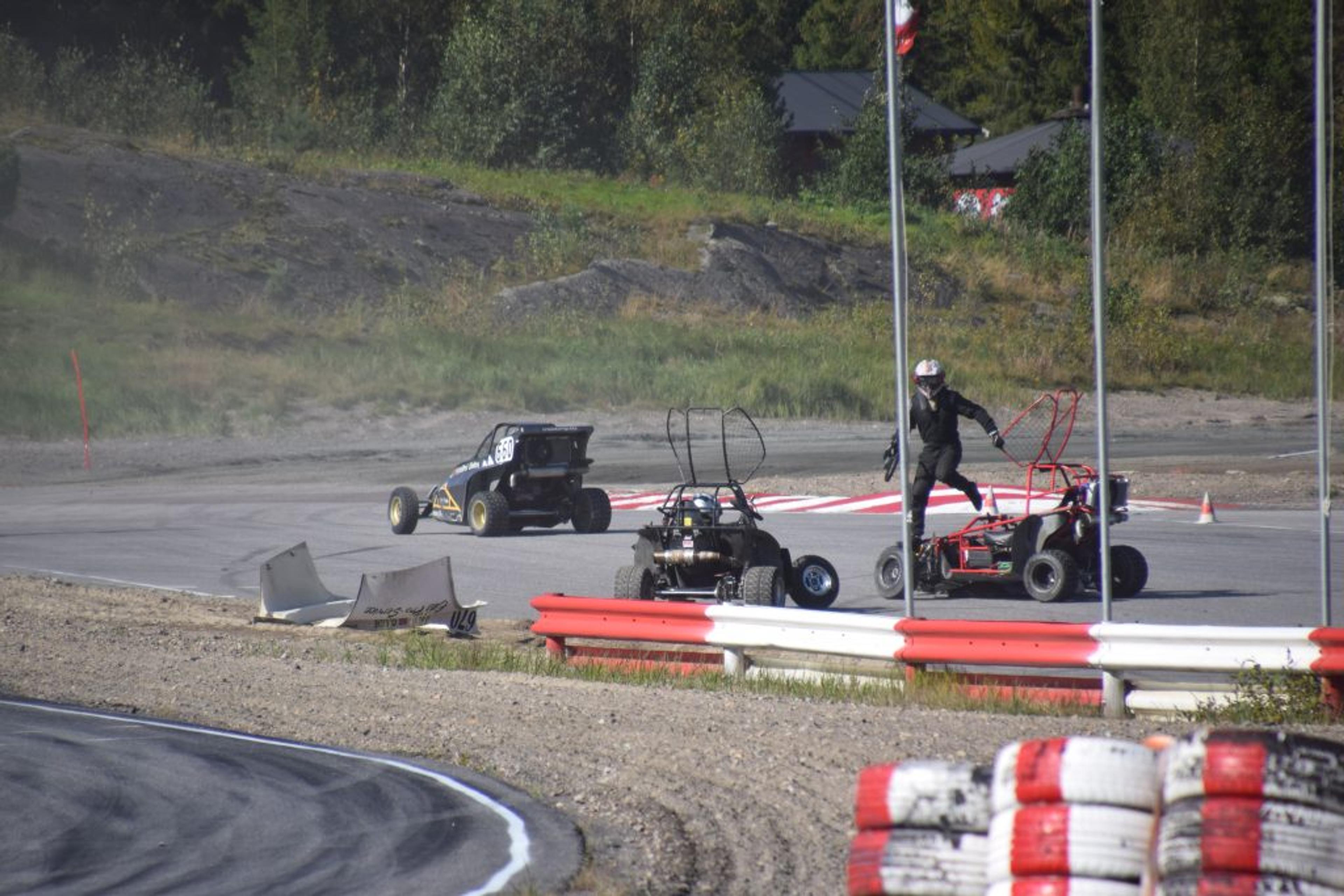 ACTION: På det store bildet ser vi en massekrasj i en av startene på NM-runden på Grenland motorsportsenter. Midt inni mølja befinner Halvard Grytnes (47) fra Undrumsdal seg. Det gikk bra med Halvard og alle de involverte. Se hele bildeserien i fotogalleriet fra crosskart-NM. Foto: Stian Ormestad.