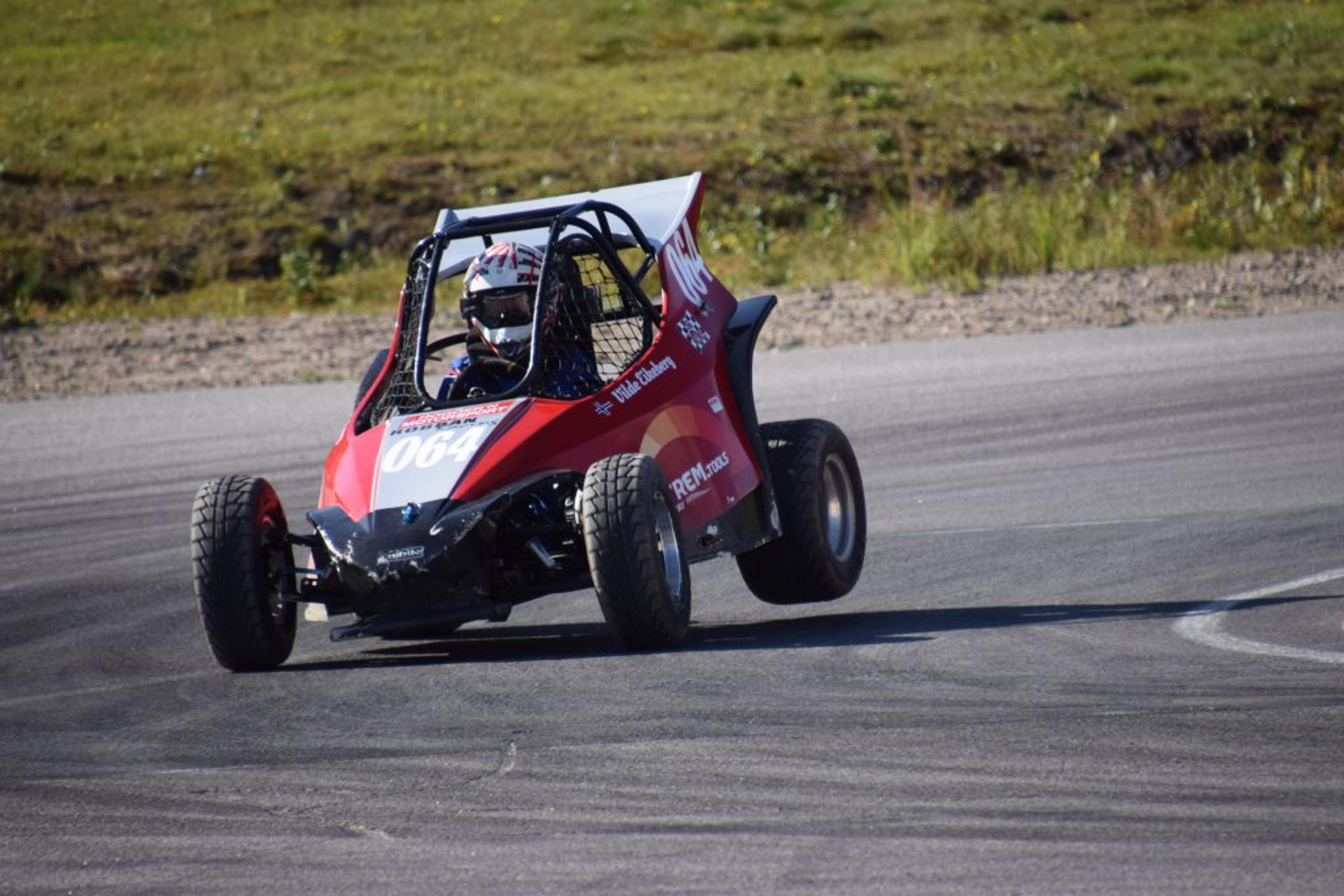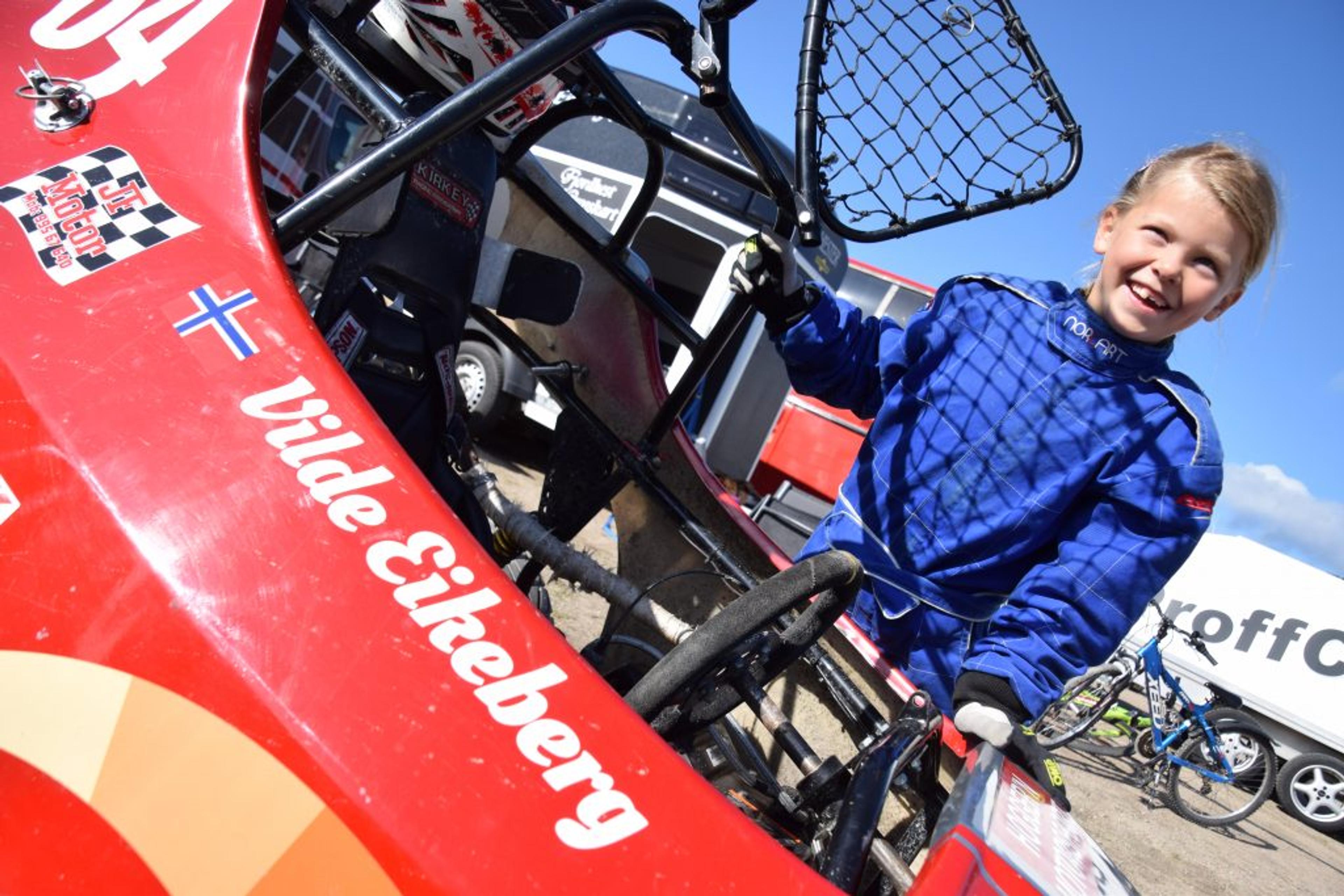 FERSK CROSSKARTKJØRER: Det ble en stor «forbikjøringsfest» i depot etter Vilde S. Eikebergs (7) første løp. – Det var fordi jeg kjørte forbi en annen for aller første gang!, forteller den stolte Undrumsdal-jenta. Foto: Stian Ormestad.