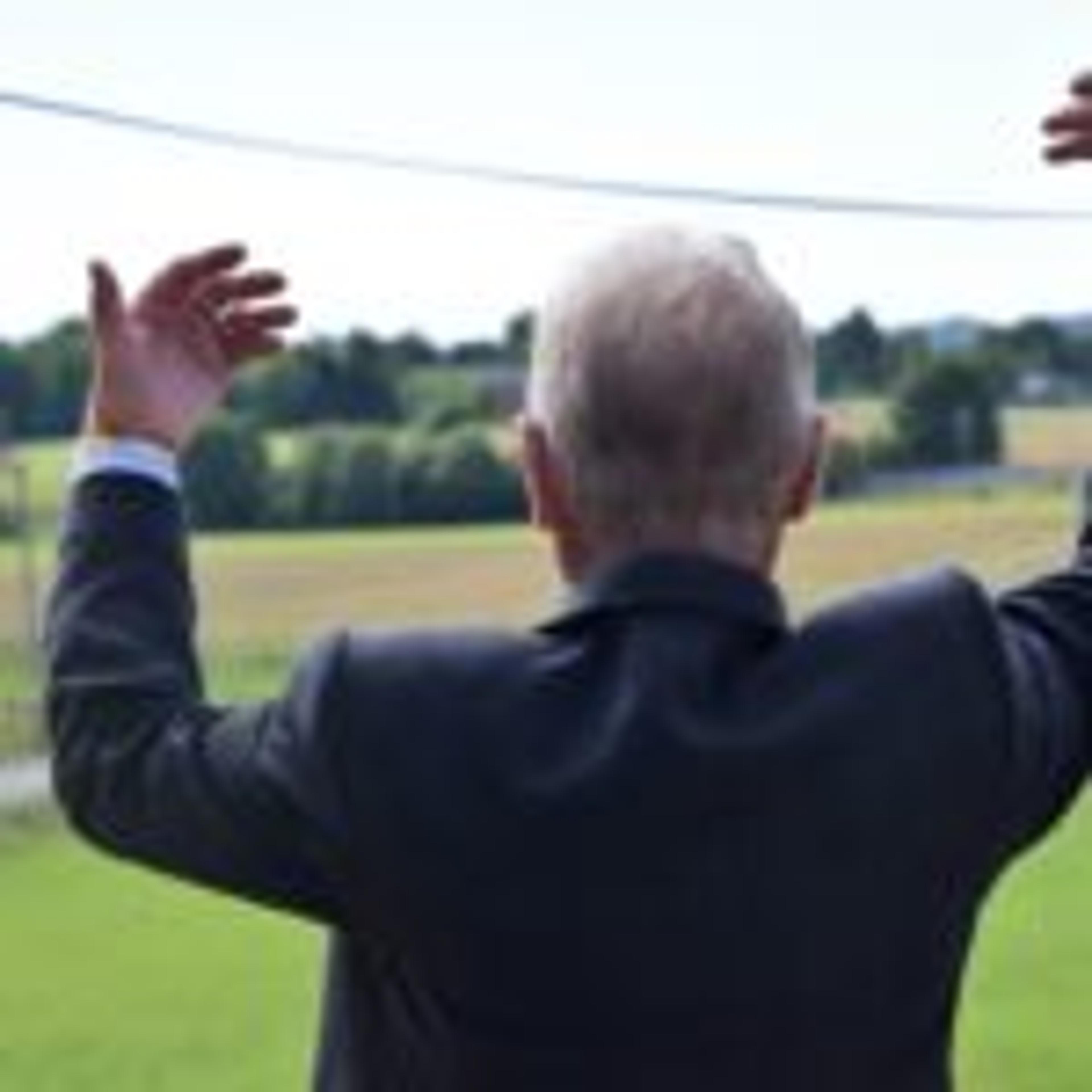 SAMLER TROPPENE: Tidsskjema holdt på å sprekke i Re, der følget hadde fått feil både tid og sted for oppmøte fra fylkeskontoret til Senterpartiet. Men Re-ordfører Thorvald Hillestad (SP) fikk samla troppene – tilslutt. Foto: Stian Ormestad.
