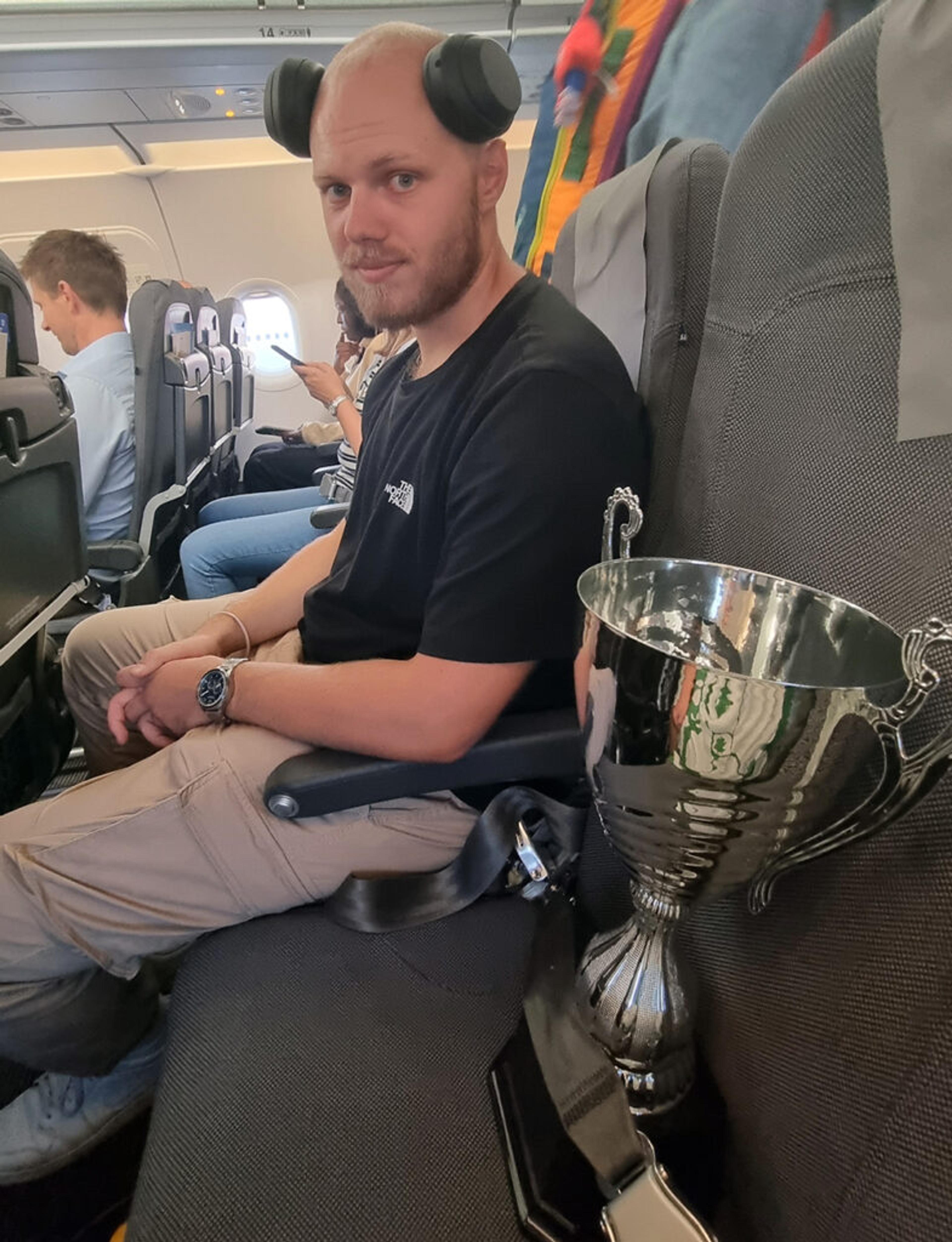 I VERDENSELITEN: Thomas Jacobsen Amdal (27) fikk det ærefulle oppdraget med å frakte pokalen hjem fra mesterskapet i Paris nå på seinsommeren: Med god plass på flyet kunne pokalen til og med få et eget sete. Foto: Privat.