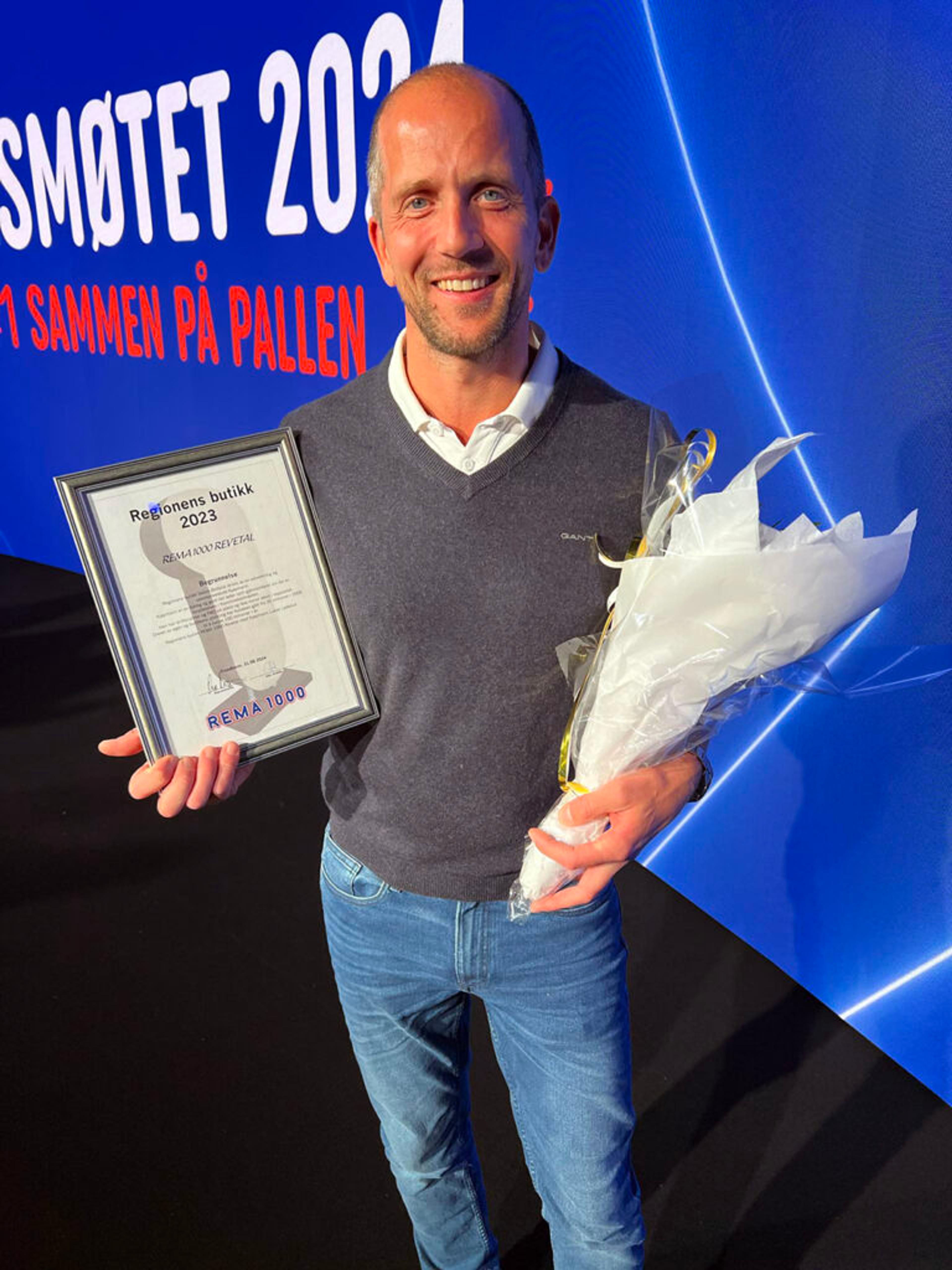KÅRET TIL BESTE BUTIKK: Butikksjef Lukas Ljøterud med diplom i ramme og blomster etter kåringen av Rema 1000 Revetal som beste butikk i Rema-kjeden Vestre Østland, som i praksis er Vestfold og Telemark fylker. Foto: Privat.