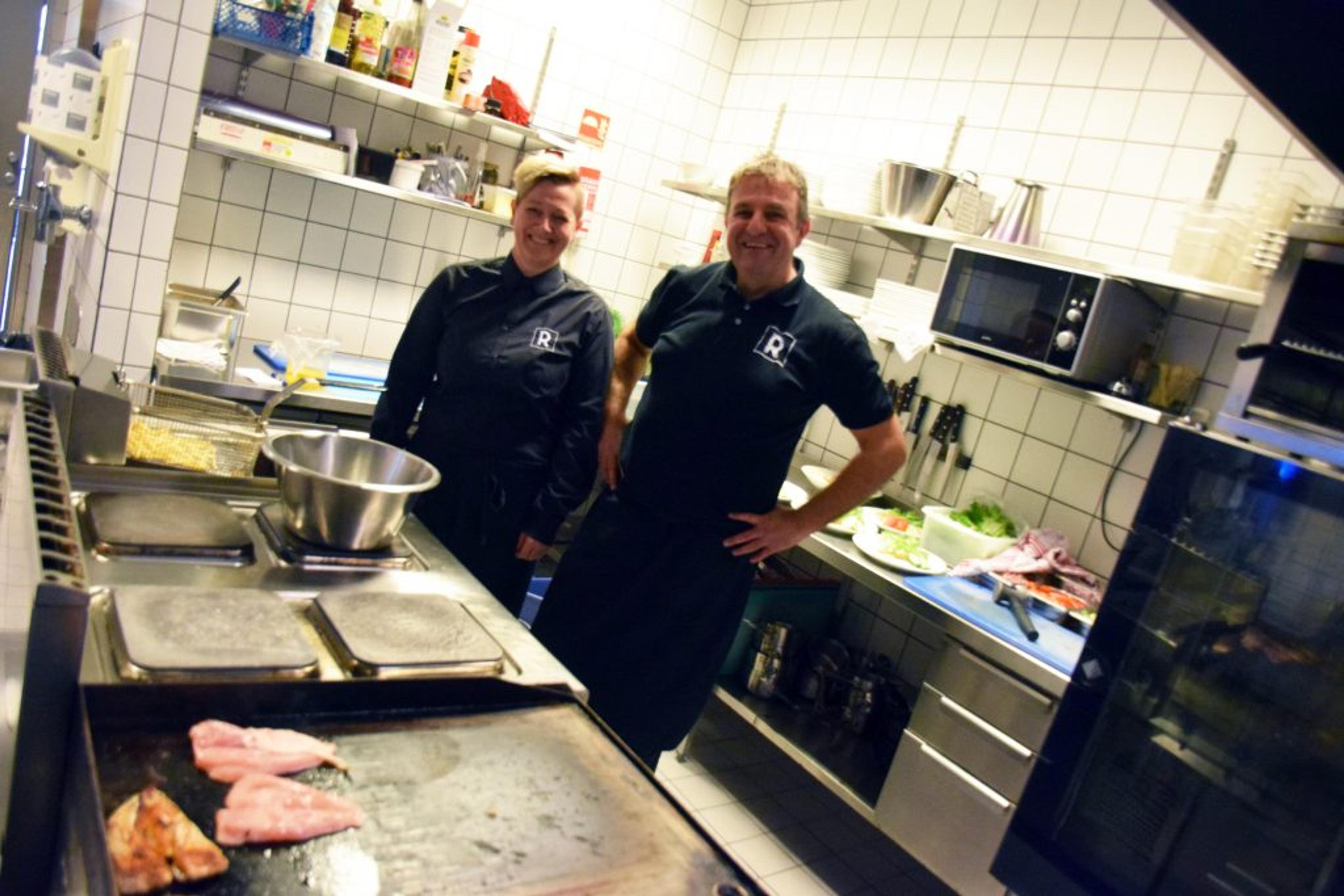 FULL FART: Lokalavisa fikk såvidt klart å samle de to på jobb torsdag formiddag, mens restauranten var full av folk og kjøkkenet gikk på høygir. Restauranten er et populært innslag på Revetal. Foto: Stian Ormestad.