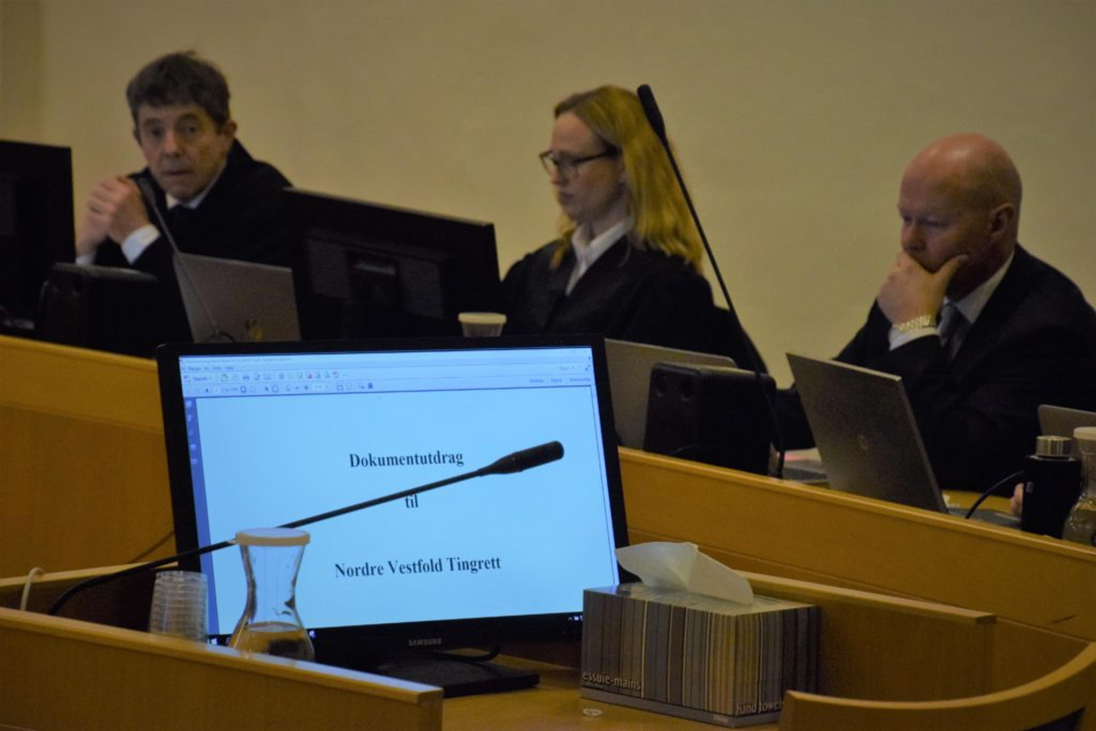 I VITNEBOKSEN: Daglig leder i Revac AS ble spurt ut av aktor Hans Tore Høviskeland, helt til venstre. Videre ser vi politiadvokat i Økokrim Maria Bache Dahl og Per Knut Vistad, spesialetterforsker i Økokrim. Foto: Stian Ormestad.