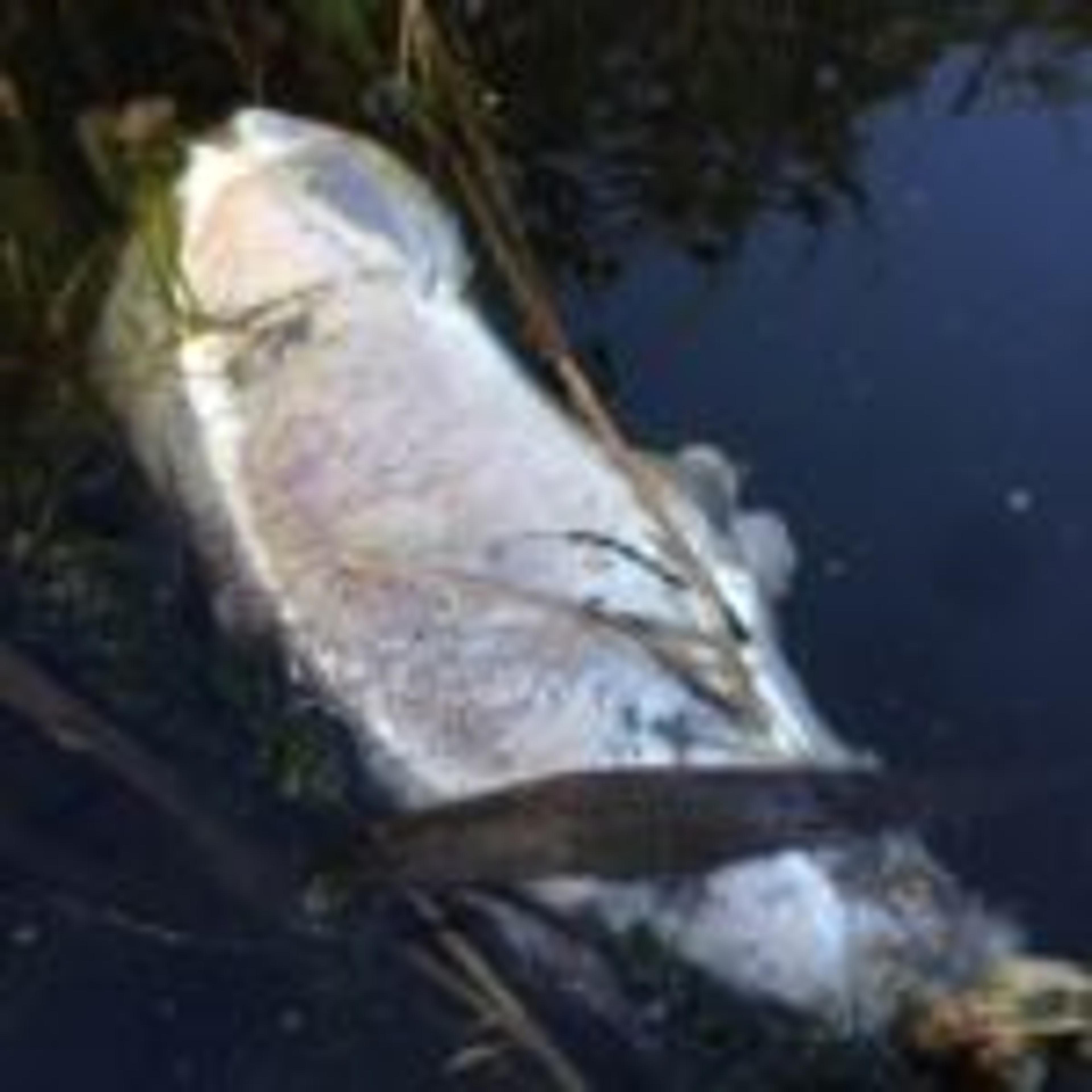 FISKEDØD: Allerede på ettermiddagen samme dag som brannen starta oppdaga vitner død fisk i Bjunebekken. Foto: Privat.