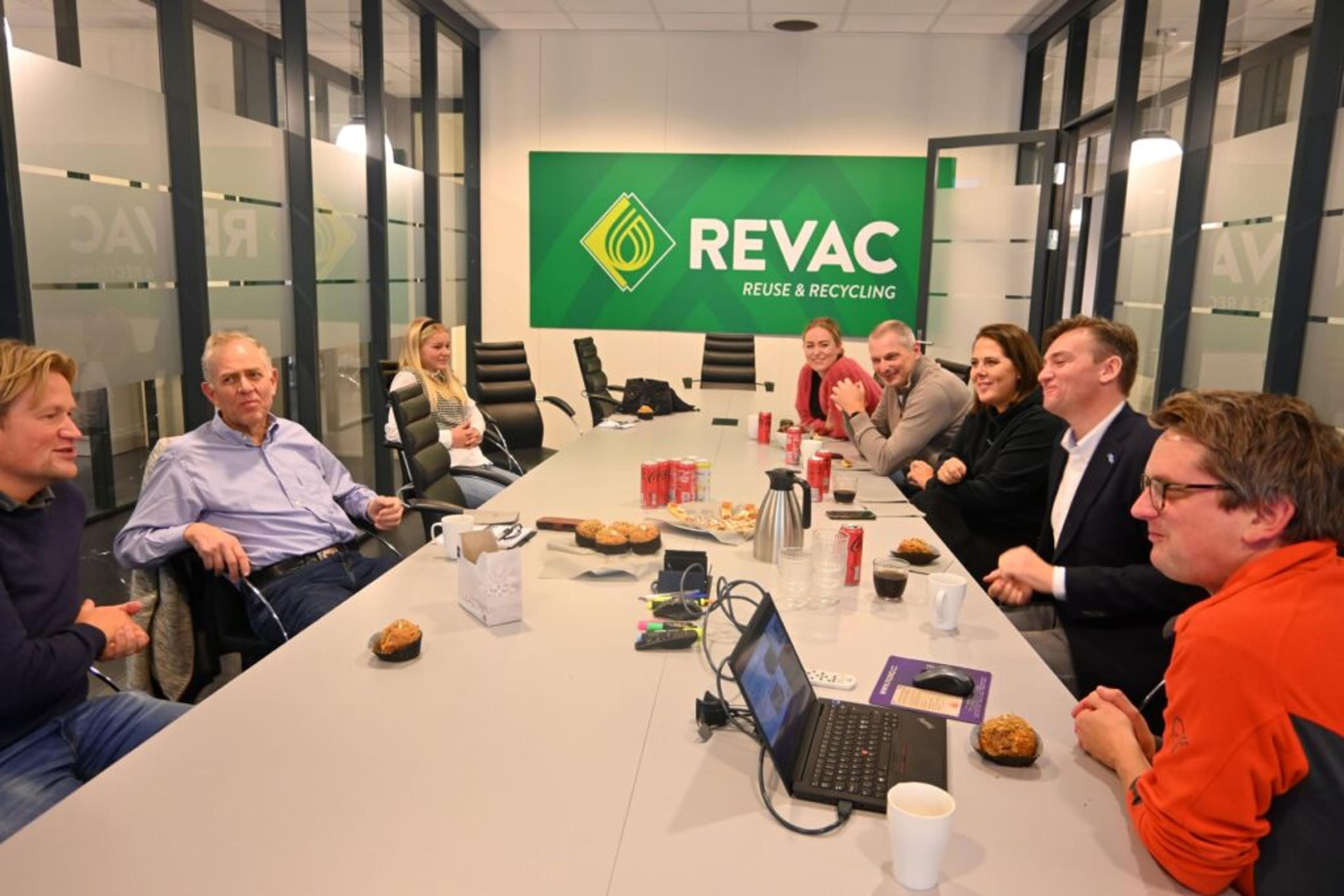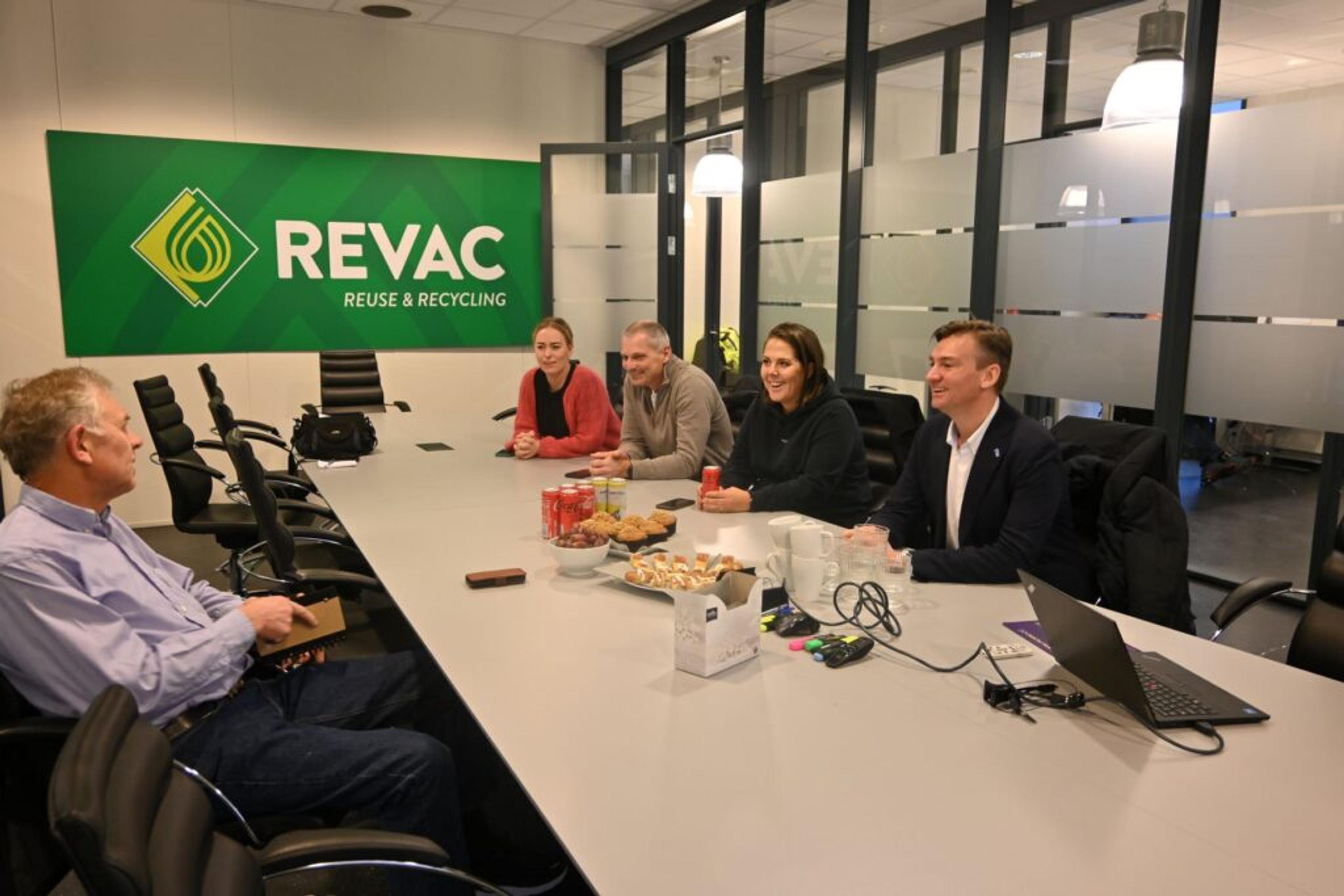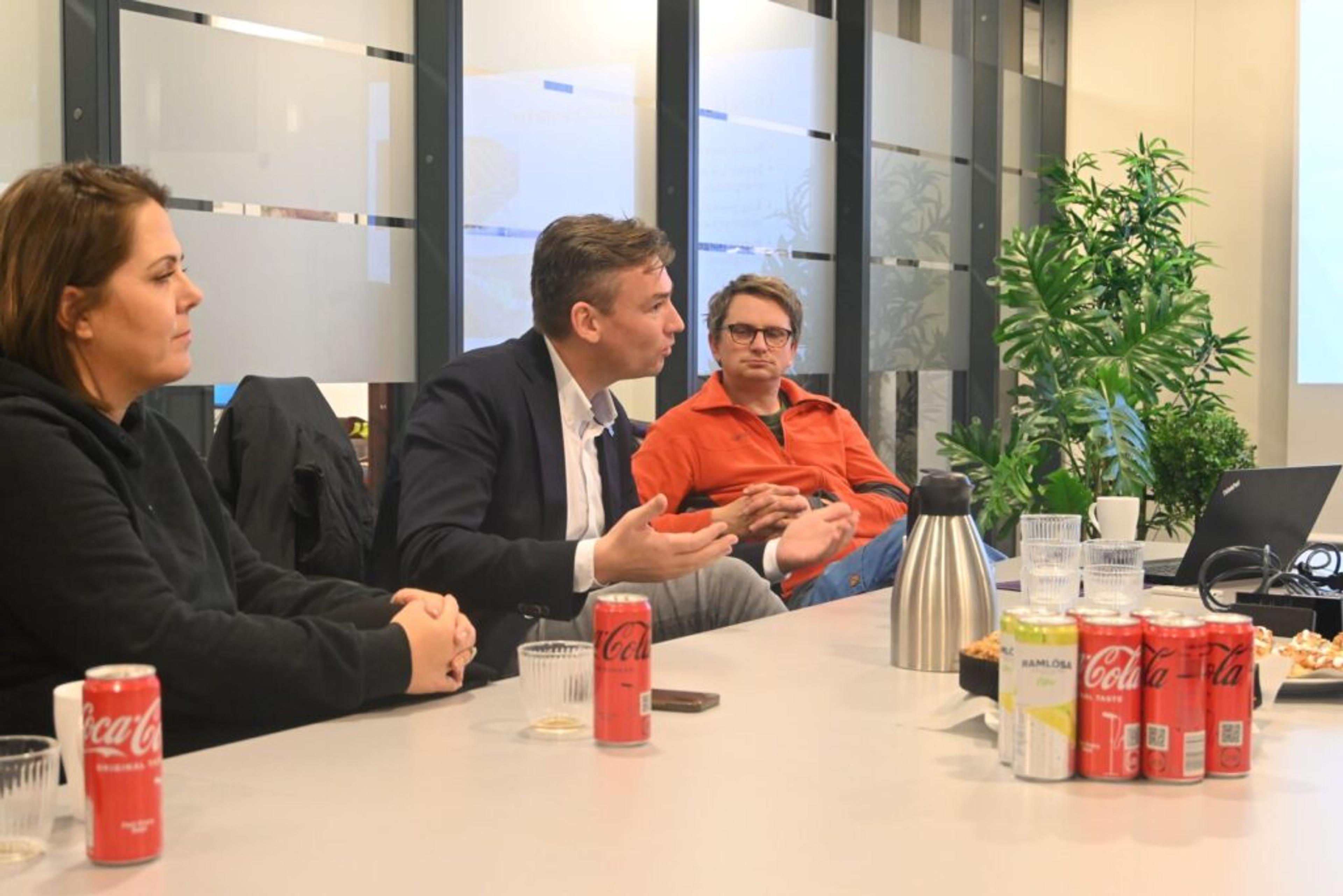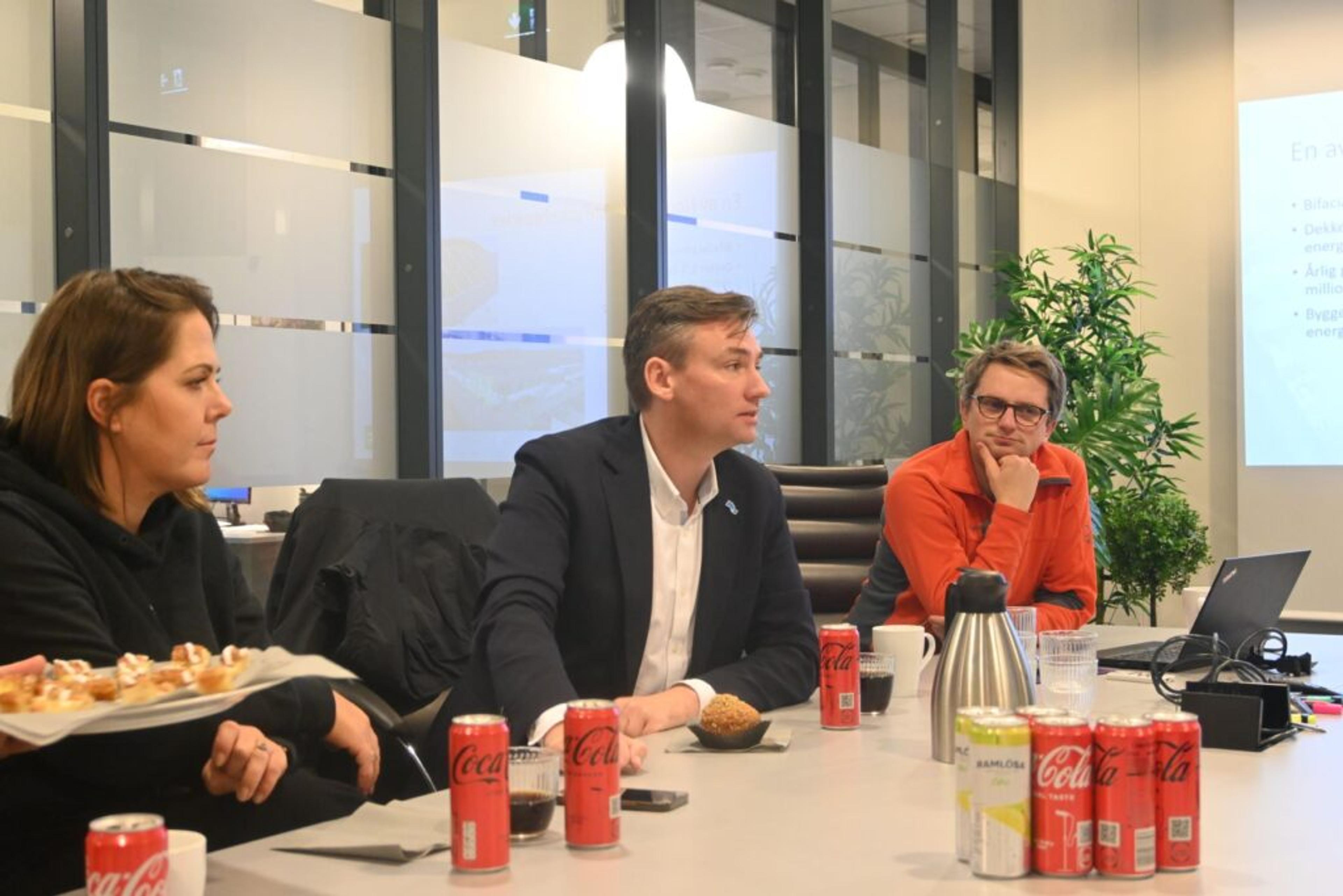 MØTES PÅ MØTEROMMET: Helt til venstre i bildet Anders Aas, daglig leder ved Revac, som forteller om utfordrende tider med skyhøye strømkostnader, til tross for gedigen satsing på solenergi. Foto: Emma Sofie Gulbrandsen, ReAvisa.