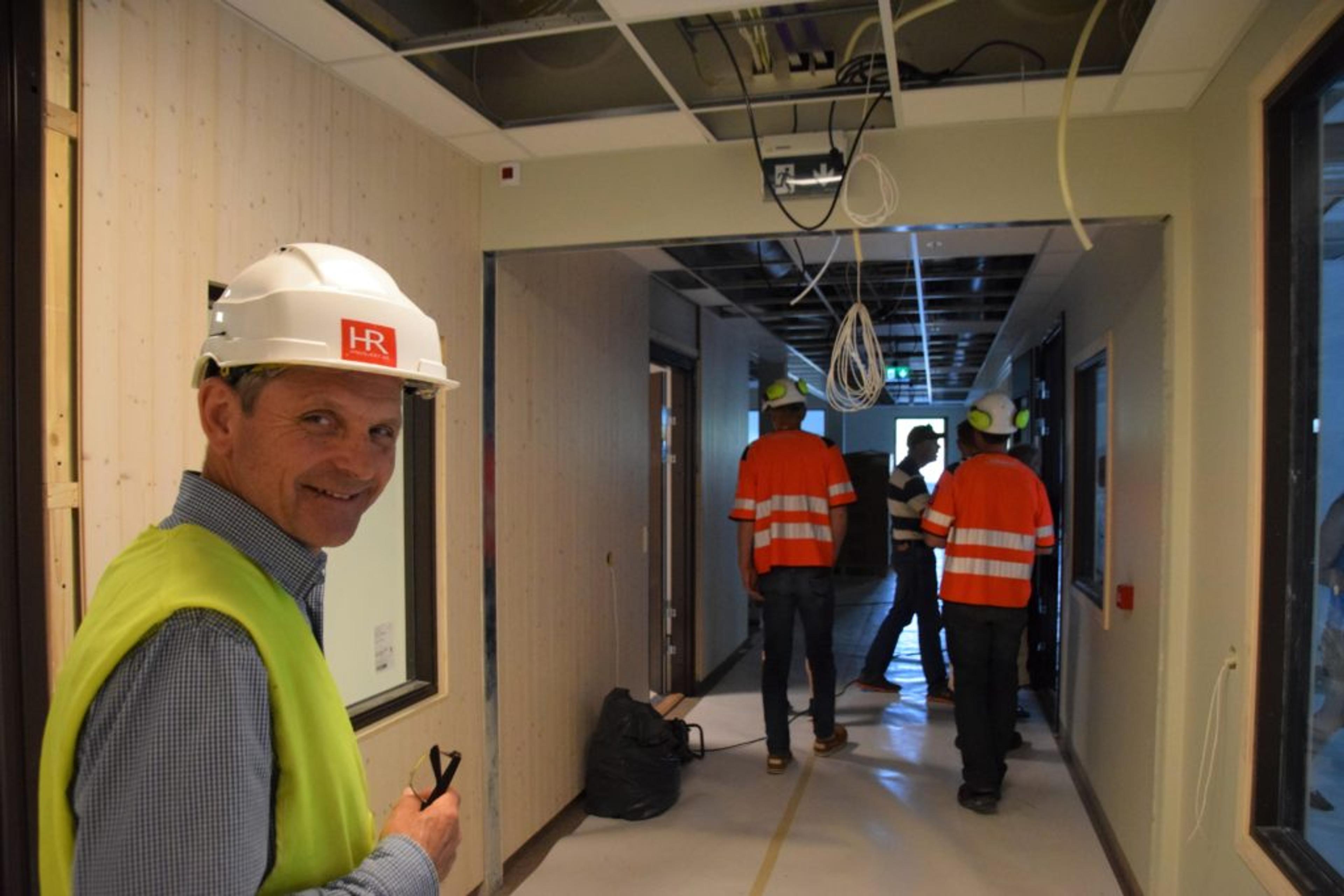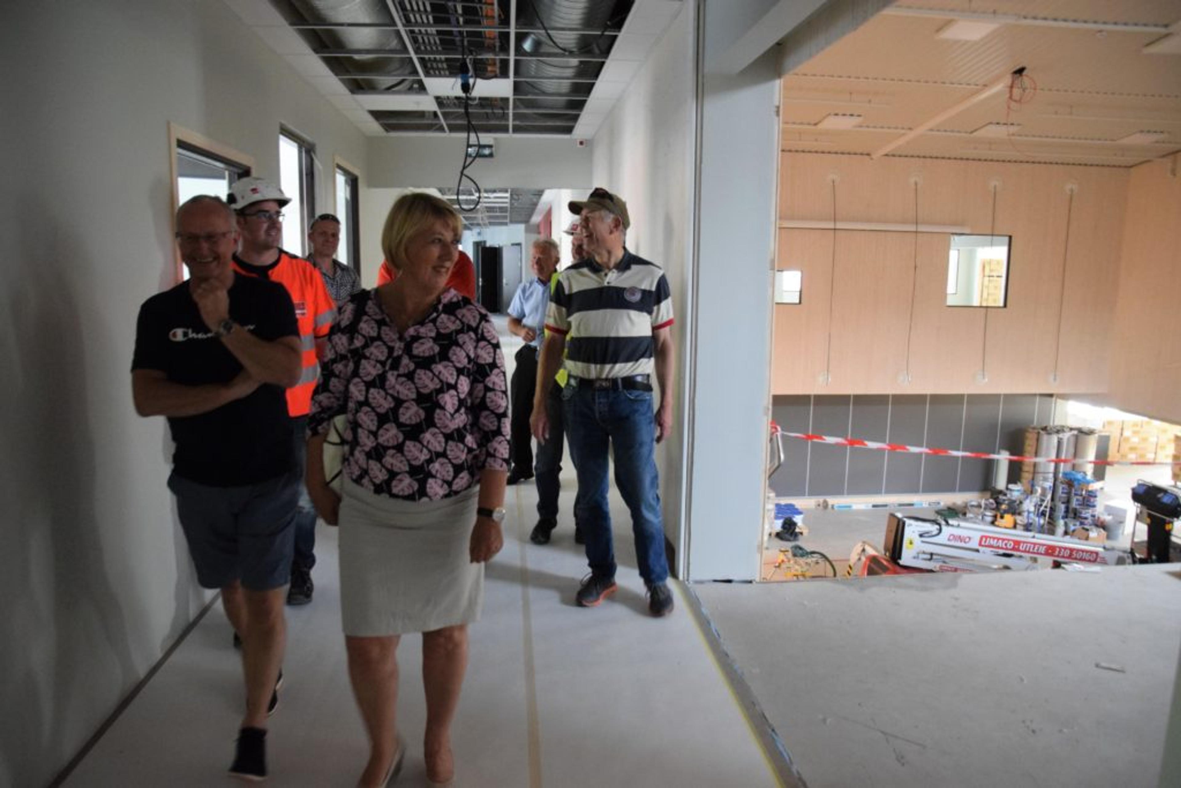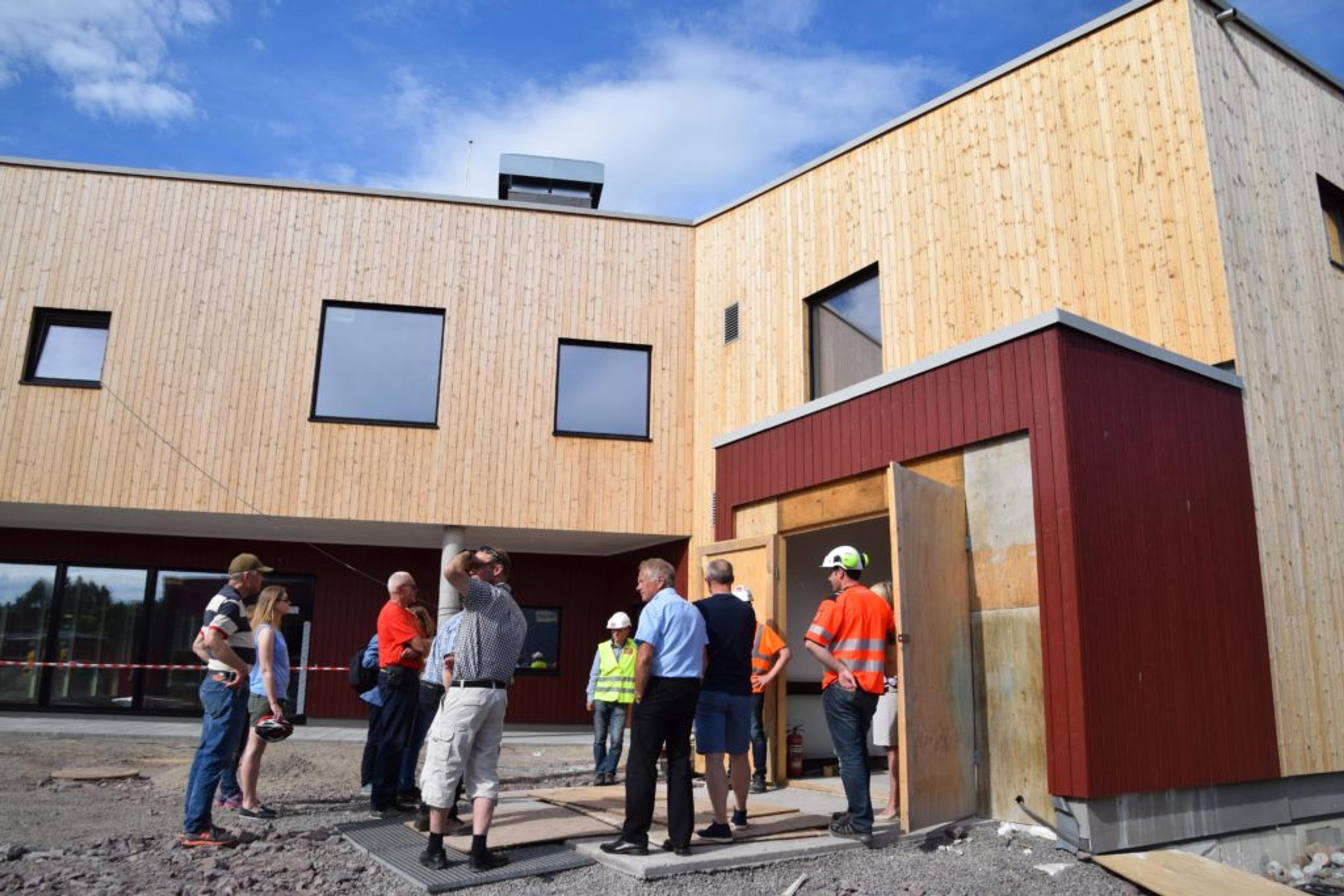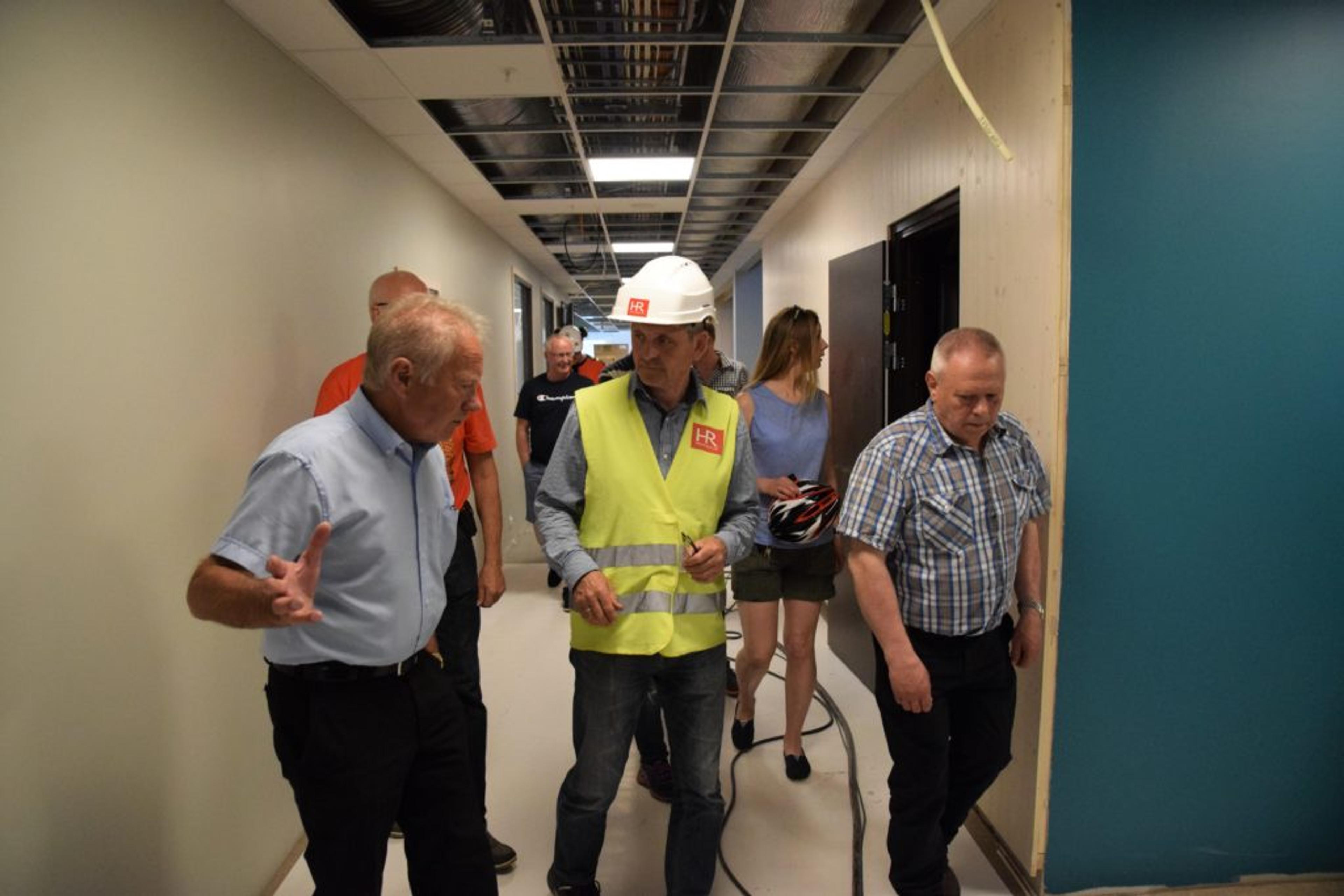 BEFARING: Lokalavisa hang seg på da våre folkevalgte fikk en omvisning på nye Revetal ungdomsskole torsdag 15. juni. Dette blir hovedinngangen for skolen som bygges for å ta i mot opp til 450 elever. Foto: Stian Ormestad.