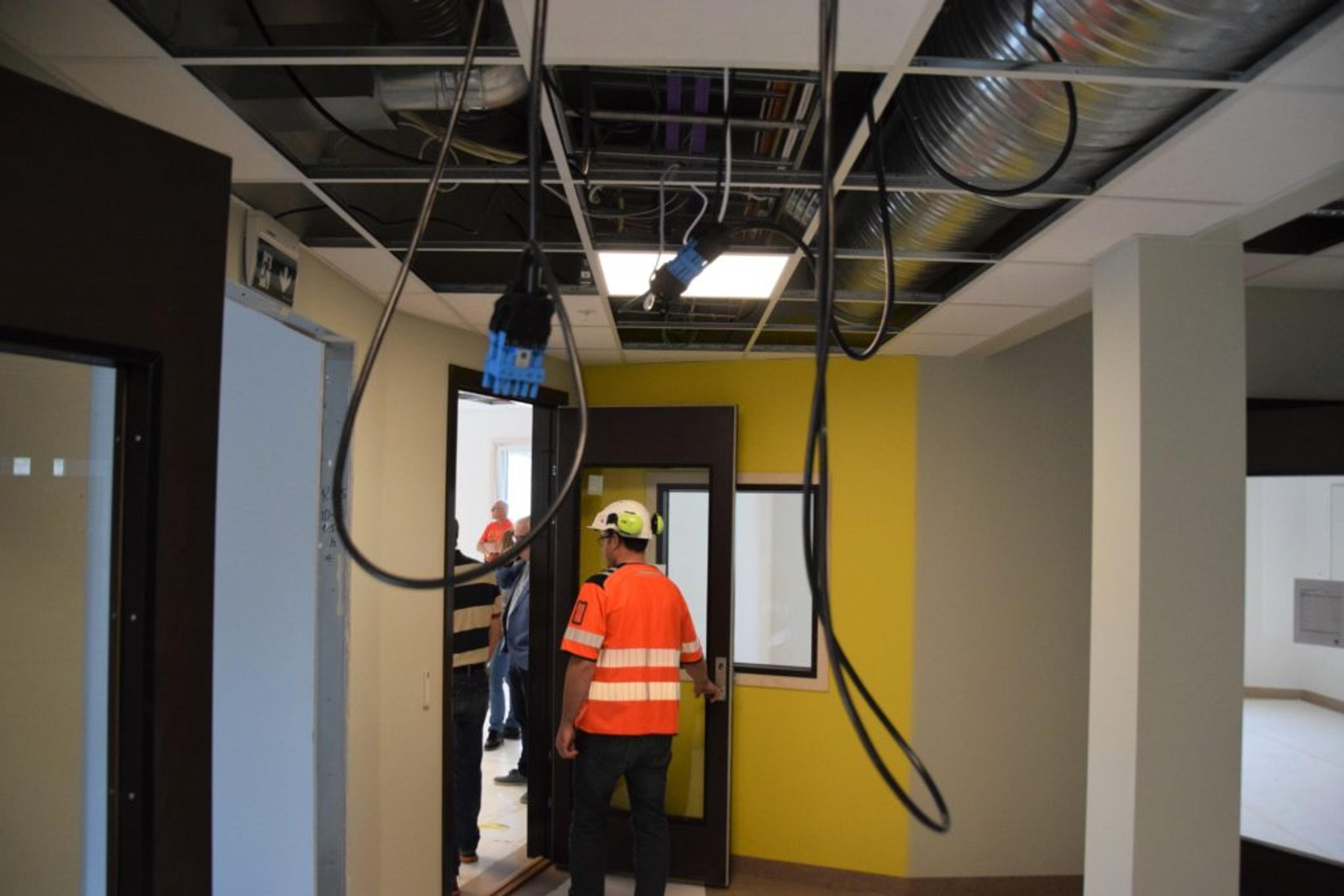HENGER OG DINGLER: Ledninger skal stappes på plass, paneler skal dekke over digre ventilasjonsrød og tekniske koplinger. Det kommer til å skjule seg mye i vegger og tak i den nye skolebygningen. Foto: Stian Ormestad.