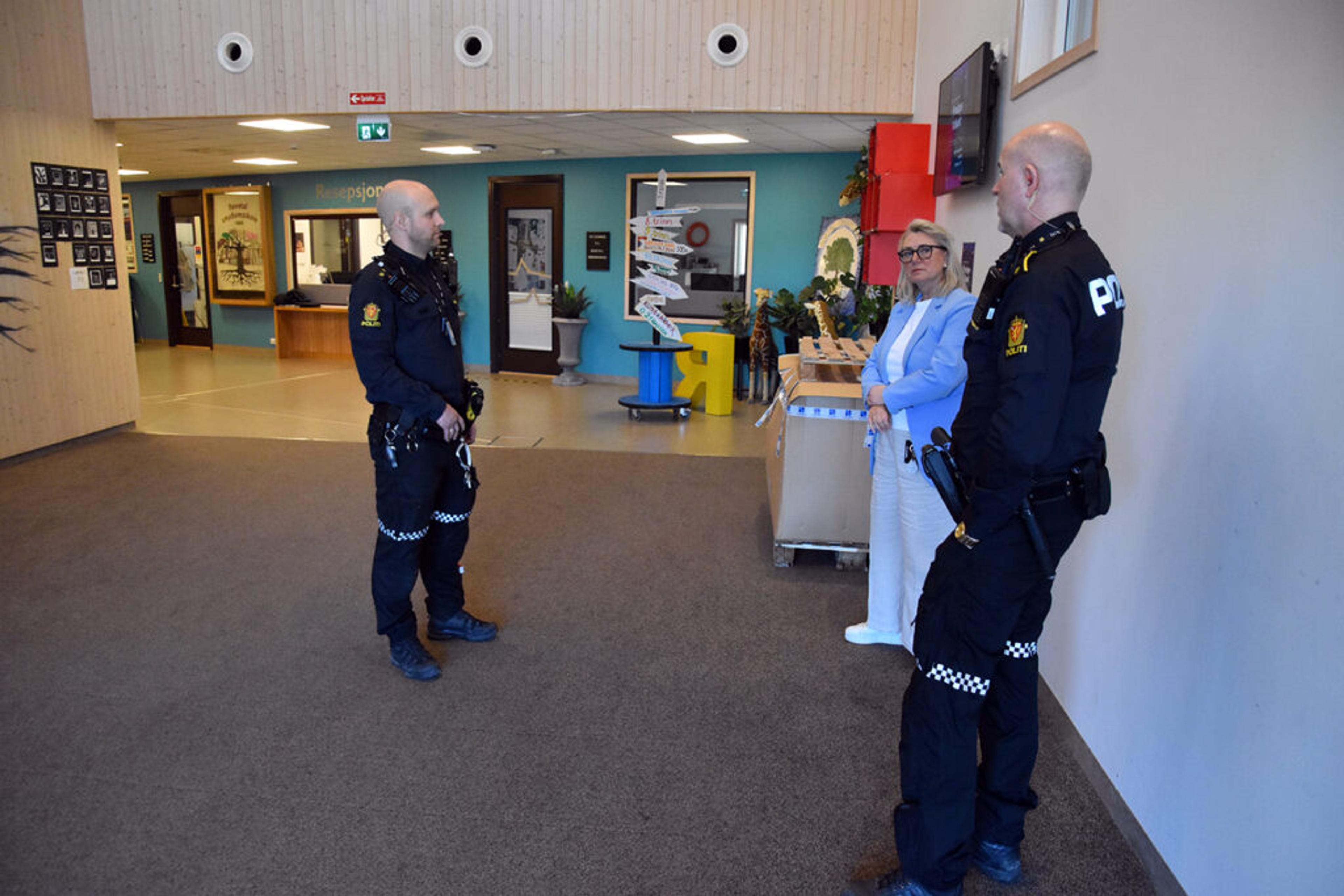 MØTE: Revetal-rektor Mona Elisabeth Larsen og uniformert politi med uniformert patruljebil utafor skolen, mandag morgen 15. april 2024. Foto: Stian Ormestad, ReAvisa.