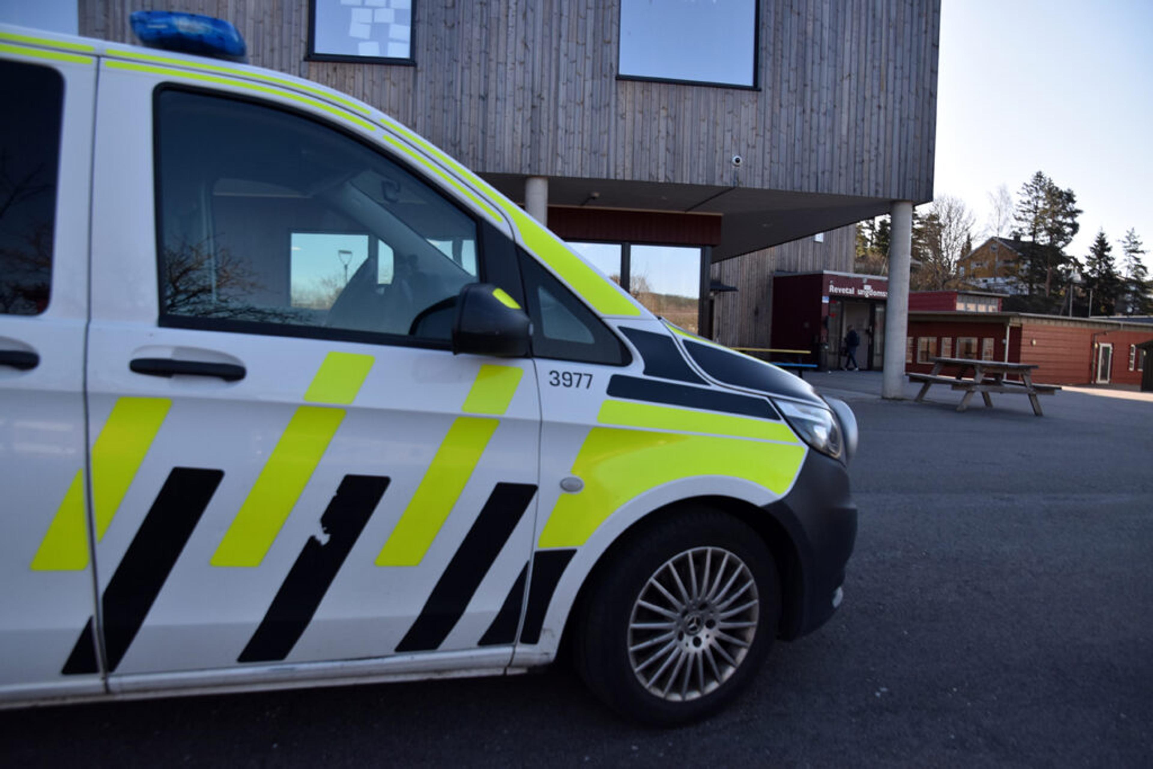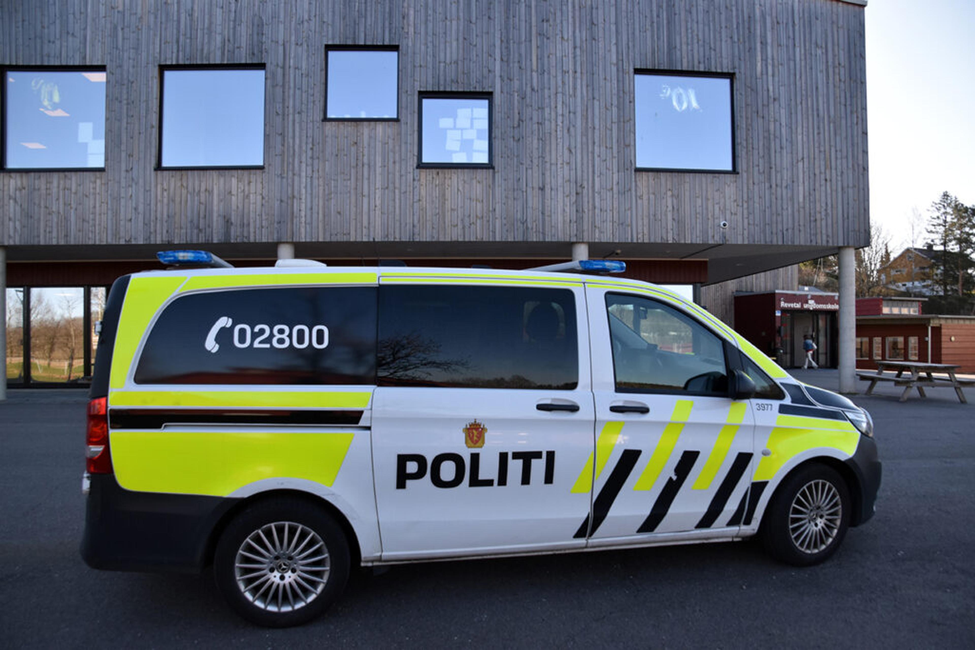 UNIFORMERT PATRULJEBIL: Står parkert utafor Revetal ungdomsskole i dag, mandag 15. april 2024. Foto: Stian Ormestad, ReAvisa.