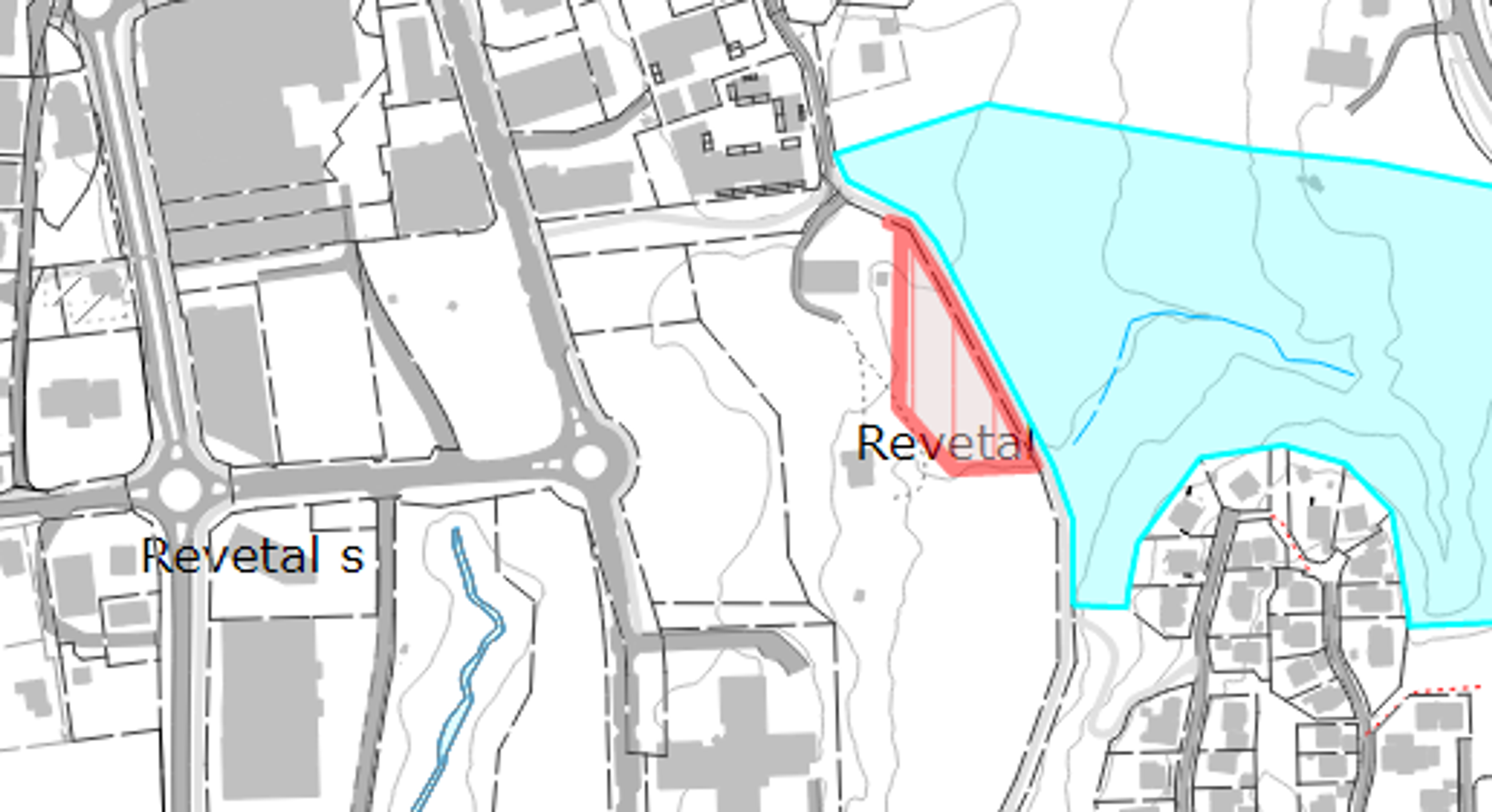 PLANENE TAR FORM: Området der Revetalhagen på 3,3 mål dyrka mark er tenkt markert i rødt.