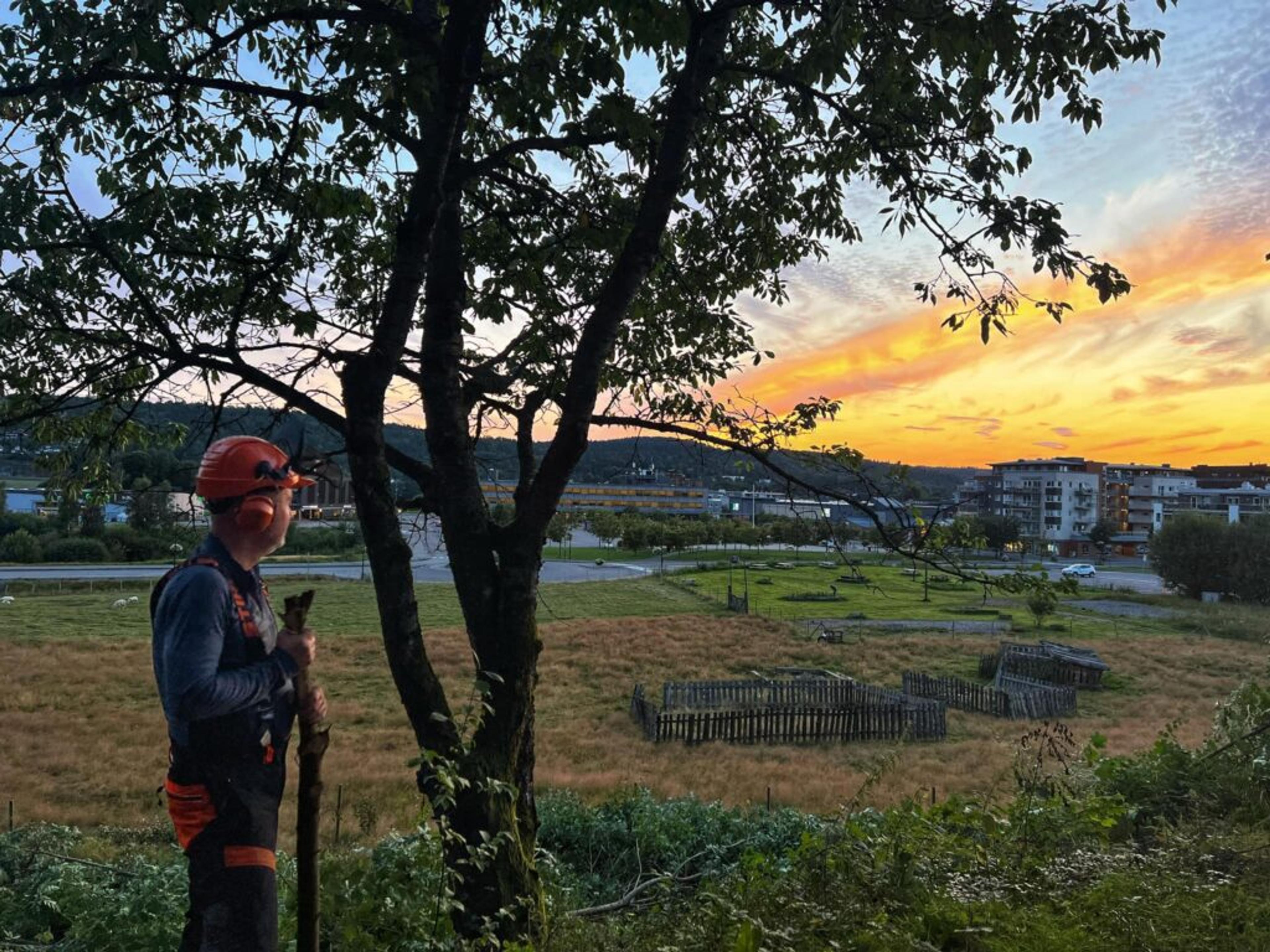 FRIVILLIG: Blant de frivillige på Låhnehuset og i Revetalhagen, er Øyvind Jonassen. Her har han tatt motorsaga fatt for å åpne utsikten både ut og inn til huset. Foto: Revetalhagen.