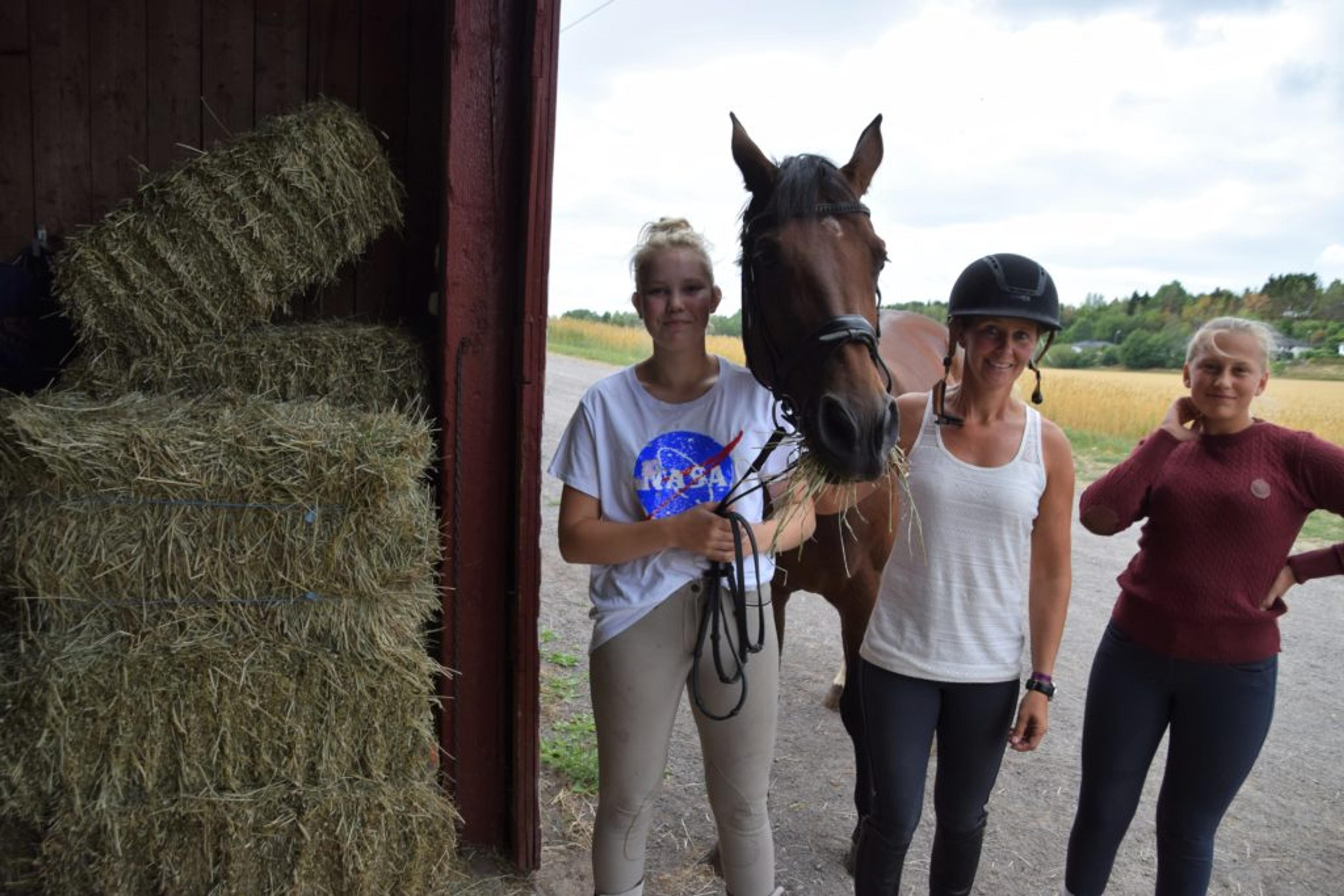 RIDESKOLEELEVER: – Det er kjedelig, men det er jo ikke så mange andre valg, mener Marie Jakobsen (13) og Thea Skaane (15), som begge er rideskoleelever ved Lefsaker gård. Ellen Kristina Hynne (39) lar Rosita (11) får en munnfull med høy. Foto: Stian Ormestad.