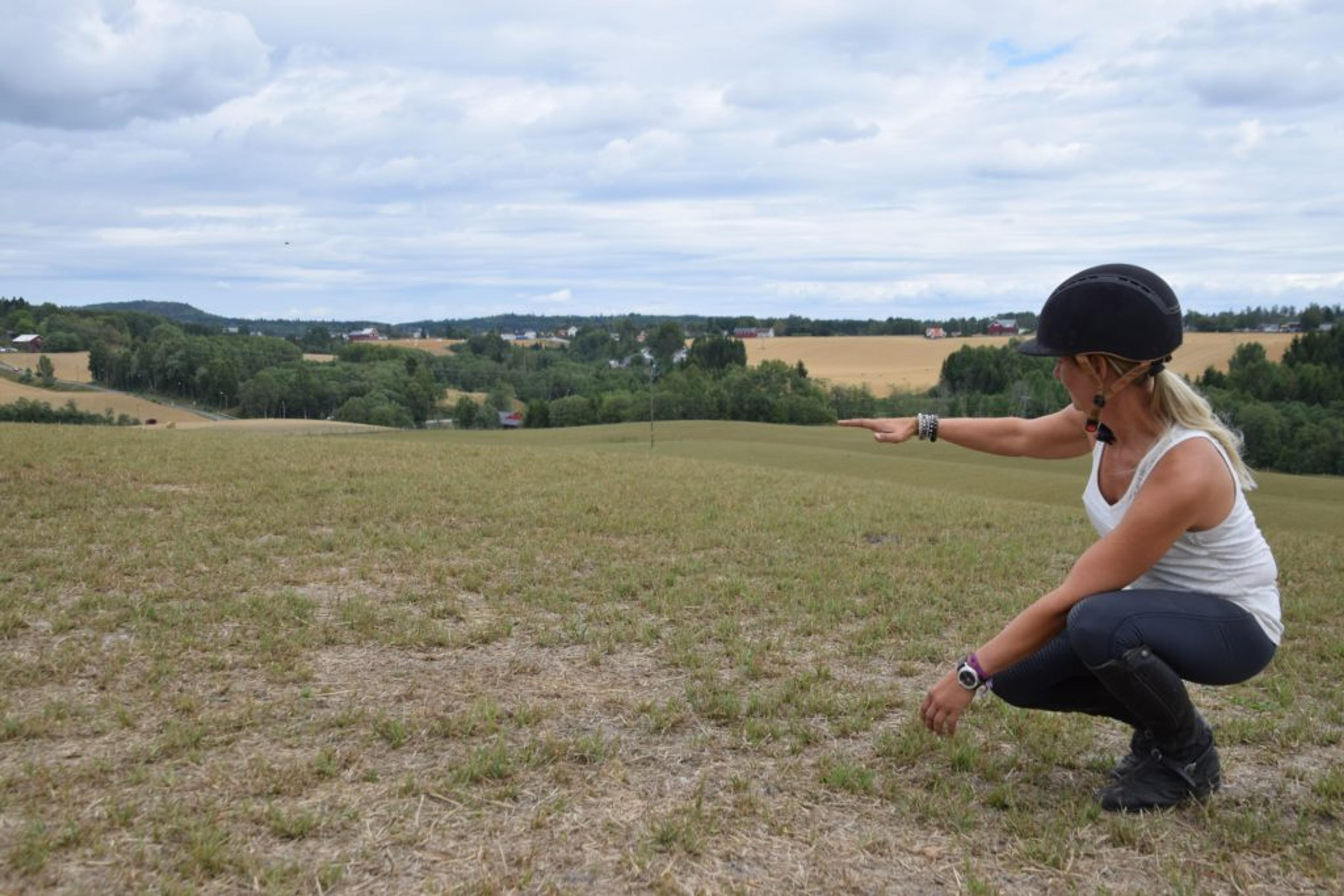 KNUSKTØRT: Ellen Kristina Hynne (39) viser hvor høyt grasset skulle stått nå. Foto: Stian Ormestad.