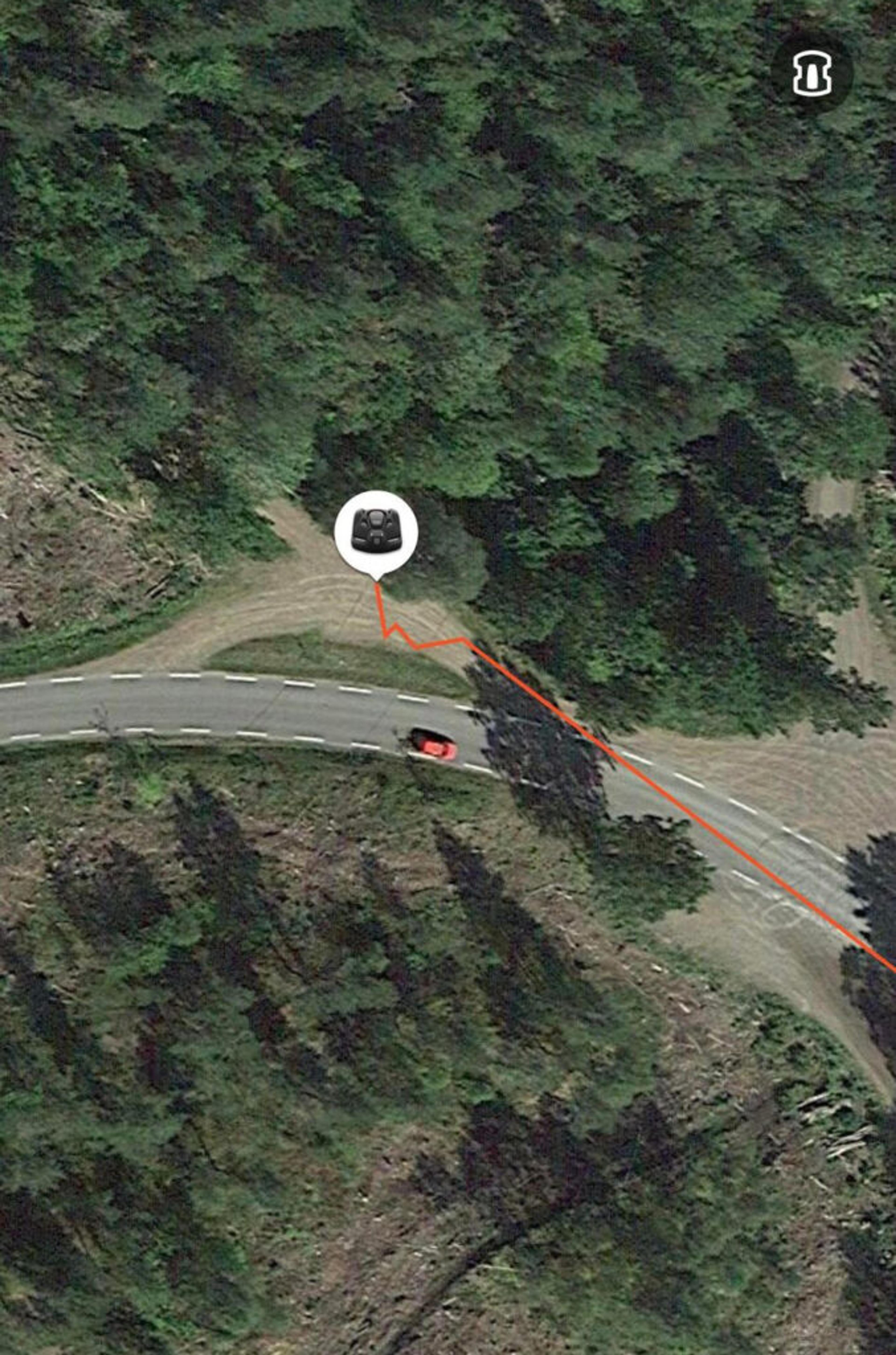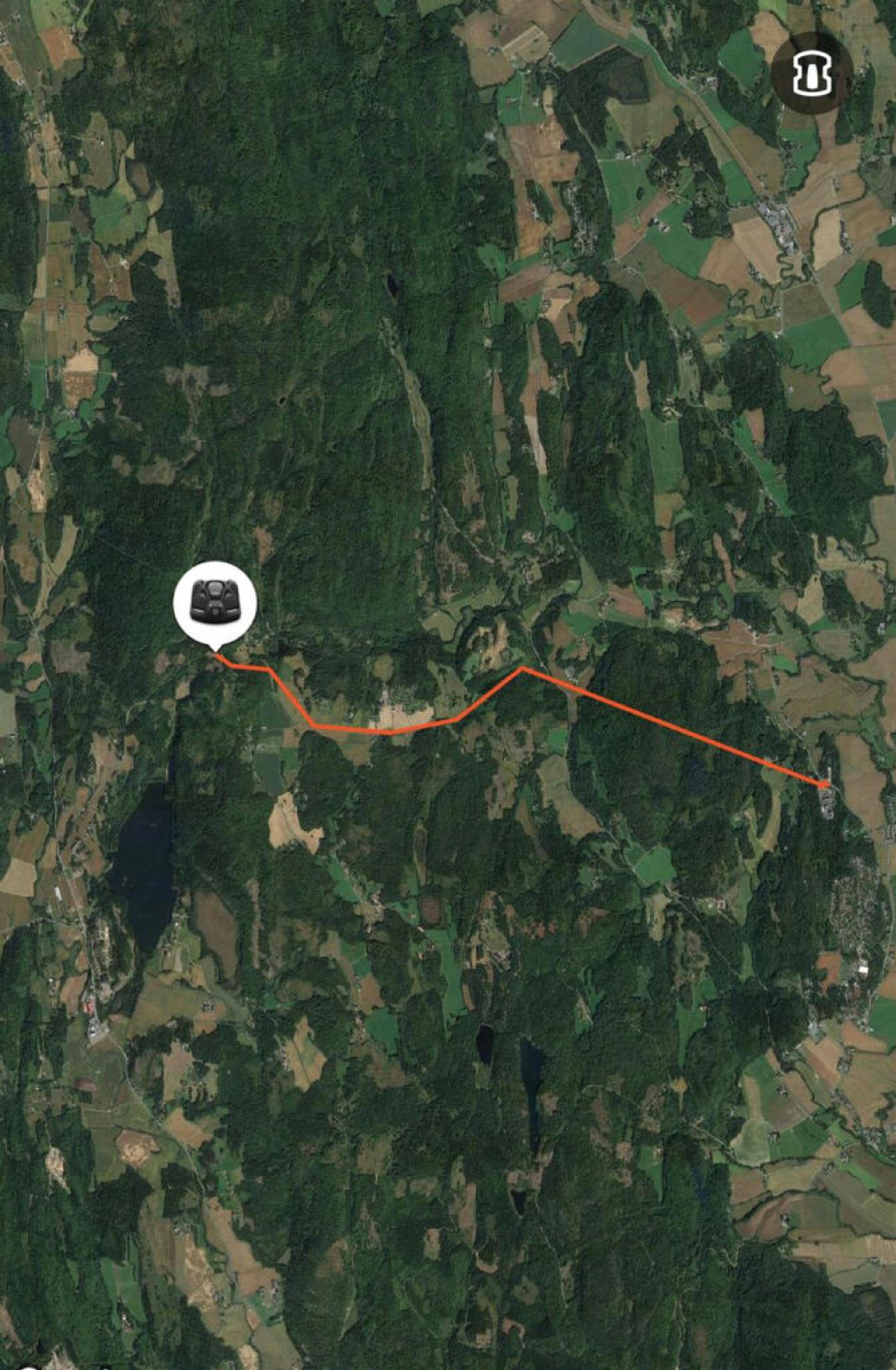 STOPP PÅ KJØNNERØD-TOPP: Robotgrassklipperens rute ved det andre tjuveriet, der tjuvene stoppa på Kjønnerød-toppen for å deaktivere sporingsenheten. Foto: Skjermdump.