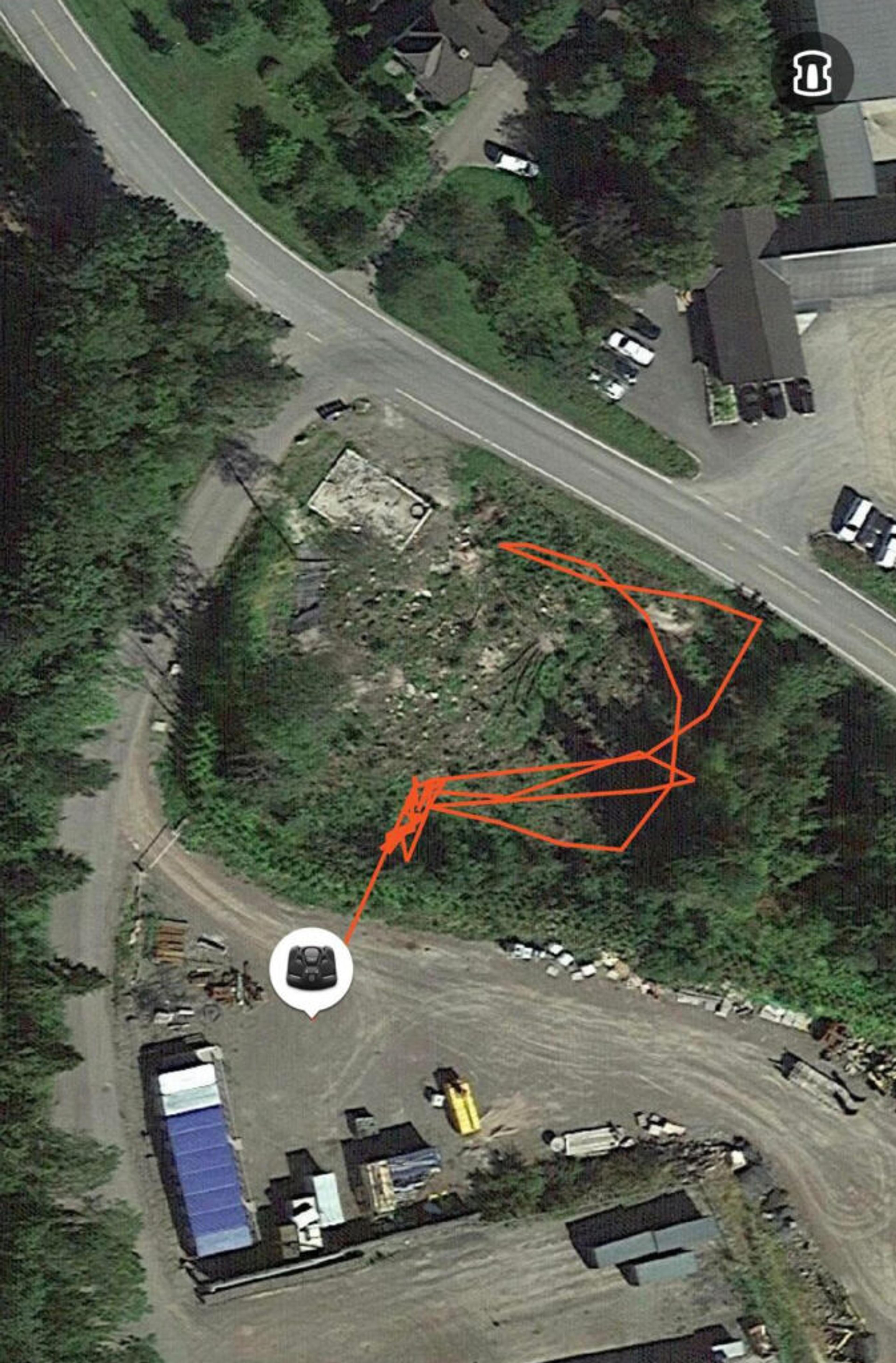 KRUSSEDULL-FLUKTRUTE: Robotgrassklipperens rute ved det første tjuveriet, der tjuvene har deaktivert sporingsenheten mest sannsynlig i en bil bak hekken for Kjell Foss AS. Foto: Skjermdump.