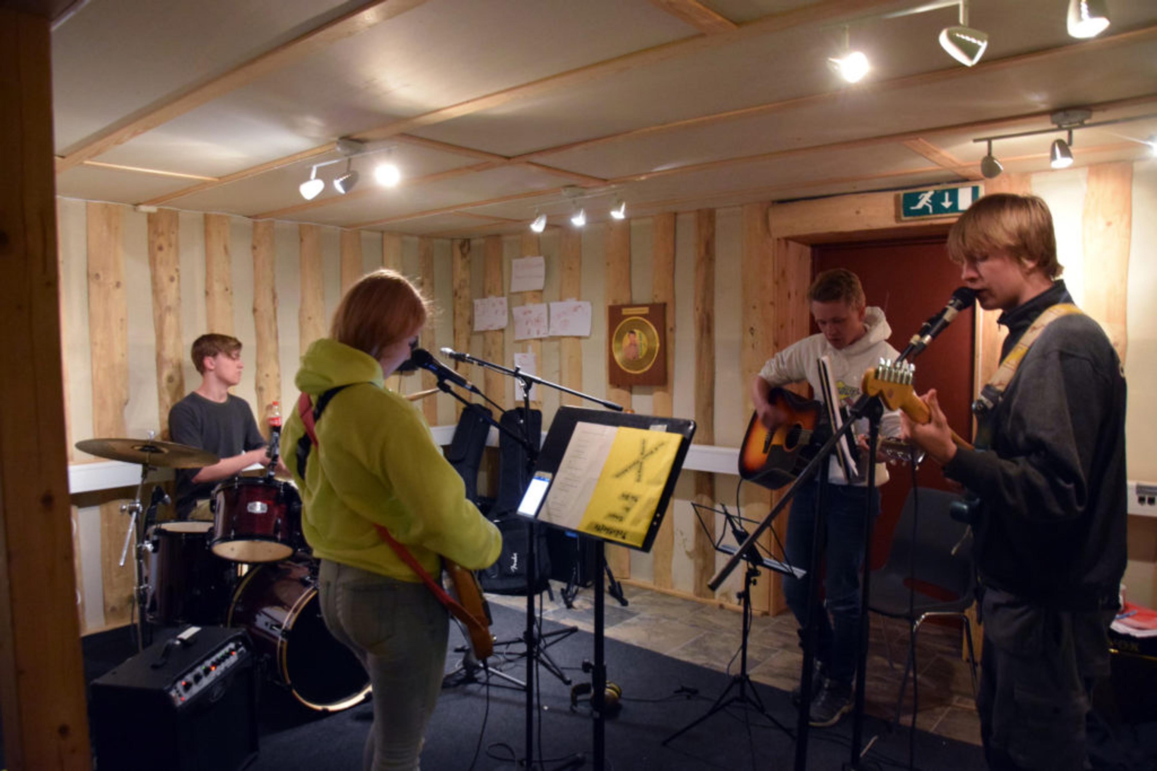 ØVER MYE DENNE UKA: Siste uka før festival-gigg blir det å øve så å si hver kveld i øvingskjelleren på Kulturhuset Elverhøy. Foto: Lykke Amelie Amundsen og Lovis Eggum Wallberg.
