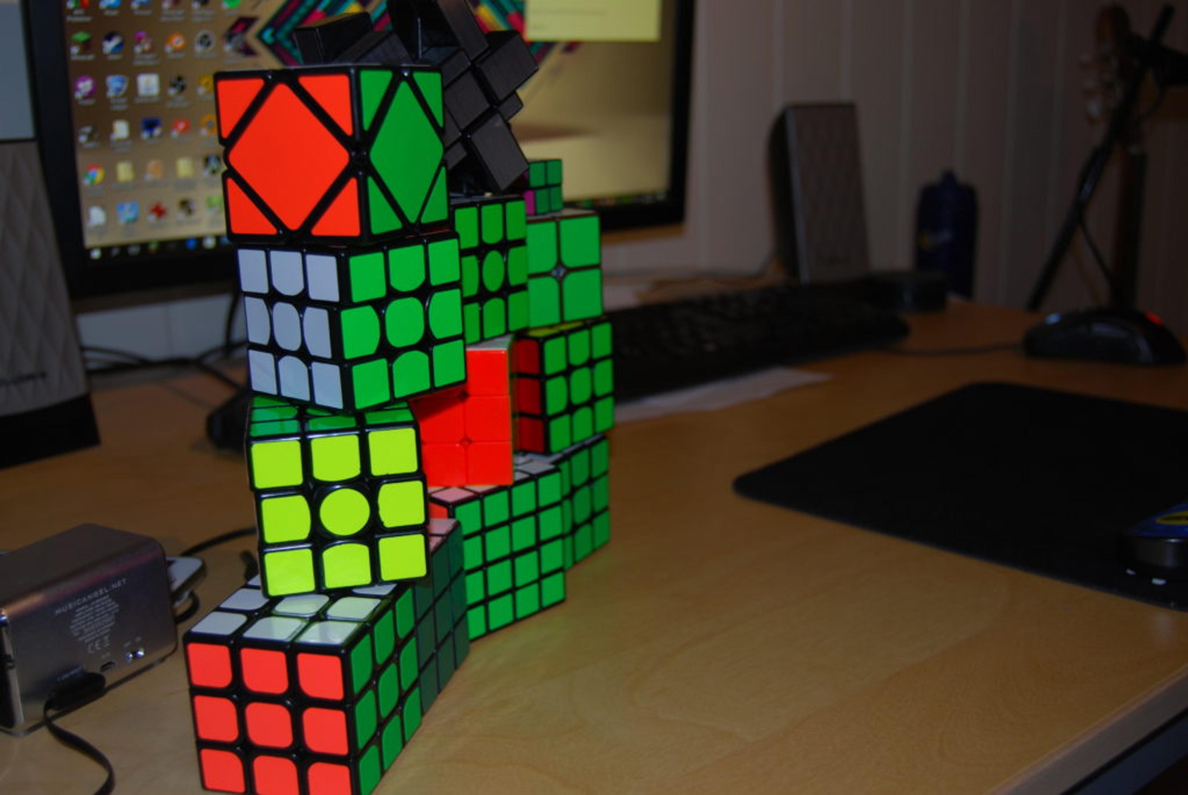 RUBIKS KUBE: Dette er alle kubene til Daniel hjemme i Undrumsdal. Foto: Amalie Andersen.